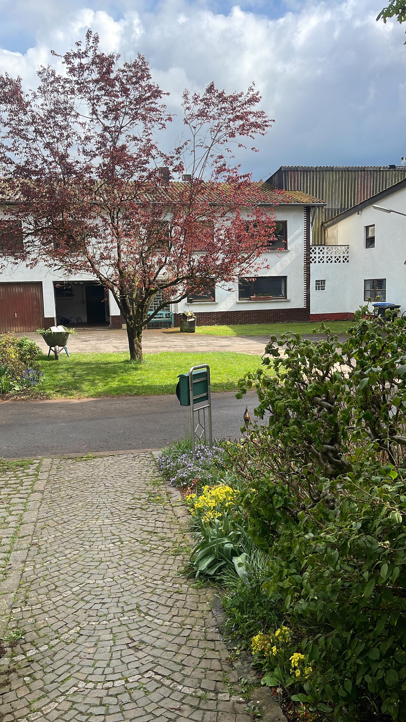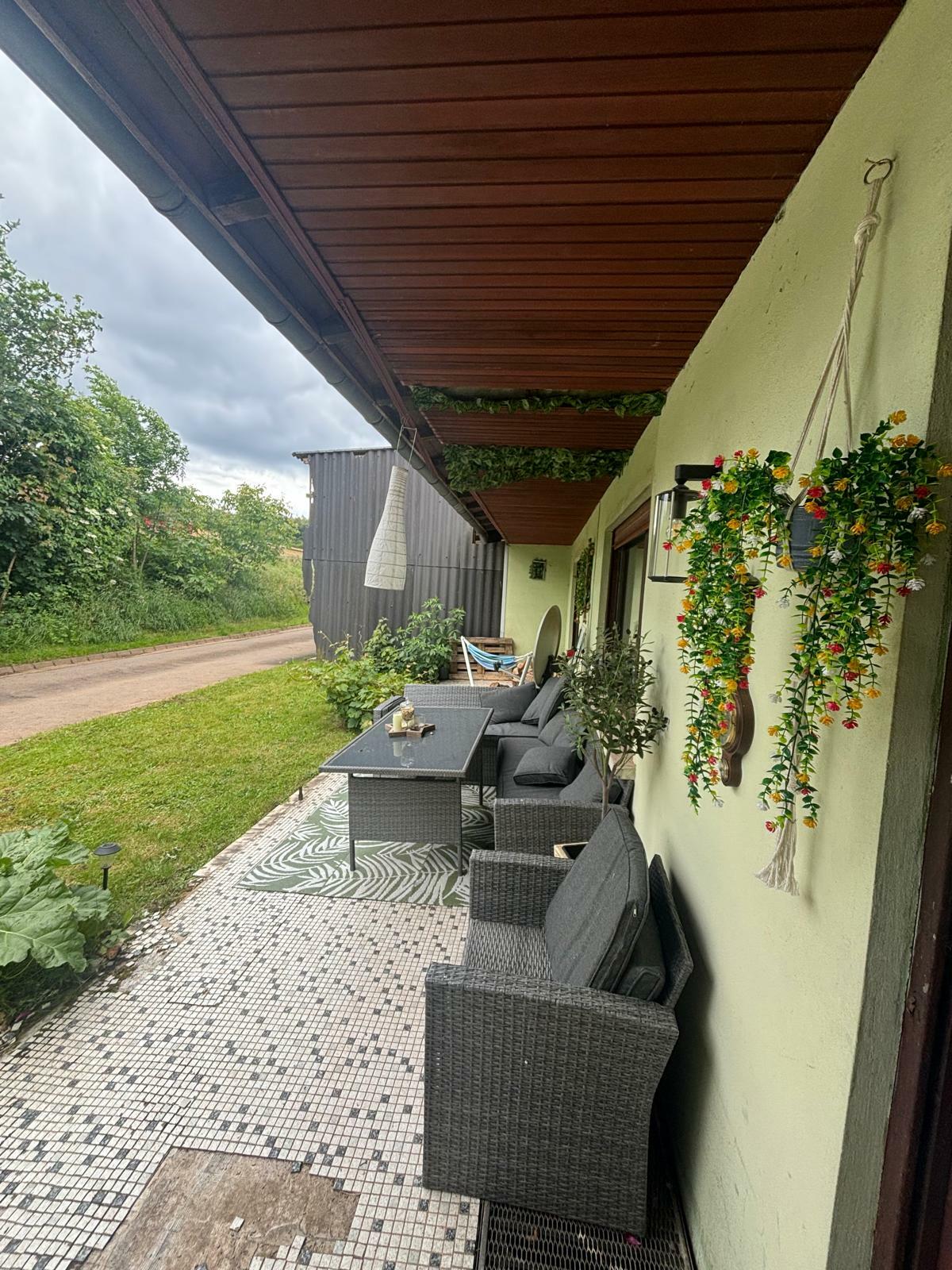 Es befinden sich zwei Häuser auf dem Grundstück mit einem Innenhof, großem Garten und einer u-förmigen Auffahrt. Wir liegen etwas abseits und uneinsehbar vom restlichen Dorf - man kann also komplett ungestört sein. Es gibt genügend Parkmöglichkeiten (sowohl bedacht als auch freistehend). Der komplette Keller (mit Küche und anschließendem Bad) kann als Aufenthaltsraum dienen. Gerne aber auch die Scheune oder Werkstatt.