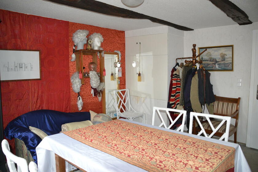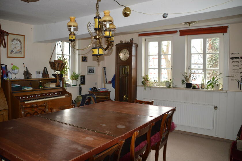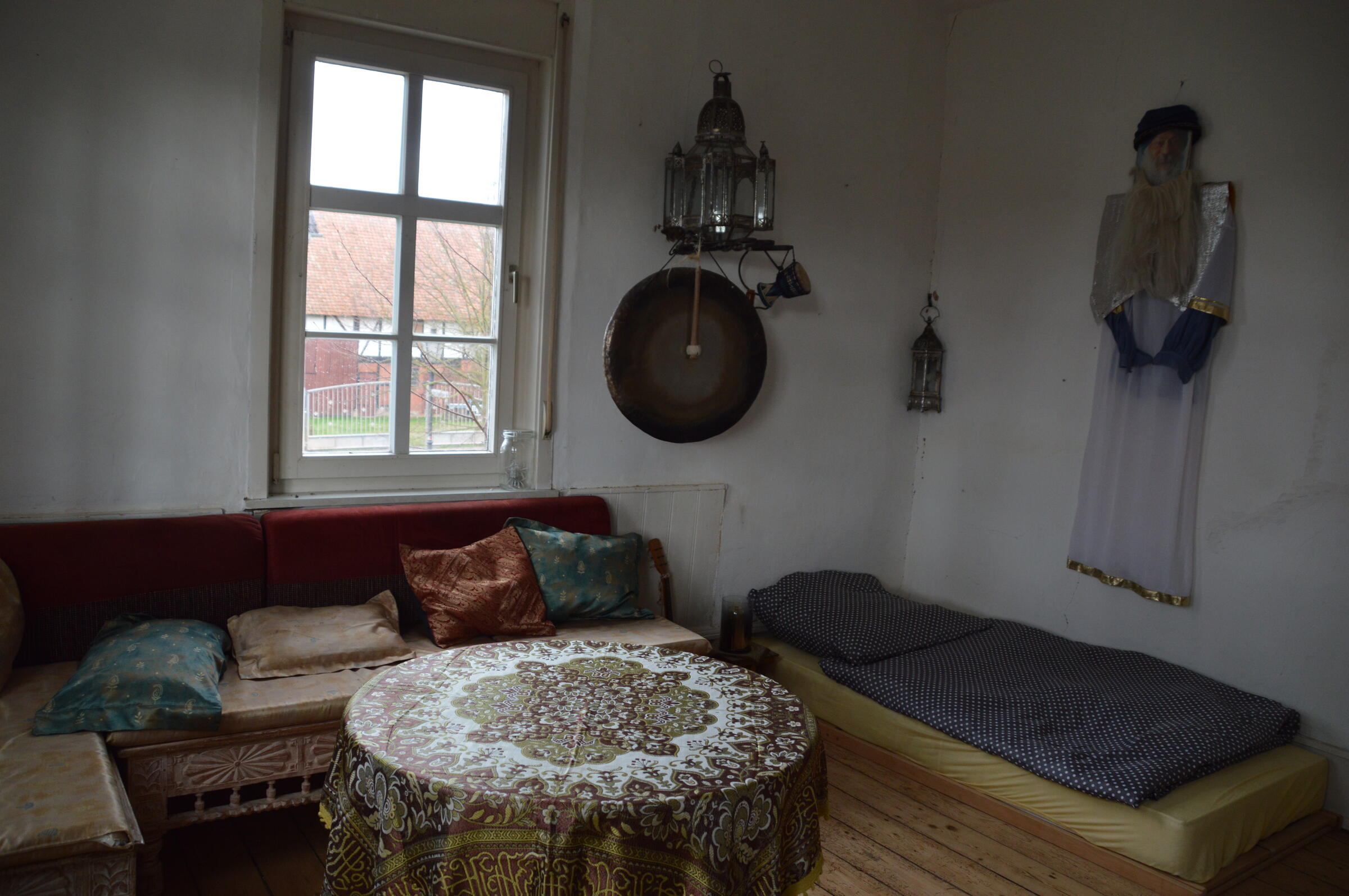 Unser 450 Jahre altes Fachwerkhaus, welches unter Denkmalschutz steht, befindet sich direkt am Historischen Dorfanger der Ortschaft. Die Räume sind thematisch mit historischen Möbeln und Antiquitäten verschiedener Stile und Epochen (Jahrhundertwende, Barock, Orientalisch, Knechtkammer) eingerichtet. In den jeweiligen Räumen hängen als Fundus die passenden Gewandungen verschiedener Größen welche genutzt werden können. In der kleinen Küche gibt es noch alte Wandmalereien. Das Haus ist bestückt mit ca. 40 verschiedenen, teilweise historischen, teilweise exotischen Musikinstrumenten unter anderen: Drehleier, Sister, Mandoline, Balalaika Dudelsäcken, Harmonium, Pferdekopfgeige, Akkordeons, sowie verschiedenen Skurrilitäten. Im Wohnzimmer steht ein Billardtisch, der, wenn nicht bespielt, als Esstisch, umgebaut ist. Im Erdgeschoss befindet sich eine kleine Weinstube (Kleinkunstbühne), die sporadisch in den Sommermonaten genutzt wird. Dort steht ein altes Kneipenklavier. Sofern diese nicht für den Dreh benötigt wird, kann selbige auch für den Teamaufenthalt genutzt werden. Ansonsten stehen aber auch andere Räume als Garderobe etc. zur Verfügung. An Lichtverhältnissen ist von lichtdurchflutet bis schummerig alles vorhanden. Direkt vor dem Haus steht ein Gemeinde Stromkasten wo Drehstrom gezapft werden kann. (Antrag). In unmittelbarer Nähe sind ausreichend Parkplätze vorhanden. In unmittelbarer Nähe vom Haus gibt es einen kleinen See der vom Eigentümer angemietet ist.