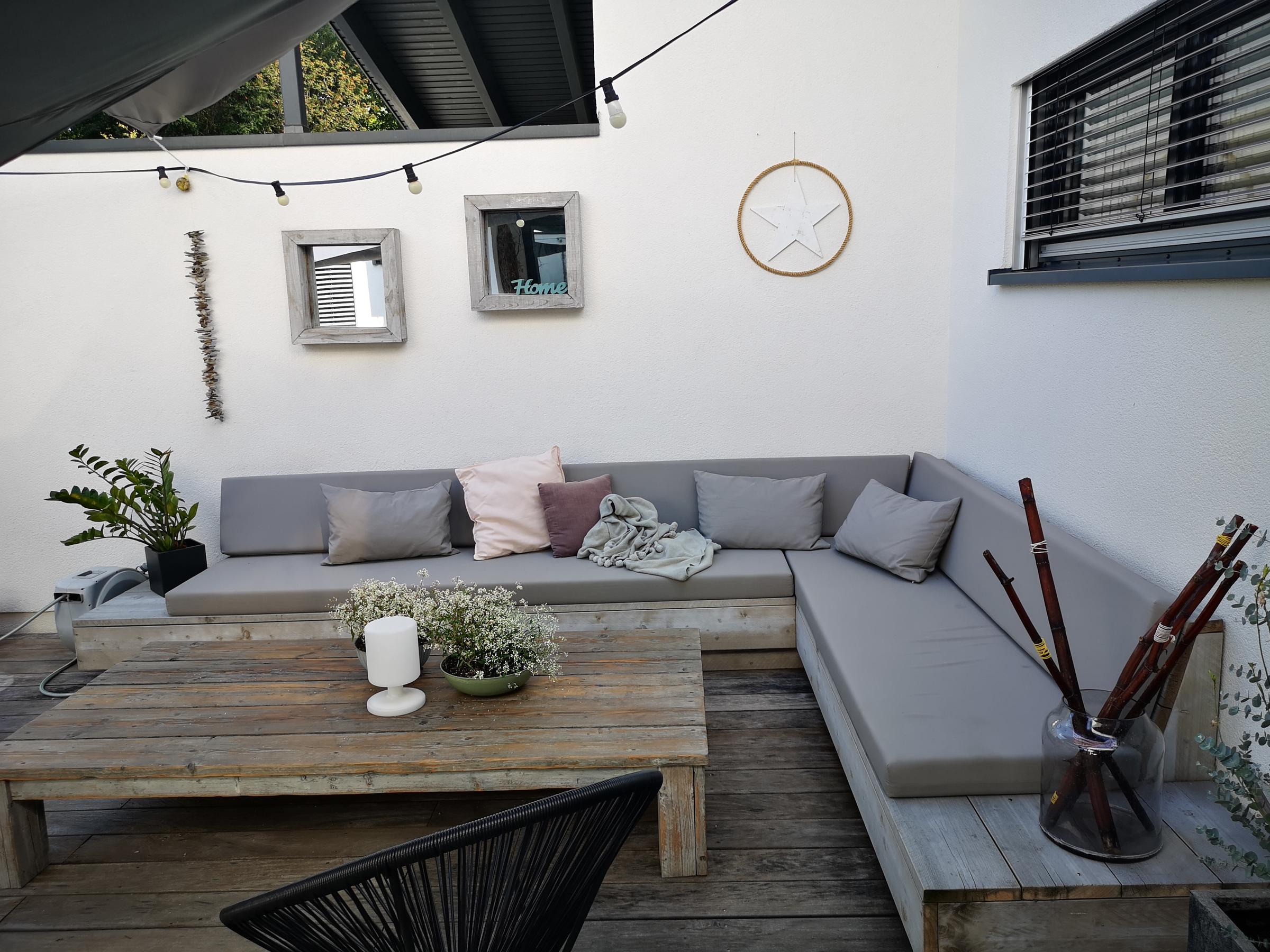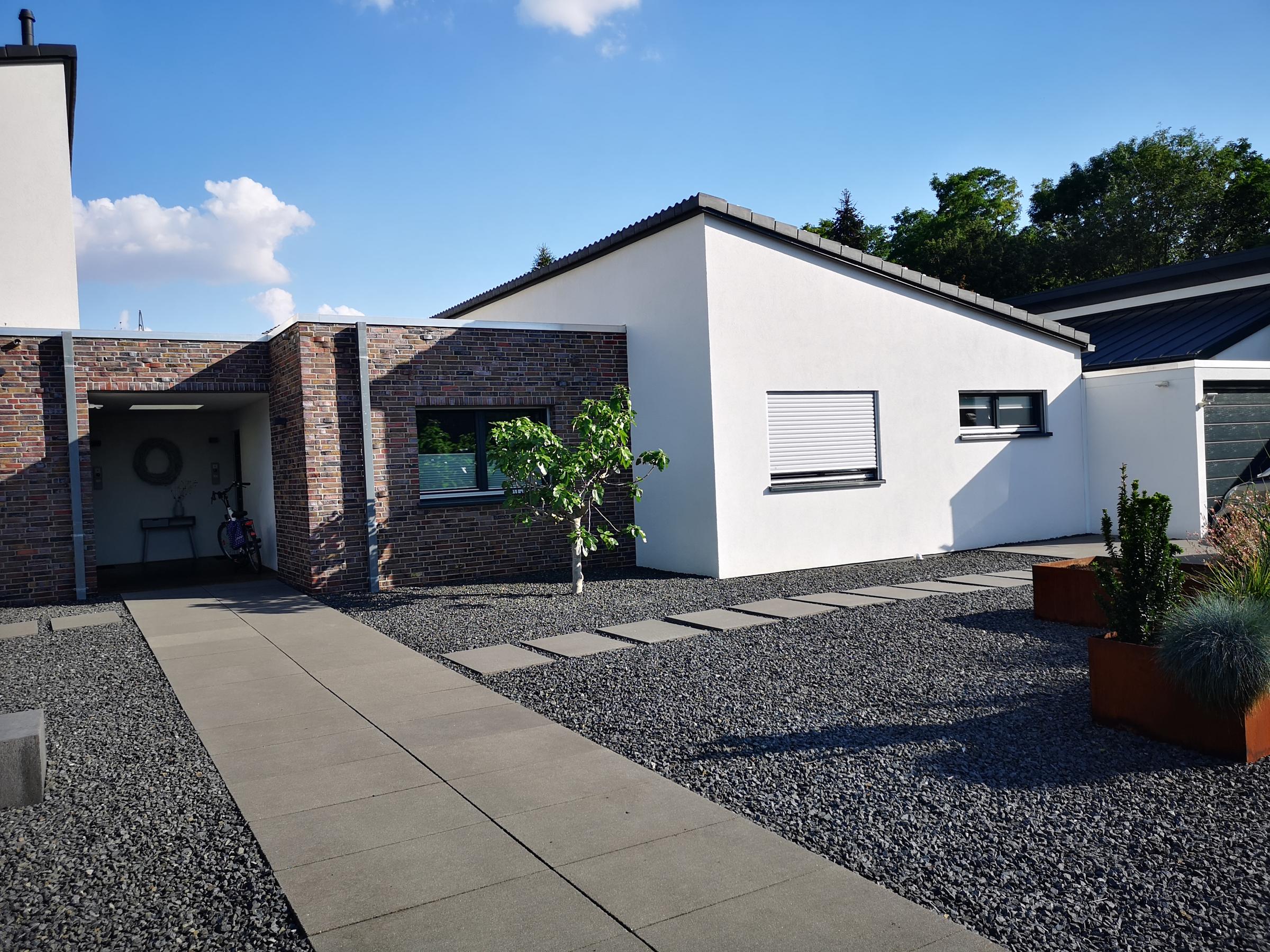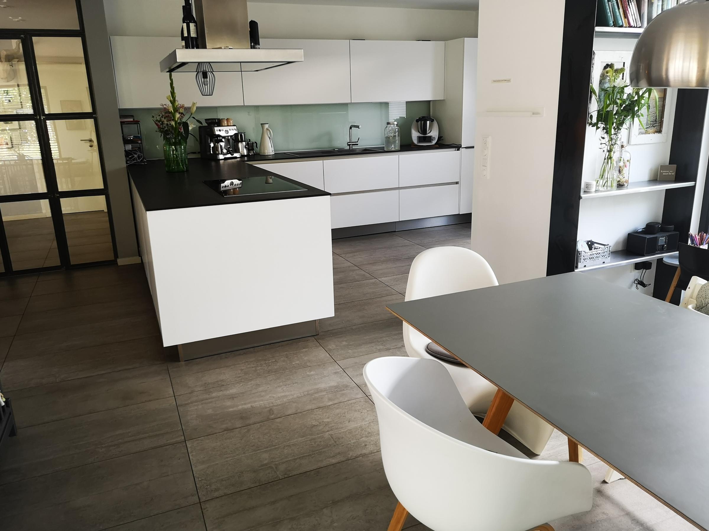 Unser Einfamilienhaus befindet sich in einer ruhigen und gehobenen Umgebung. Die Immobilie mit modernem Charme, besitzt einen kleinen Garten mit großer Terrasse und Schwimmteich, der sich perfekt einfügt. Auf der Terrasse befindet sich eine große Loungeecke sowie ein Essbereich. Das Erdgeschoss ist offen gehalten und verfügt über viel Licht und eine große, offene SieMatic Küche. Bei Bedarf kann der Milchglasspritzschutz farblich beleuchtet werden.