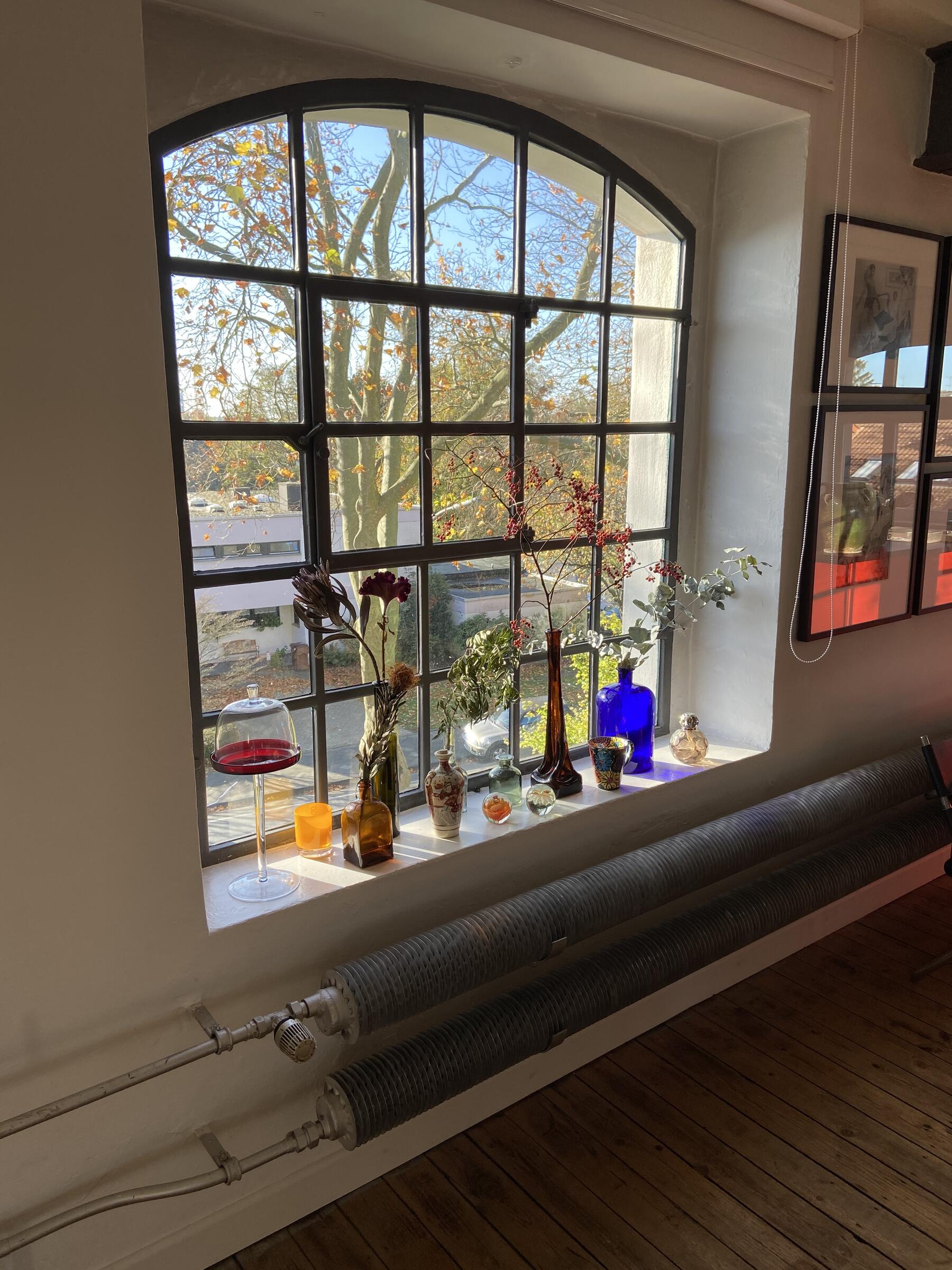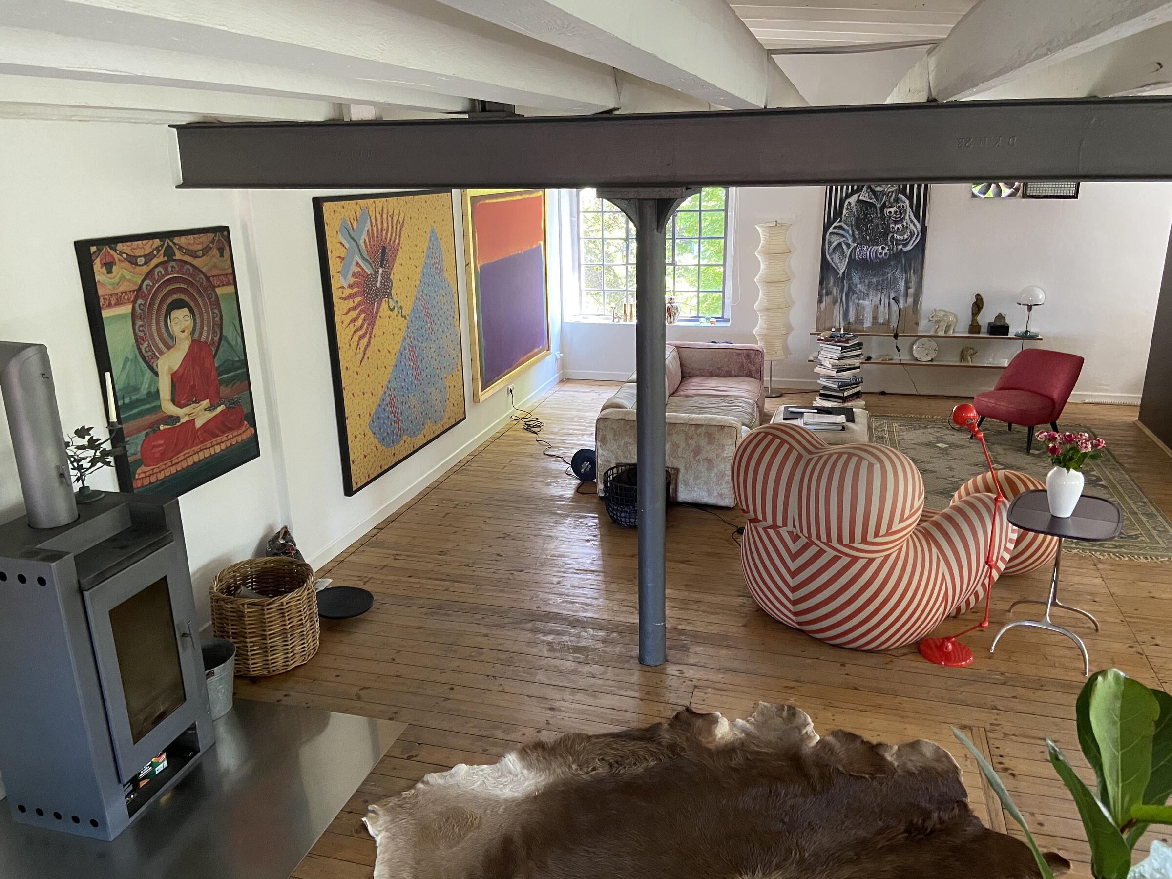 Das Loft befindet sich in einer historischen, denkmalgeschützten ehemaligen Seidenweberei aus dem Jahr 1860. Es besitzt große einfach verglaste Eisensprossenfenster, die dem Loft seinen ganz besonderen Flair eines antiken Industriegebäudes verleihen. Im Innenbereich tragen Zwei Eisensäulen und eine gemauerte Säule zum Flair eines industriell Looks bei. Der naturbelassene Dielenboden hat seinen eigenen Charm und lebt durch die "Gebrauchsspuren" vieler Jahrzehnte. Die Wände sind weiß gestrichen und mit etlichen großen Kunstwerken bestückt. Die Bildergalerie ist ausschließlich mit Aktgemälden und diversen Kunstobjekten dekoriert. Die Holzdecke ist weiß gestrichen. Es befindet sich ein dänischer Holzofen im Raum. An der 3. Eisensäule führt eine Wendeltreppe auf die Dachterrasse.