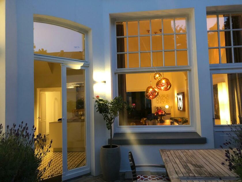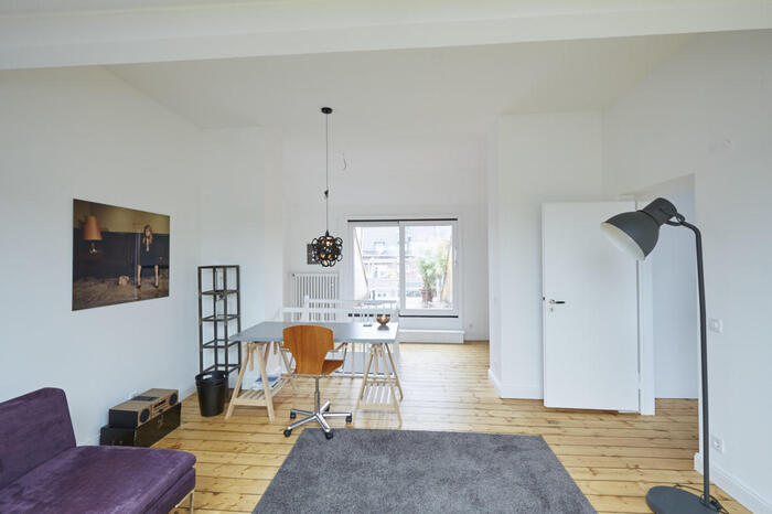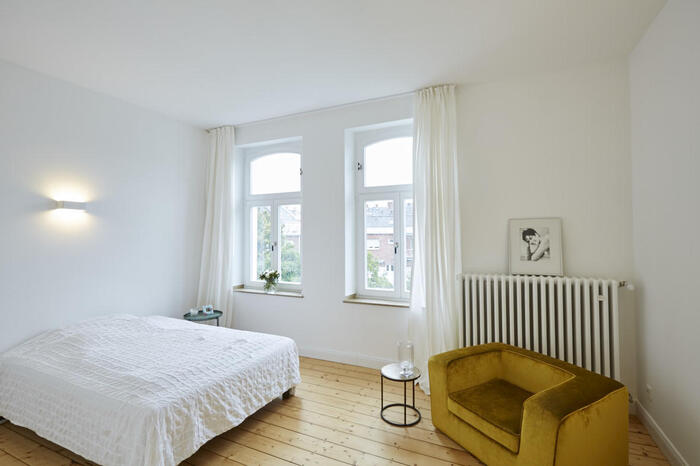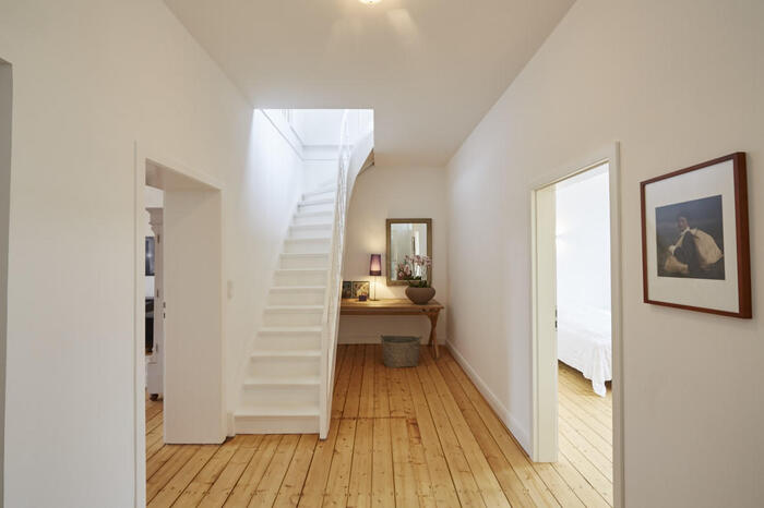 In der 2. und 3. Etage wurde der alte Holzdielenboden freigelegt, geschliffen und geölt. Alle Räume sind sehr hell. Lediglich der mittlere Raum im Erdgeschoss erhält aufgrund der Architektur kein direktes Sonnenlicht. Alle Fenster des Hauses sind neu und stilechte Holzfenster. Alle Wände wurden glatt verputzt und weiß gestrichen.