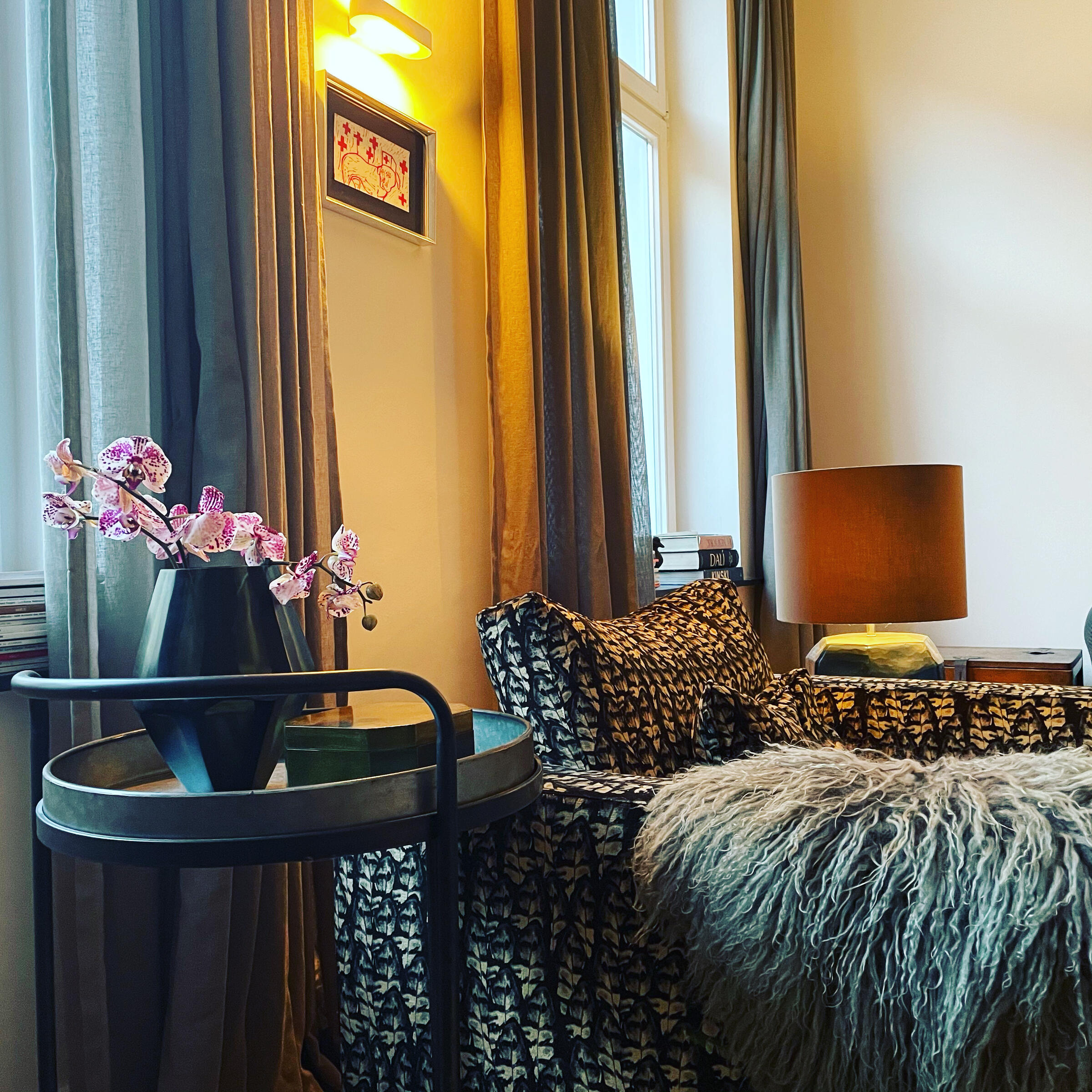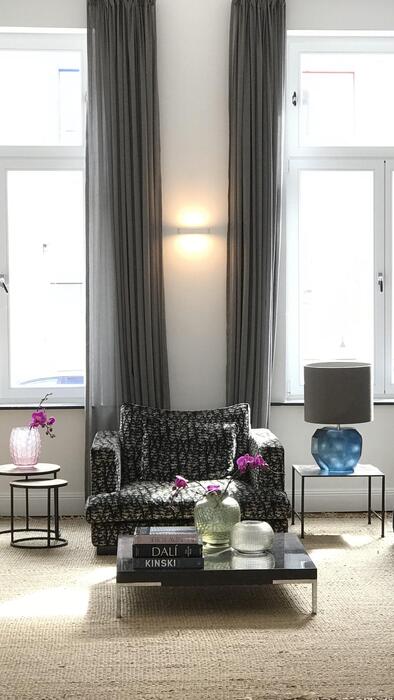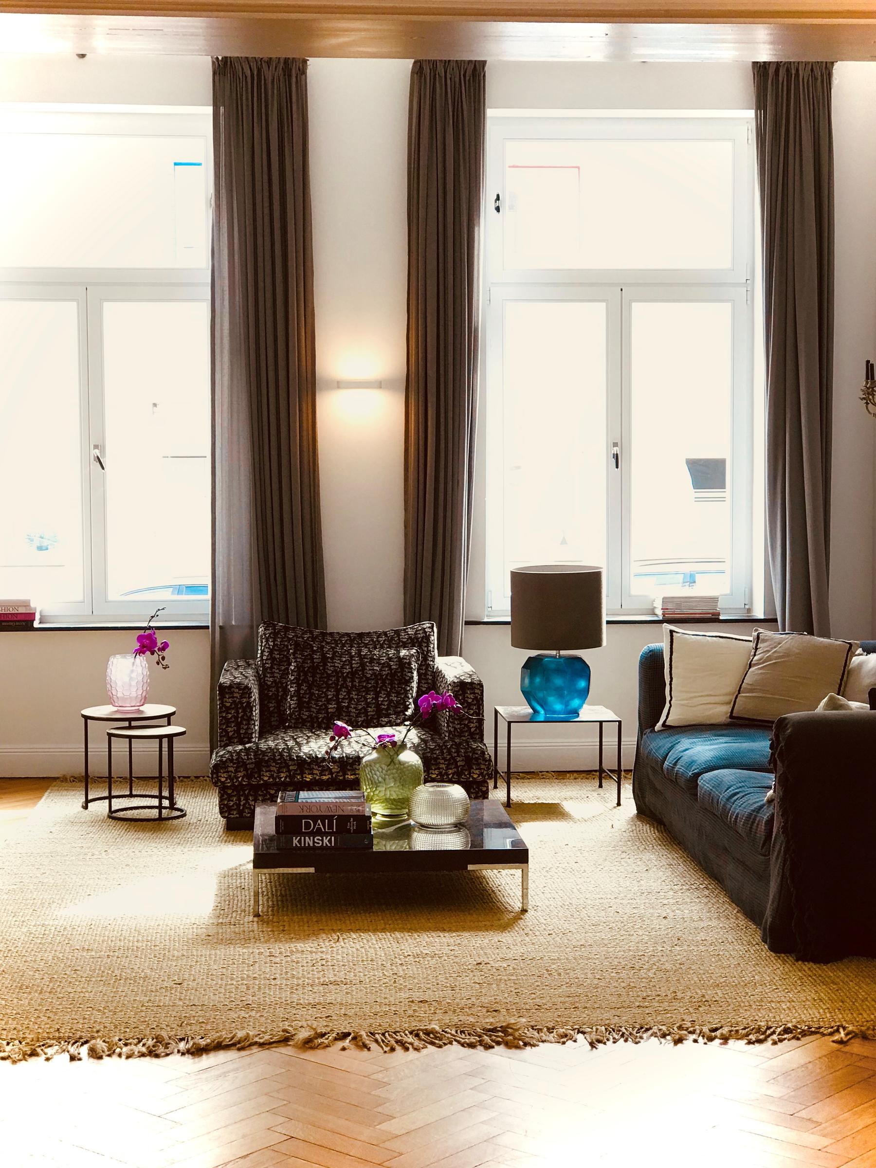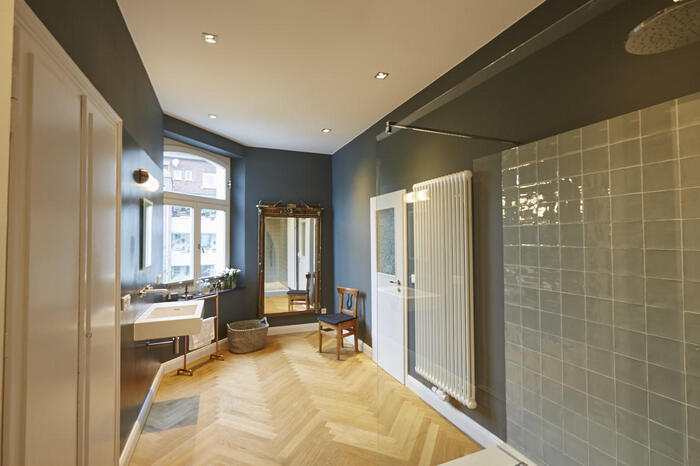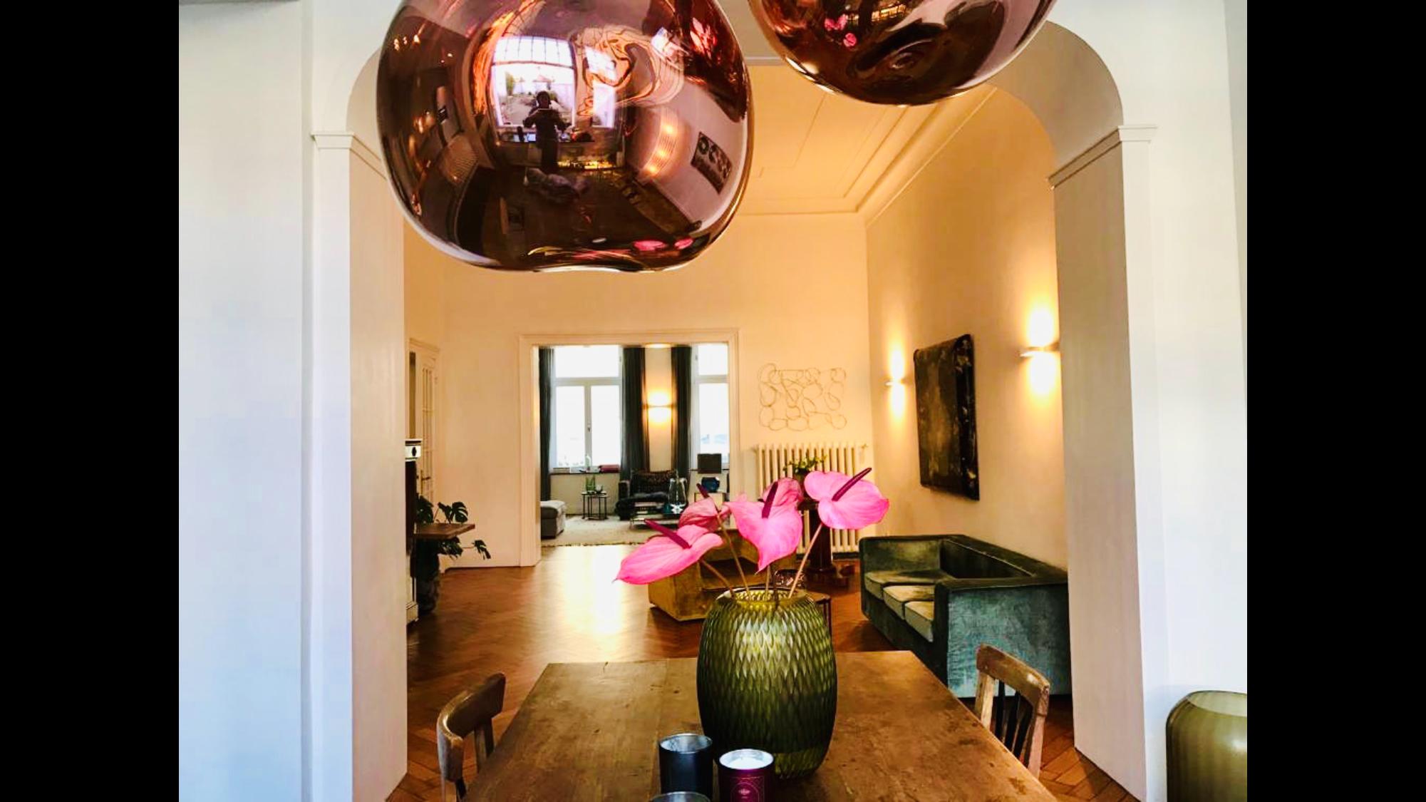 Das Gründerzeithaus verfügt über 4 m hohe Decken im Erdgeschoss und im 1. OG. Die untere Etage erstreckt sich in einer Fläche von 18 m Länge und 5 m Breite über drei miteinander verbundene offene Räume. Daran schließt sich L-förmig zusätzlich die offene Küche mit weiteren 35 m³. D.h. im EG stehen 125 m³ durchgehende Fläche mit 4 m Deckenhöhe zur Verfügung. Ideale Bedingungen, um Motive aus Entfernung oder von oben aufzunehmen oder zu filmen. Die sehr präsenten Tom Dixon Lampen im Esszimmer können bei Bedarf höher oder ganz abgehängt werden. Die 11 m lange Eingangshalle wirkt sehr imposant, ebenso das Treppenhaus. Das Haus wurde von 2016-2017 aufwändig kernsaniert. In allen Räumen des Erdgeschosses und der 1. Etage liegt Fischgrätparkettboden, auch im großen der beiden Bäder.