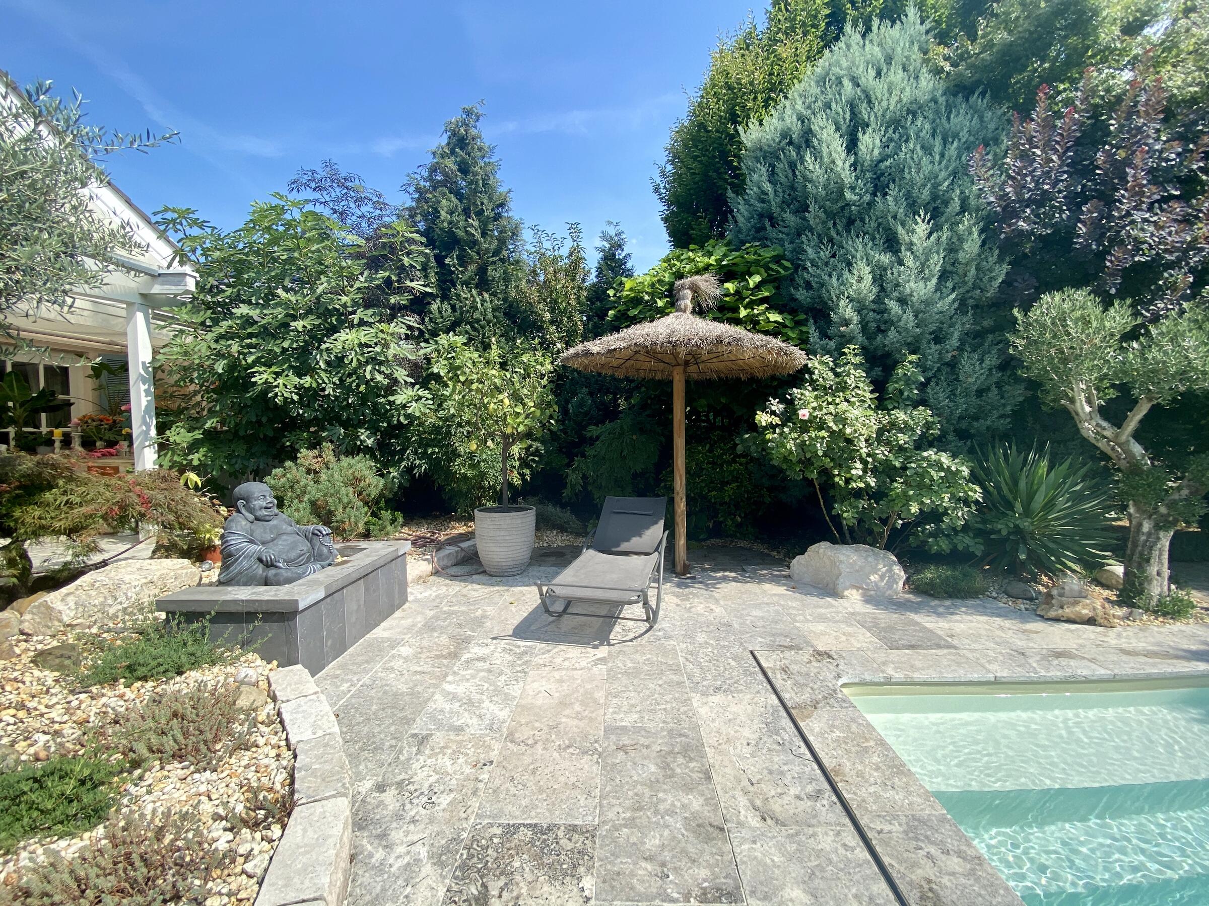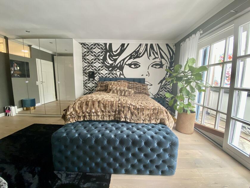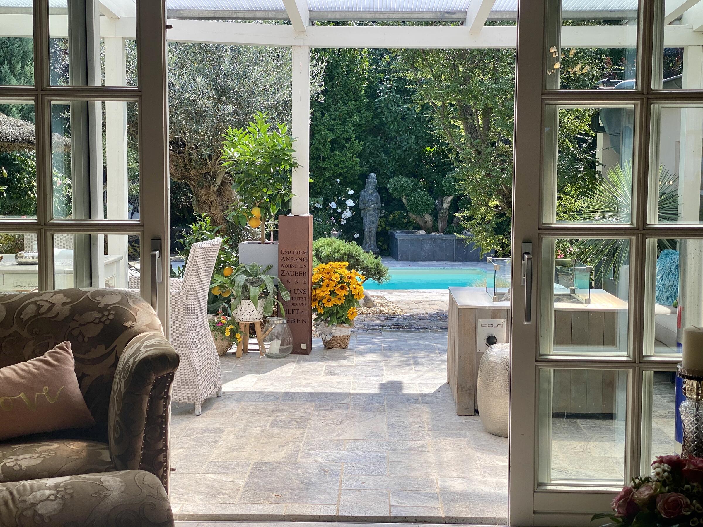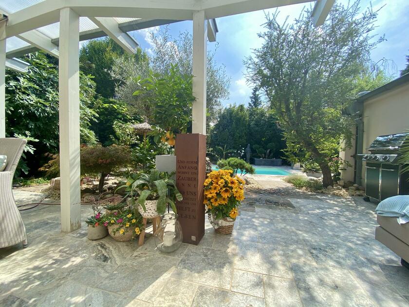 Der Garten ist vollkommen uneinsehbar. Er verfügt über eine mediterrane Bepflanzung mit großen Oliven, Feigenbäume, Palmen etc. Dazu Natursteinböden, eine beleuchtete Bar und eine große überdachte Terrasse mit Feuerstelle und Whirlpool. Der Pool ist beheizbar, mit Lichteffekten und Gegenstromanlage. Das gesamte Anwesen ist mit hochwertigsten Materialien ausgestattet. Die Einrichtung ist extravagant und im Art Déco und Pop Art Stil.