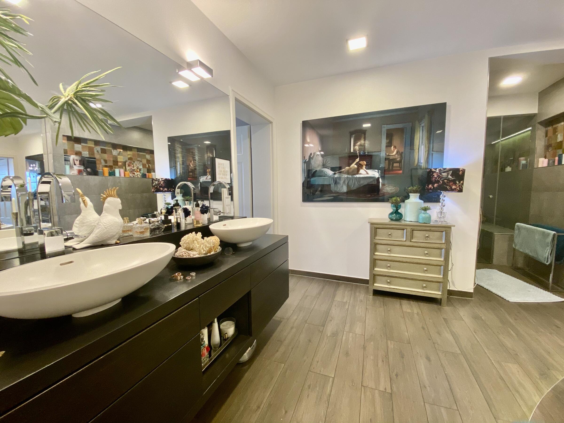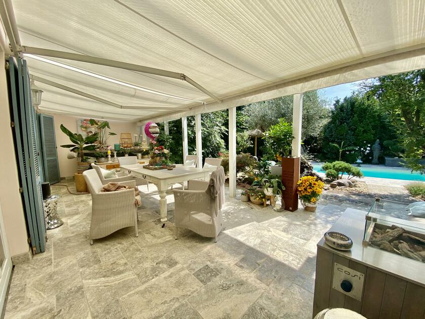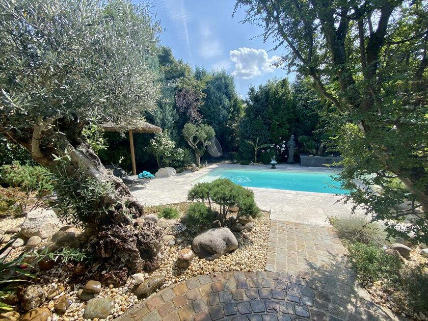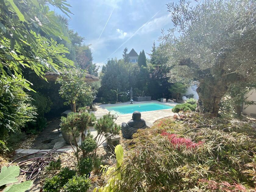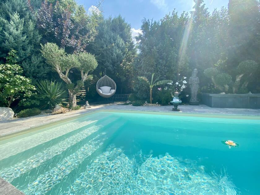 Der Garten ist vollkommen uneinsehbar. Er verfügt über eine mediterrane Bepflanzung mit großen Oliven, Feigenbäume, Palmen etc. Dazu Natursteinböden, eine beleuchtete Bar und eine große überdachte Terrasse mit Feuerstelle und Whirlpool. Der Pool ist beheizbar, mit Lichteffekten und Gegenstromanlage. Das gesamte Anwesen ist mit hochwertigsten Materialien ausgestattet. Die Einrichtung ist extravagant und im Art Déco und Pop Art Stil.