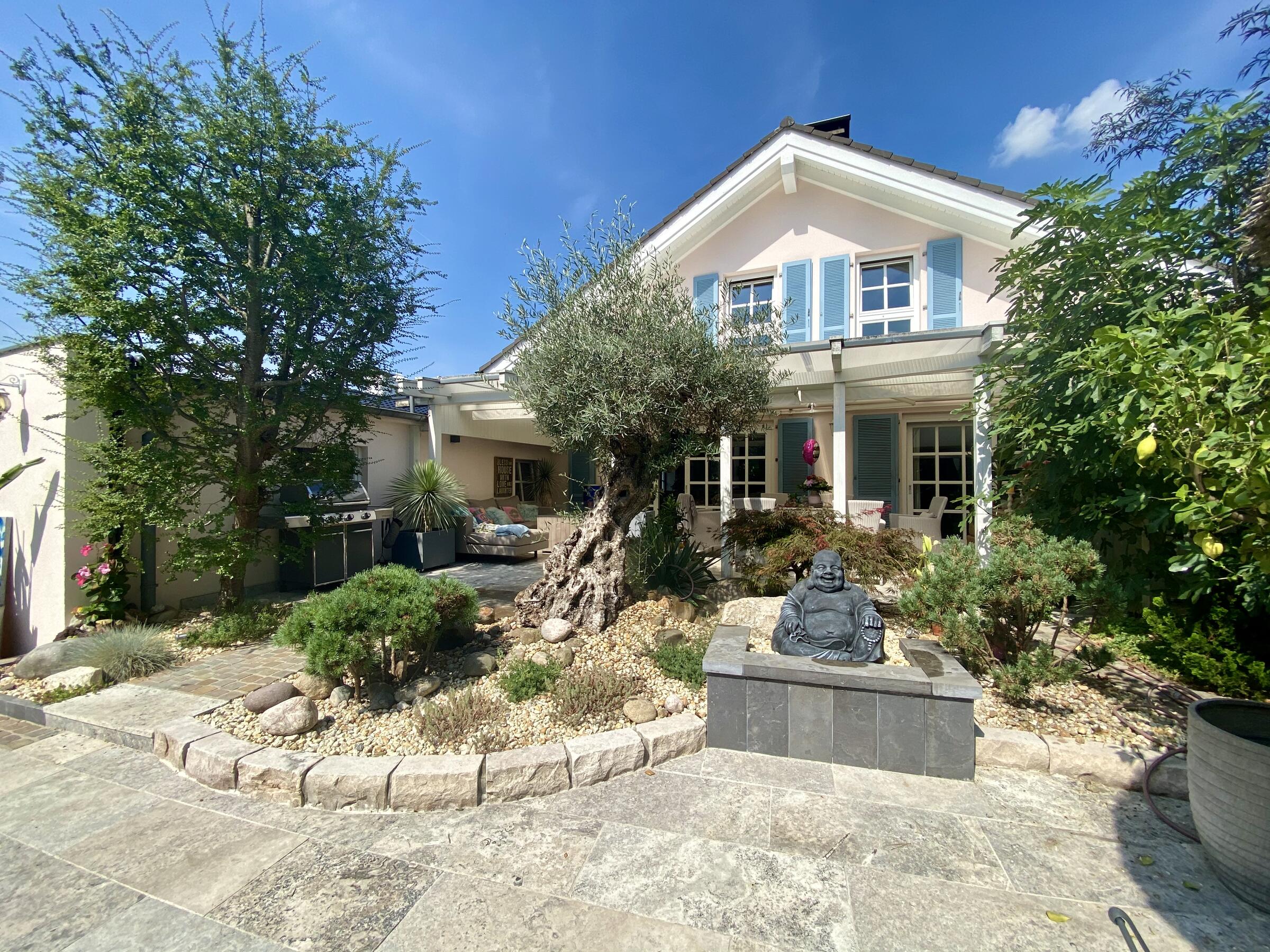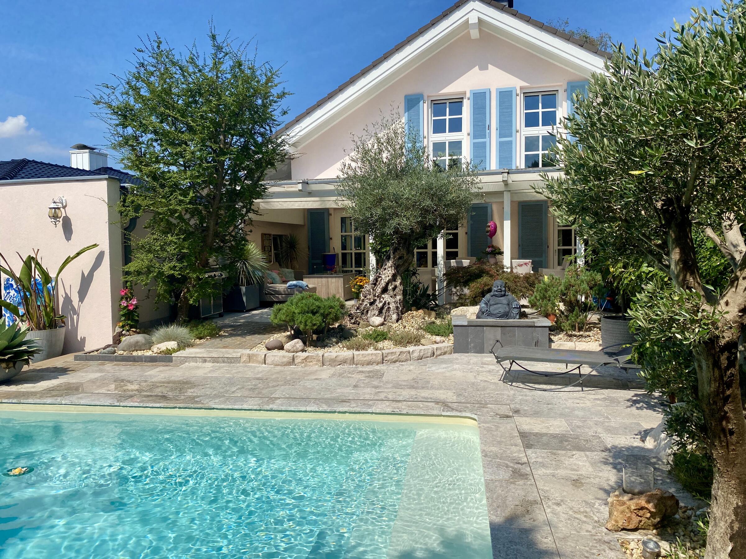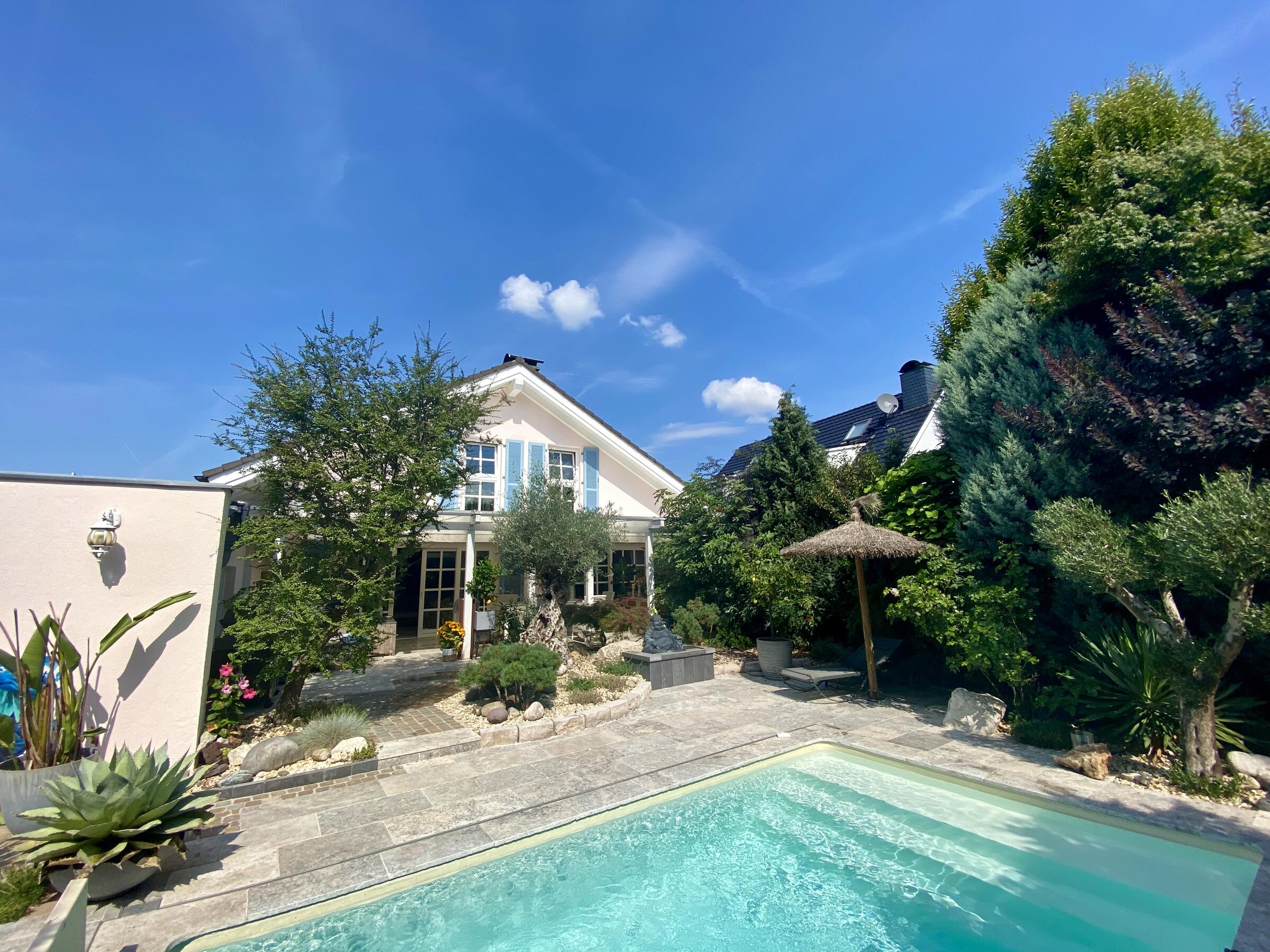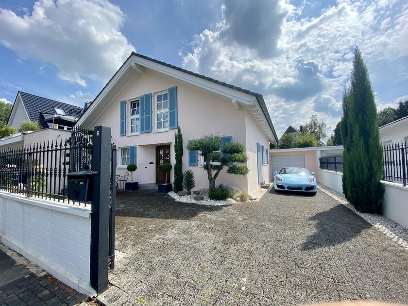 Unser schönes Einfamilienhaus im Südfranzösischen Stil befindet sich auf einem 530 m² großen Grundstück in Monheim am Rhein, einer Kleinstadt zwischen Düsseldorf und Köln. Es zeichnet sich durch seine erstklassige Einrichtung und hochwertige Ausstattung aus. Durch den Eingangsbereich gelangt man in den großen Wohnbereich, der sich über 2 Etagen mit offener Galerie erstreckt und über einen Kamin und eine offene Küche verfügt. Vom Wohnbereich aus gelangt man zu den Privaträumen: ein Schlafzimmer mit großem Zugang zur Terrasse, ein großes Wellnessbad mit freistehender Wanne, zwei Waschtischen, außergewöhnlichen Lichtkonzepten und einer großen begehbaren Dusche/Dampfsauna.
