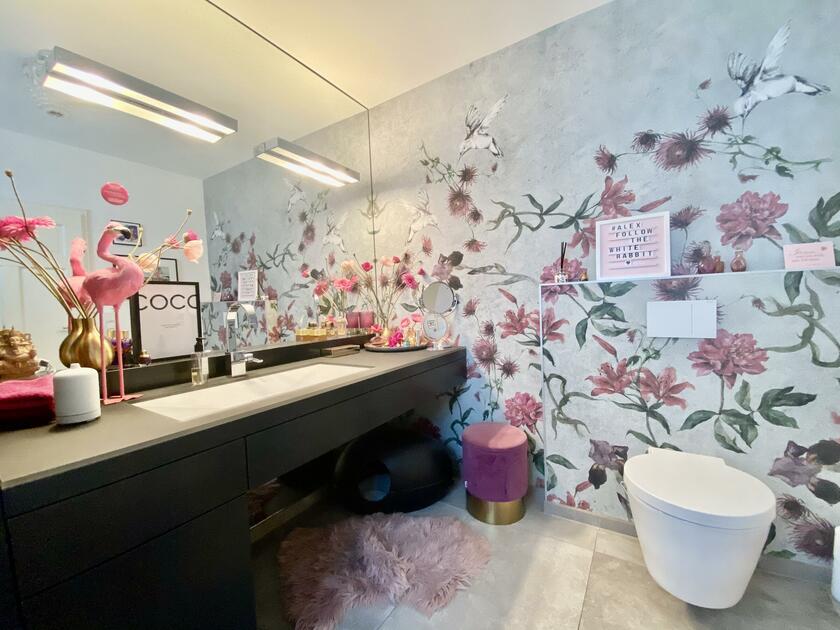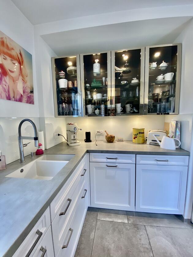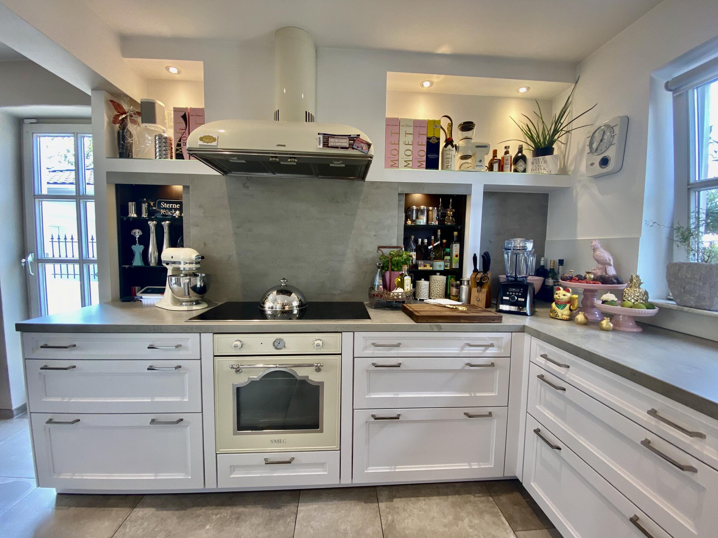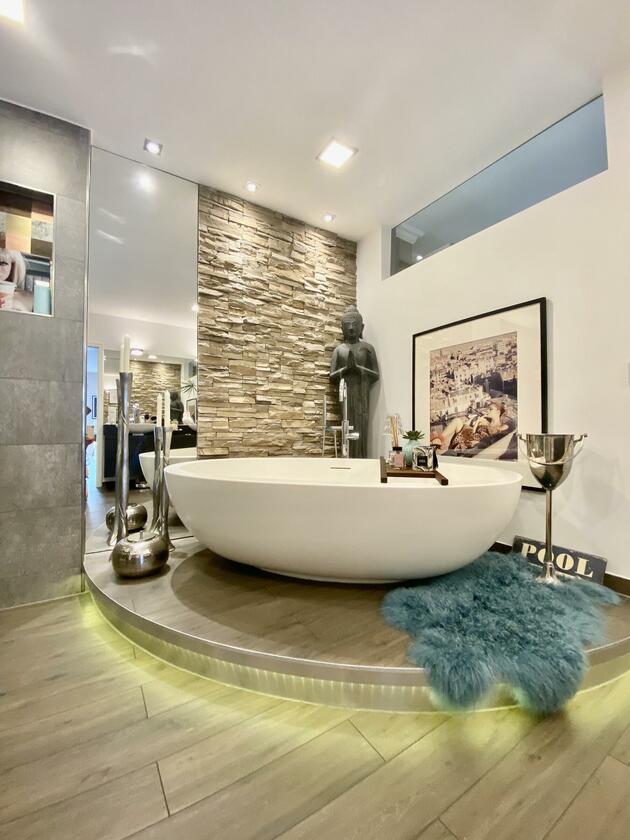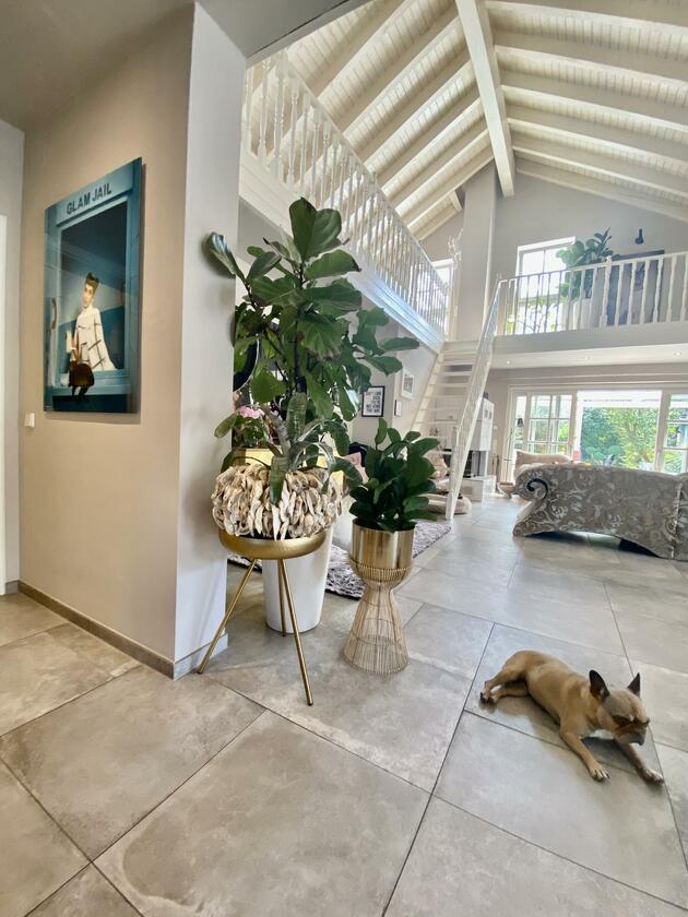 Unser schönes Einfamilienhaus im Südfranzösischen Stil befindet sich auf einem 530 m² großen Grundstück in Monheim am Rhein, einer Kleinstadt zwischen Düsseldorf und Köln. Es zeichnet sich durch seine erstklassige Einrichtung und hochwertige Ausstattung aus. Durch den Eingangsbereich gelangt man in den großen Wohnbereich, der sich über 2 Etagen mit offener Galerie erstreckt und über einen Kamin und eine offene Küche verfügt. Vom Wohnbereich aus gelangt man zu den Privaträumen: ein Schlafzimmer mit großem Zugang zur Terrasse, ein großes Wellnessbad mit freistehender Wanne, zwei Waschtischen, außergewöhnlichen Lichtkonzepten und einer großen begehbaren Dusche/Dampfsauna.