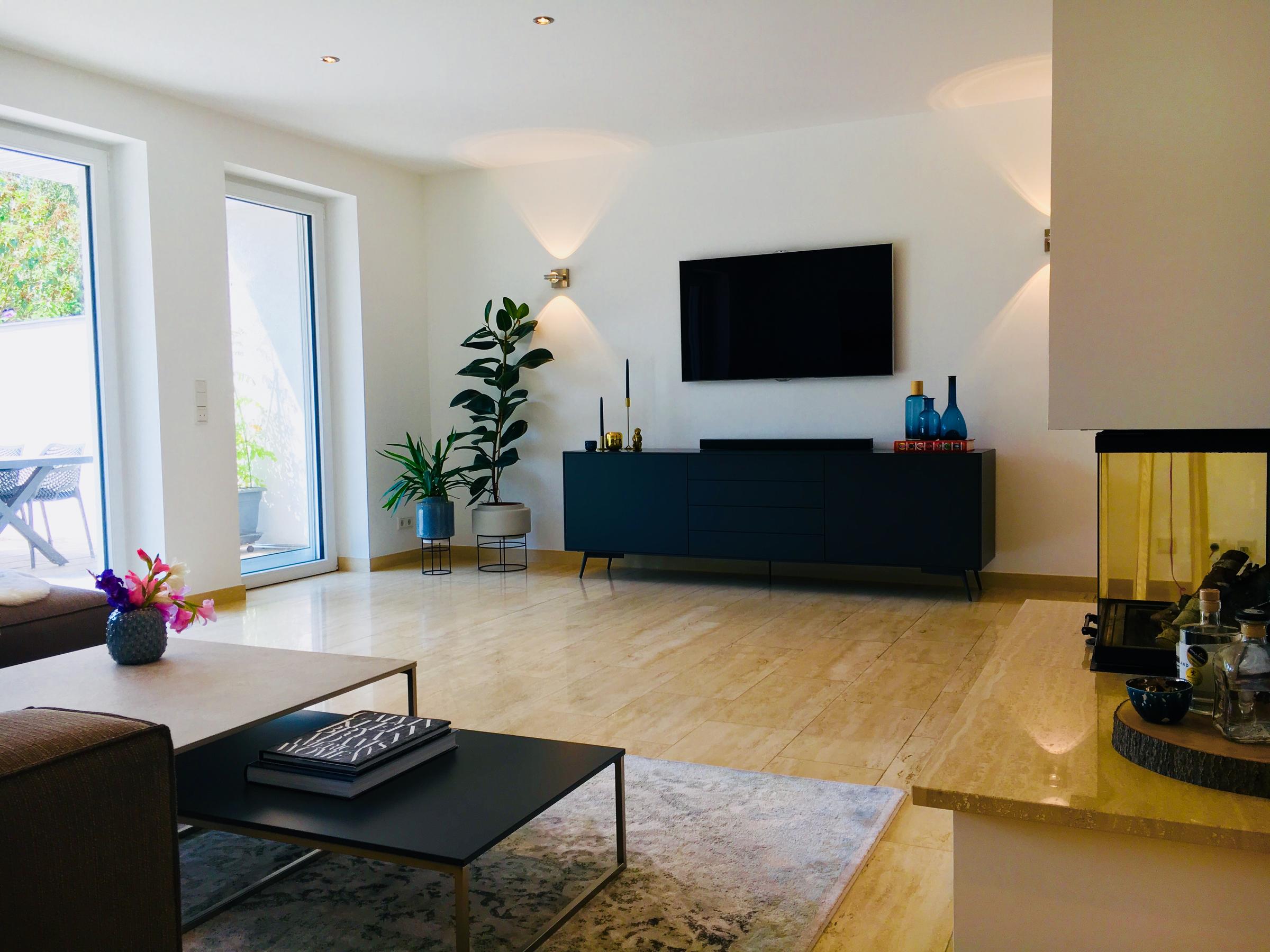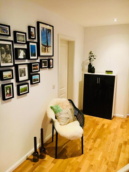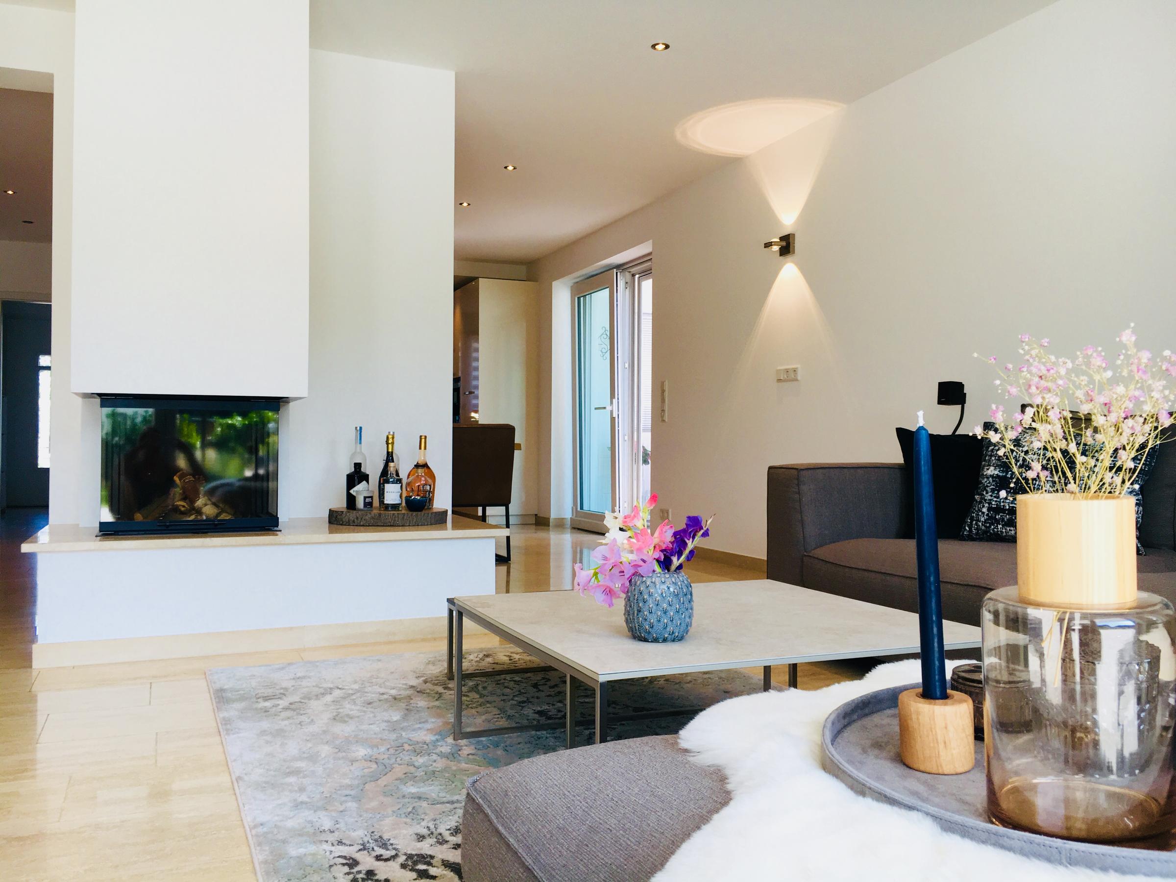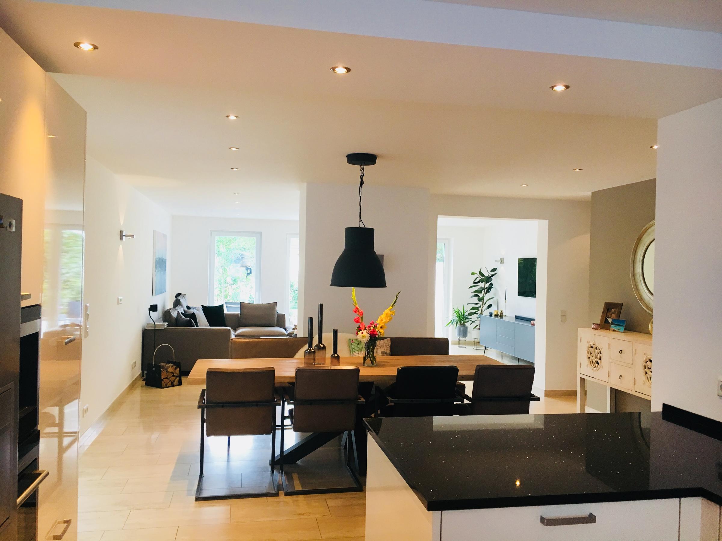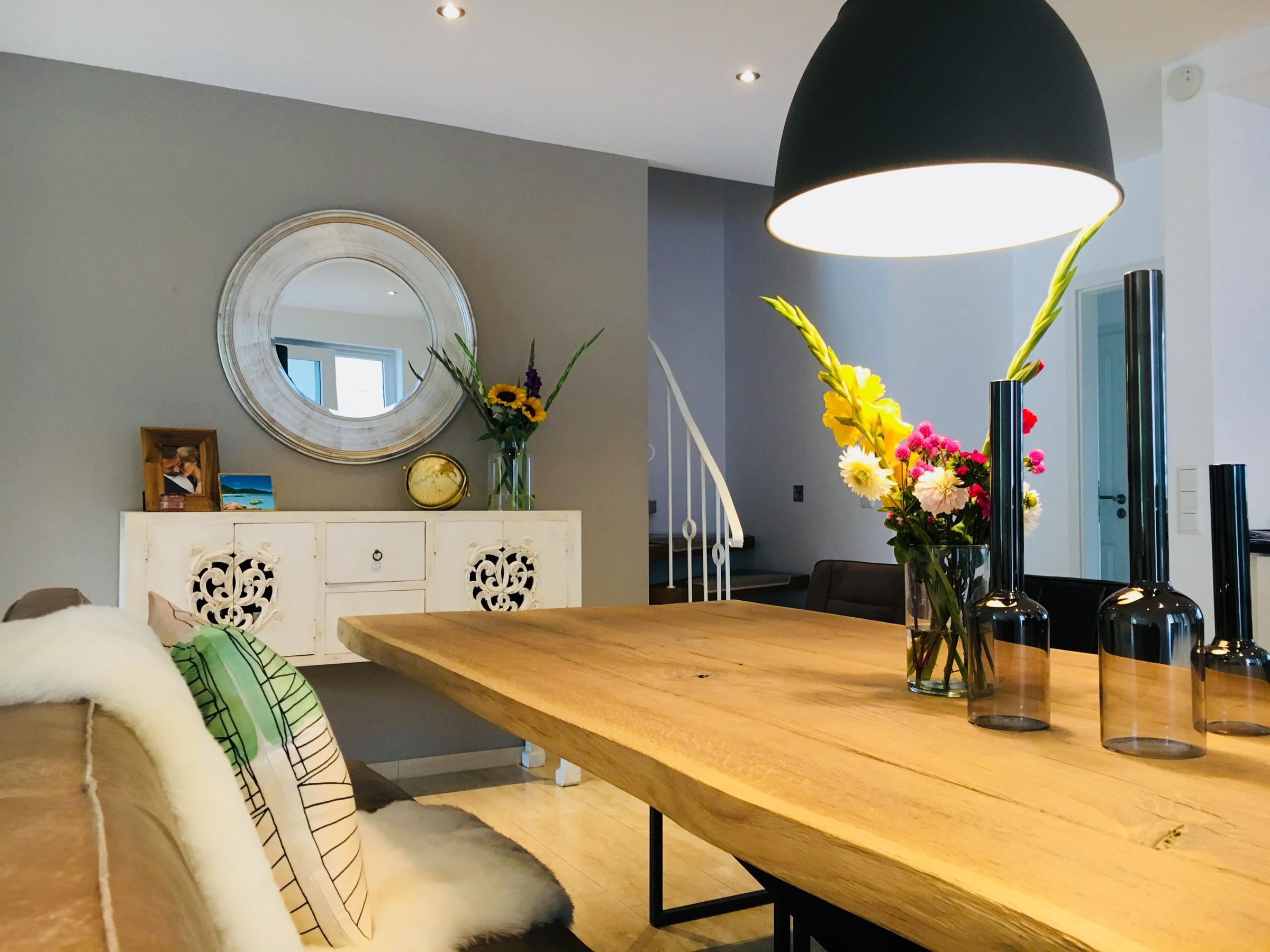 Die wunderschöne Doppelhaushälfte in idyllischer Lage besticht mit moderner Leichtigkeit. Die hochwertige Einrichtung des Hauses wurde sehr bewusst ausgewählt. In den Fokus wurde eine moderne Gemütlichkeit gestellt, die aus einem Material- und Farbenmix in Naturtönen erzeugt wurde. Durch die vielen und bodentiefen Fenster im Wohnzimmer lassen sich die Rinder auf der anliegenden Kuhweide beim Grasen beobachten. Insgesamt stehen in der Immobilie 3 Bäder und 5 Toiletten zur Verfügung, eine Sauna, ein Fitnessraum, eine große offene moderne Küche sowie 2 Terrassen. Es gibt 2 Schlafzimmer, ein Kinderzimmer inklusive Toilette und ein Büroraum. Ein weiteres Highlight des Hauses ist die überdachte Outdoorküche auf der Seitenterrasse inklusive Weber Grill sowie der große Pool (8x4 m). Der Internetanschluss kann bei Buchung genutzt werden. Die Südseite des Grundstückes garantiert ganztägiges Sonnenlicht und unterstreicht die Helligkeit und Leichtigkeit der Einrichtung, lädt zudem zum Sonnenbaden im grünen Garten bzw. der 40 m² großen Terrasse ein.