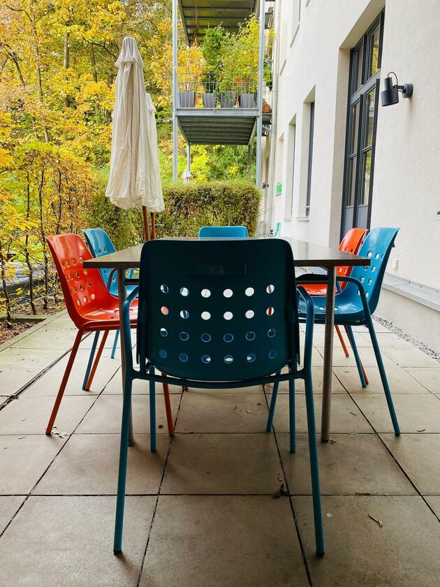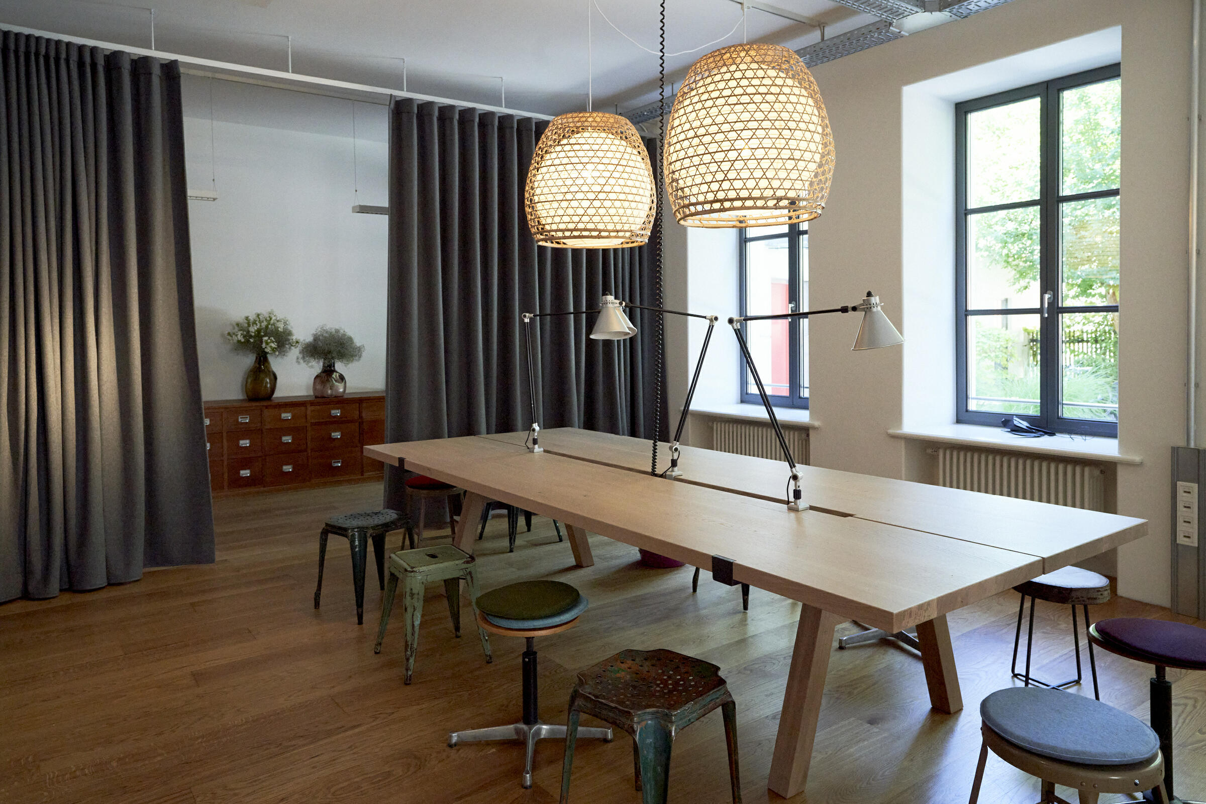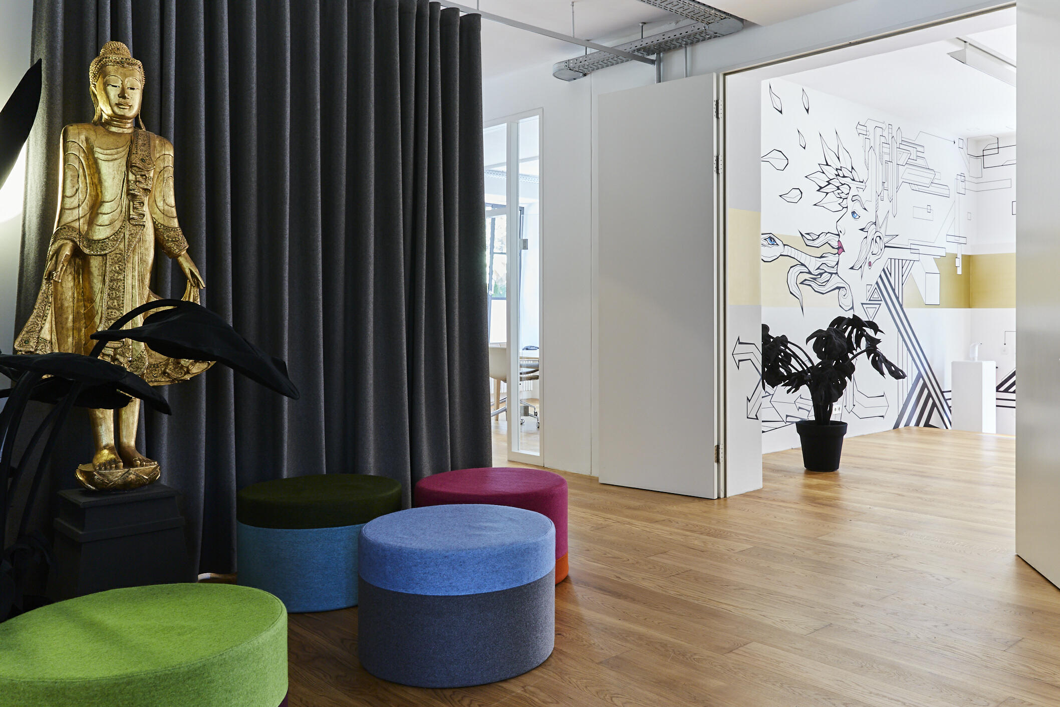 Das ca. 250 m² große Büro- und Designer Loft liegt ganz in der Nähe der Theresienwiese. Es verfügt über eine großzügige Zimmeraufteilung und bietet ausreichend Platz für Kamera- und Fotoausrüstung. Die offene Raumgestaltung wird lediglich durch verglaste Einheiten unterbrochen, durch welche man jedoch weiterhin in den Raum blicken kann. Es gibt einen großen Besprechungsbereich, der nur von einem Vorhang umgeben ist, sowie einen kleineren Besprechungsraum mit Glastür. Das Büro verfügt zudem über eine große Terrasse mit Sonnenschirmen sowie über ein modernes großes WC mit Duschmöglichkeit. Schwarz-weiß Mosaikkacheln am Boden und eine Vielzahl von großen Farnen und Palmen machen das WC fast zu einem „kleinen Dschungel“. Das absolute Highlight der Loft-Fläche ist der mit Tape Art gestaltete Eingangsbereich sowie der große goldene Buddha im Zentrum des Büros. Bei den weiteren Einrichtungsdetails wurde vor allem auf nachhaltige Produkte gesetzt. Wie z. B. „PET“ Designer Lampen in der Besprechung, Filzpflanzen im Foyer sowie mit Filz bezogene Holzpaneelen als Wandverzierung mit gleichzeitiger Post-IT Funktion. Das Büro befindet sich im Erdgeschoss eines Mehrfamilienhauses in einem ruhigen Hinterhof und verfügt über einen Seiten- und einen Haupteingang. Parkplätze befinden sich direkt vor der Haustür. Ebenso ist eine Tiefgarage mit mehreren Stellplätzen verfügbar.