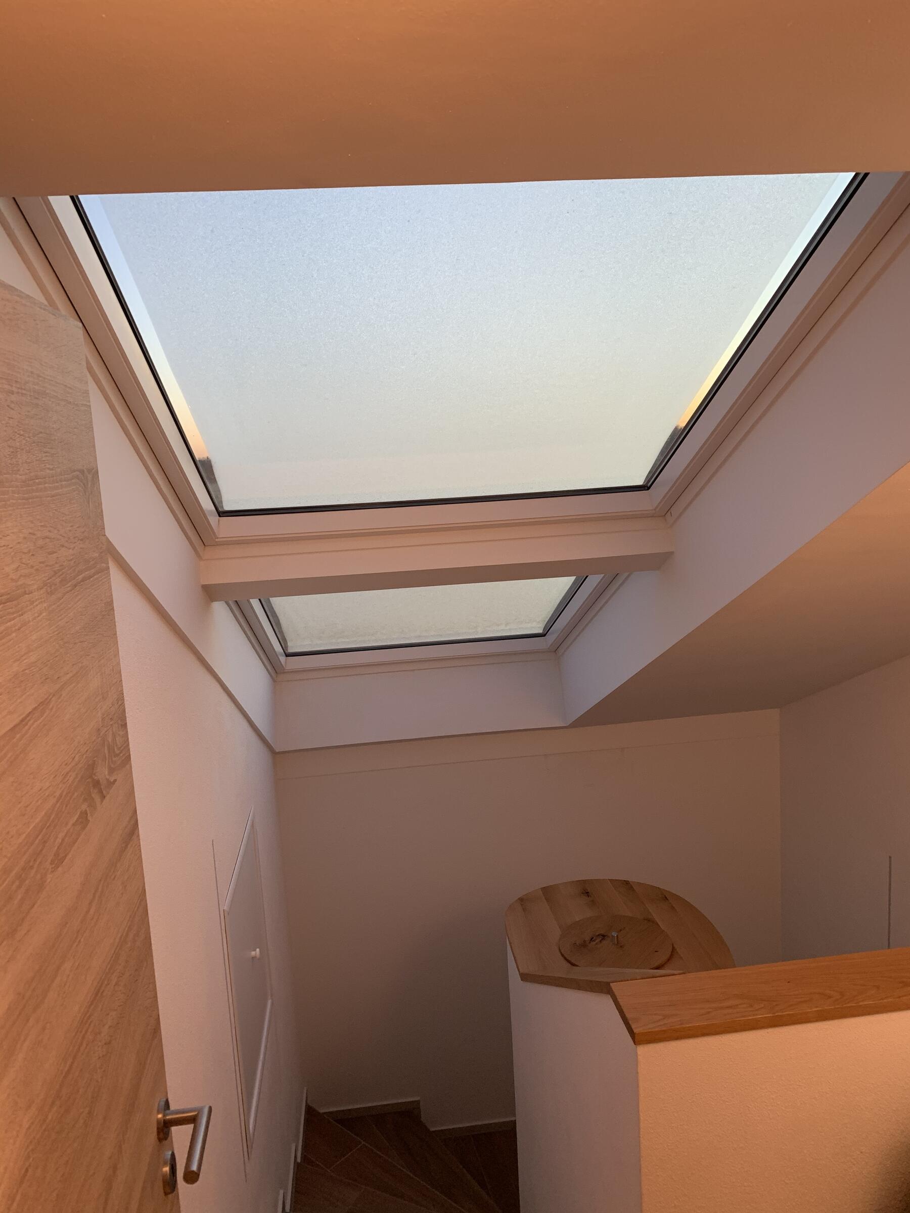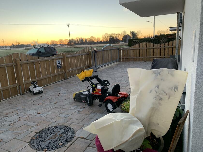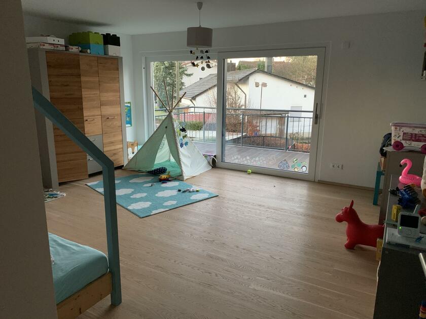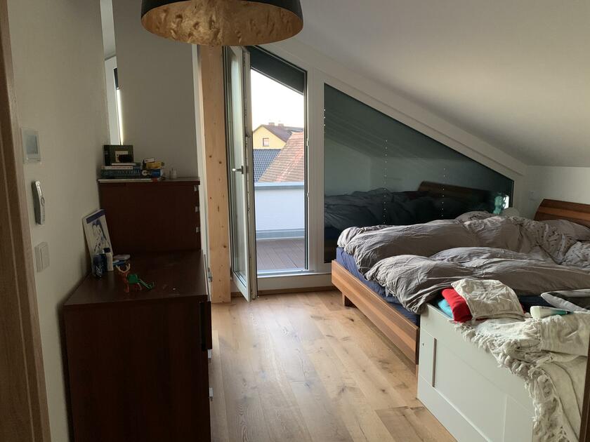 Das Haus ist möbiliert, kann aber je nach Situation angepasst werden. Im Erdgeschoss stehen 50 m² Wohnraum zur Verfügung, welche in die geräumige Küche münden. Vom Wohnbereich aus erreicht man die Holzterrasse über zwei große Schiebetüren. Die Küche hat zwei Zugänge und eine Terrassentür, ideal für alle Perspektiven. Die quadratischen Zimmer im ersten Stock sind, bis auf den Kamin und den Balkon, identisch. Das Haus besitzt auf jeder Seite einen Balkon und eine Dachterrasse die sich über die gesamte Länge erstreckt. Neben dem Haus befindet sich ein 3,5 m breiter Carport. Vor dem Haus befindet sich ein großer Schotterstreifen, der sich ideal zum Parken eignet. Fußläufig sind die S-Bahn, ein Metzger, ein Bäcker und ein Wirtshaus erreichbar.