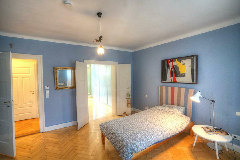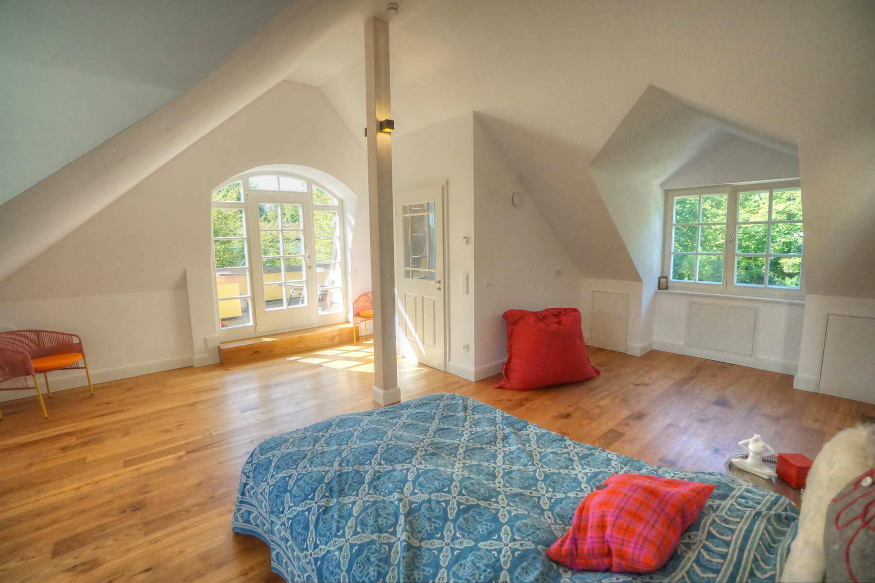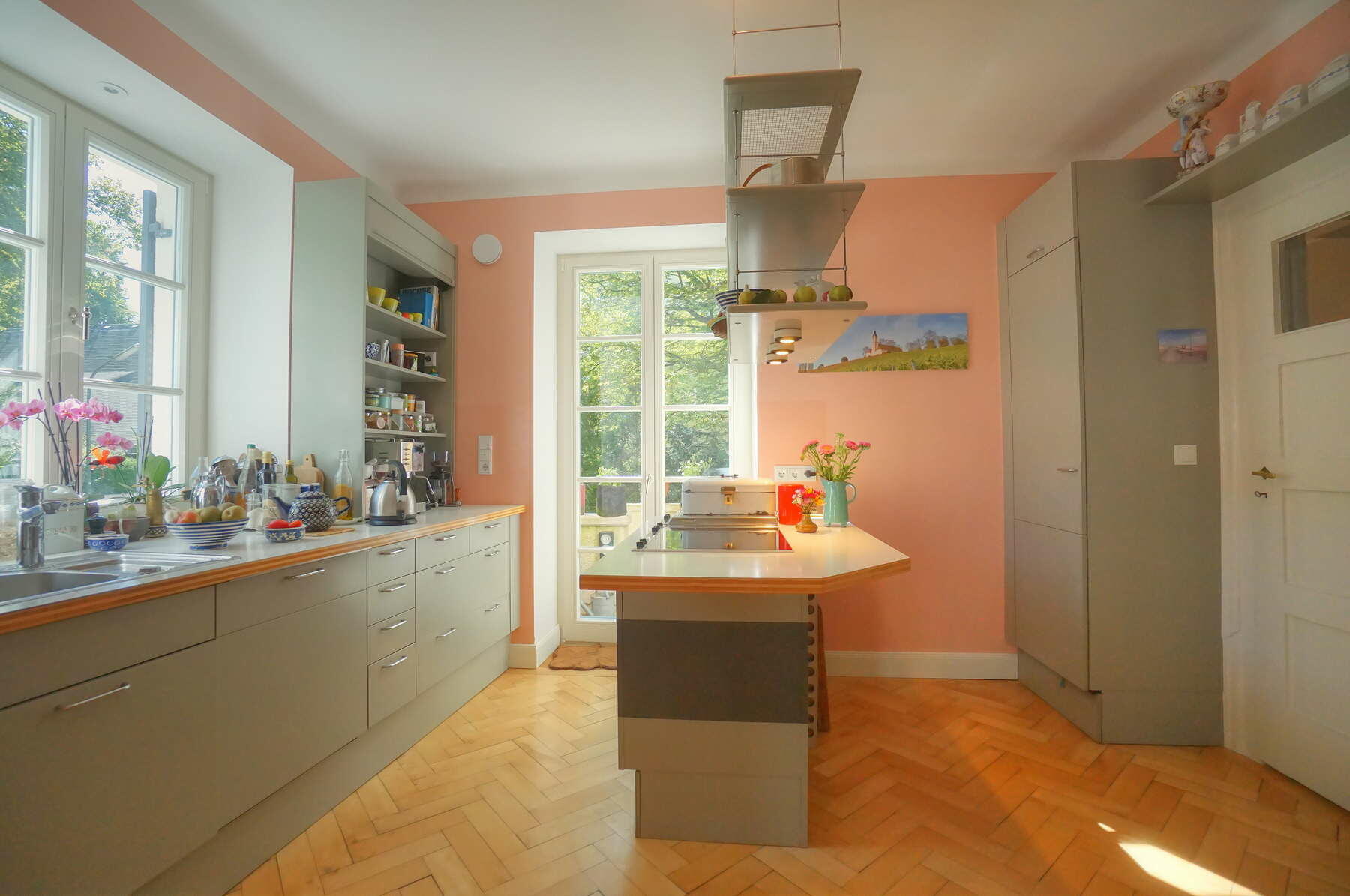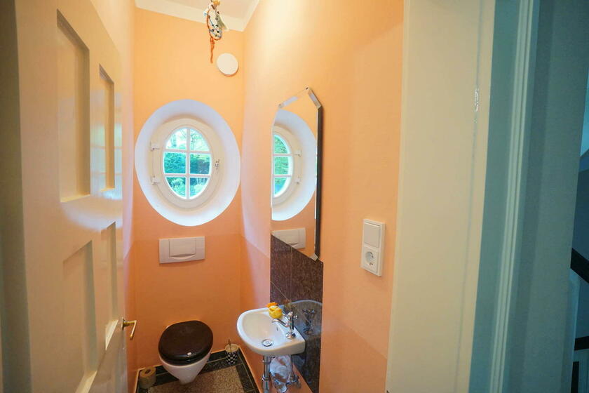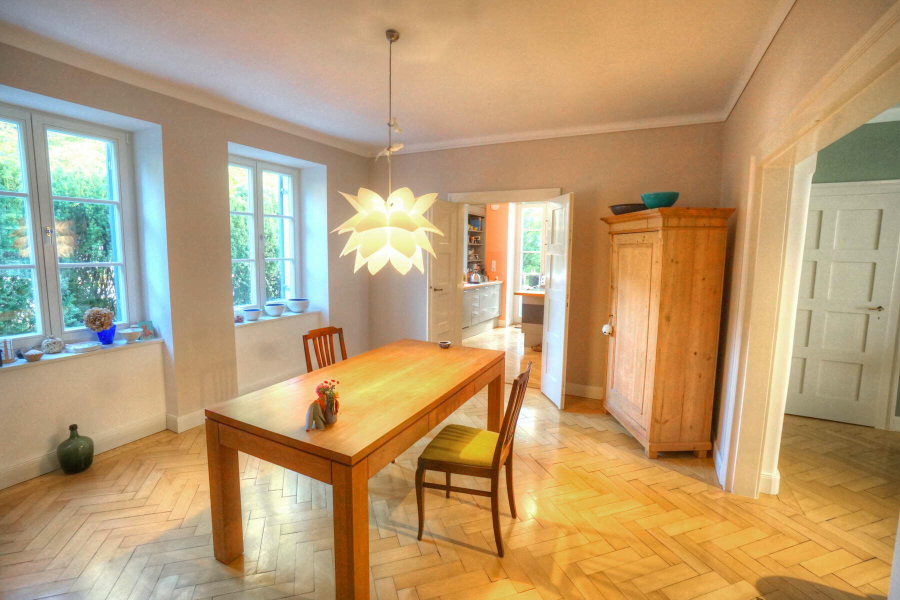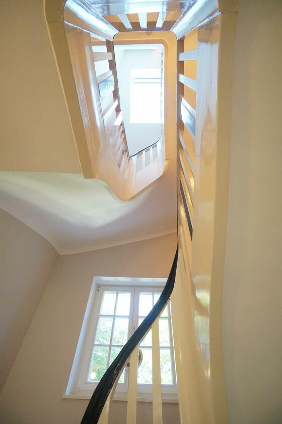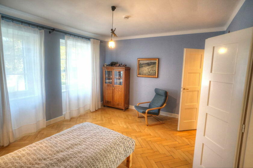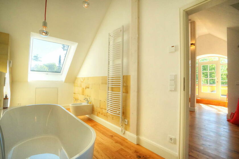 Im Obergeschoss befinden sich ein großes Schlafzimmer mit angeschlossener Ankleide, ein neu hergestelltes Bad mit Solnhofener-Naturstein an den Wänden und Zementfliesen auf dem Boden, ein Arbeitszimmer mit Erker und ein weiteres Arbeitszimmer - das sogenannte Salettl - , das mit seinen vier Fenstern vielfältige Blicke in die nahestehenden Bäume und den rückwärtigen Garten bietet. Bad und Ankleide haben über bodentiefe Fenster Zugang zur Terrasse über dem Anbau mit Blick in den Garten. Hier werden aktuell in Töpfen und einem selbstgebauten Gewächshaus Pflanzen gezogen. Auch im Obergeschoss sind die Böden großteils mit altem Fischgrätparkett ausgeführt. Die Räume sind abgesehen vom Treppenhaus und Bad in kräftigen Farben gestrichen.