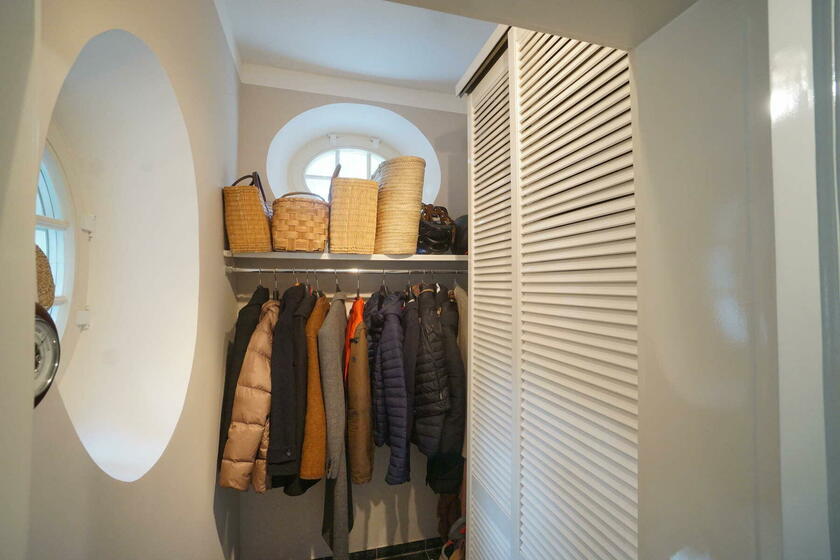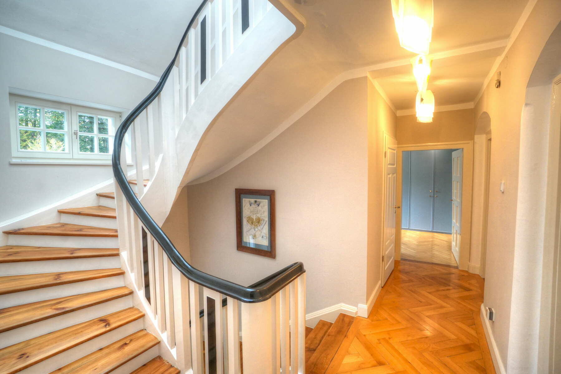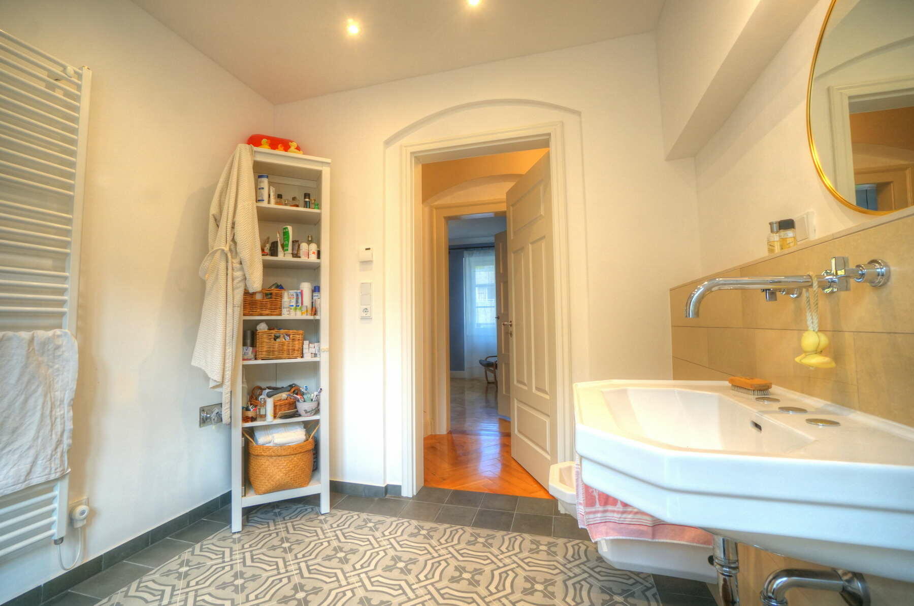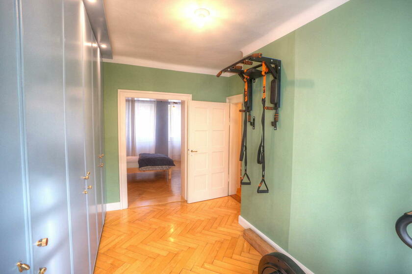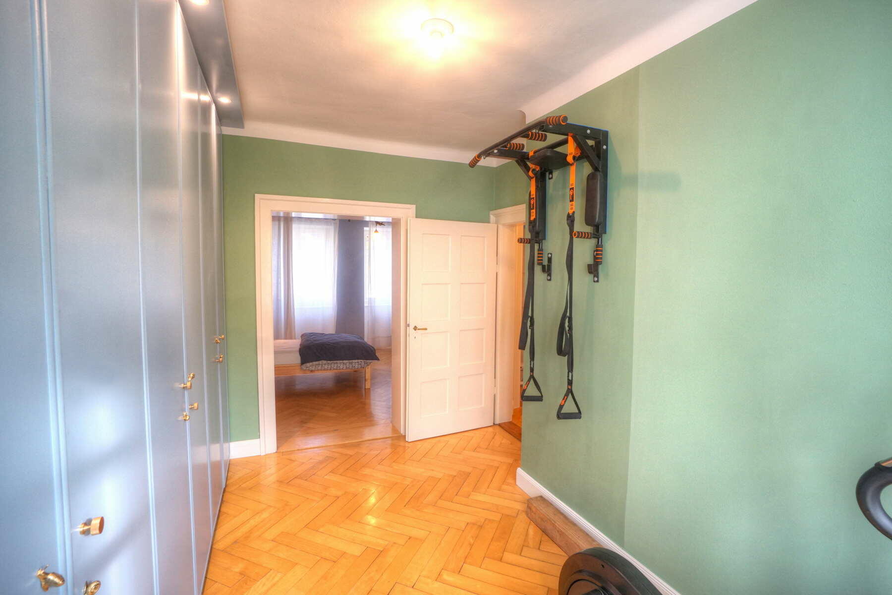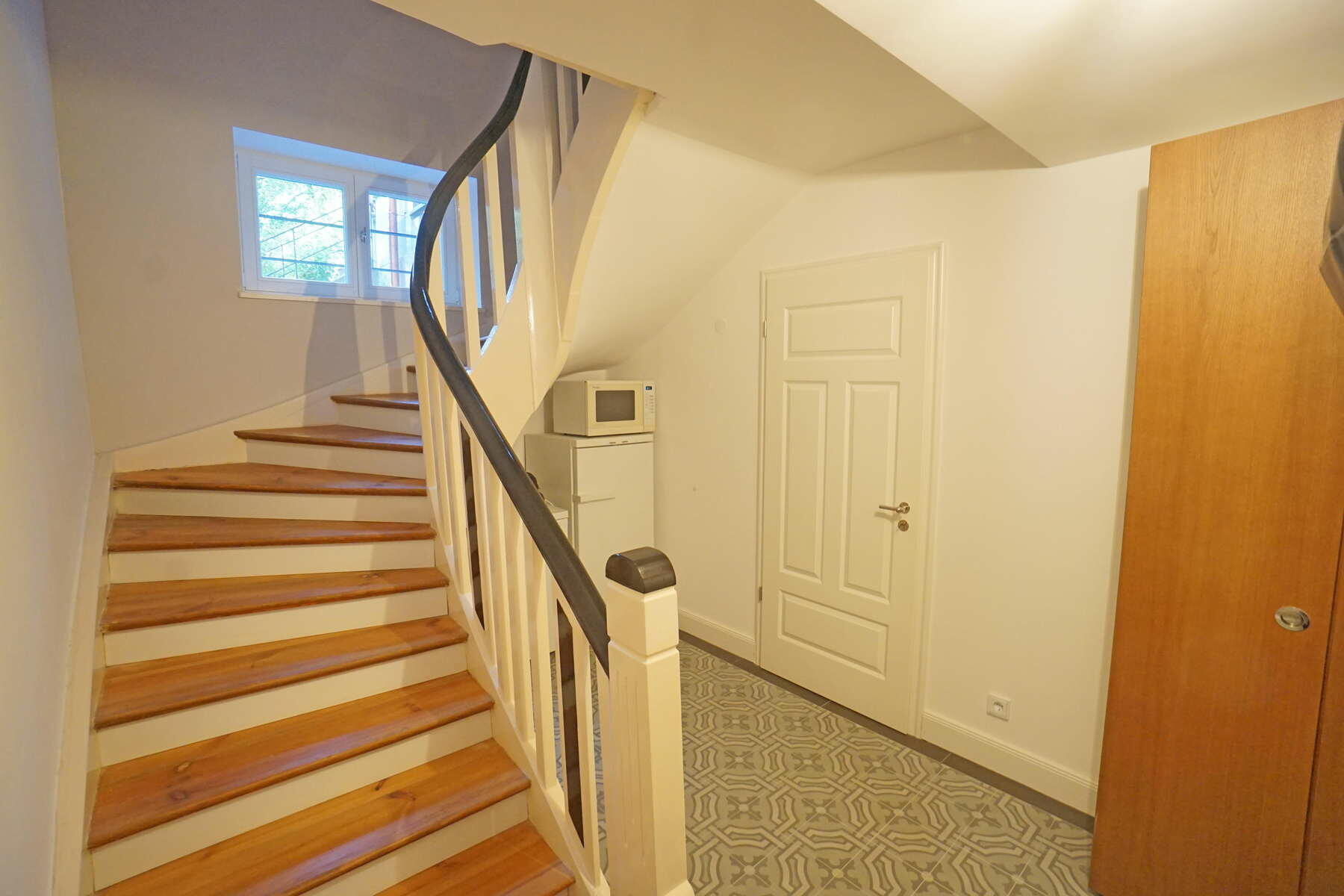 Im Obergeschoss befinden sich ein großes Schlafzimmer mit angeschlossener Ankleide, ein neu hergestelltes Bad mit Solnhofener-Naturstein an den Wänden und Zementfliesen auf dem Boden, ein Arbeitszimmer mit Erker und ein weiteres Arbeitszimmer - das sogenannte Salettl - , das mit seinen vier Fenstern vielfältige Blicke in die nahestehenden Bäume und den rückwärtigen Garten bietet. Bad und Ankleide haben über bodentiefe Fenster Zugang zur Terrasse über dem Anbau mit Blick in den Garten. Hier werden aktuell in Töpfen und einem selbstgebauten Gewächshaus Pflanzen gezogen. Auch im Obergeschoss sind die Böden großteils mit altem Fischgrätparkett ausgeführt. Die Räume sind abgesehen vom Treppenhaus und Bad in kräftigen Farben gestrichen.