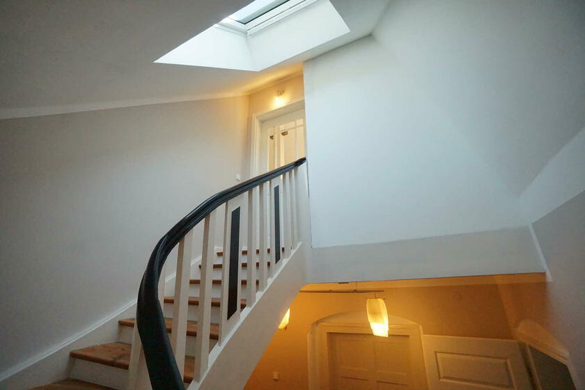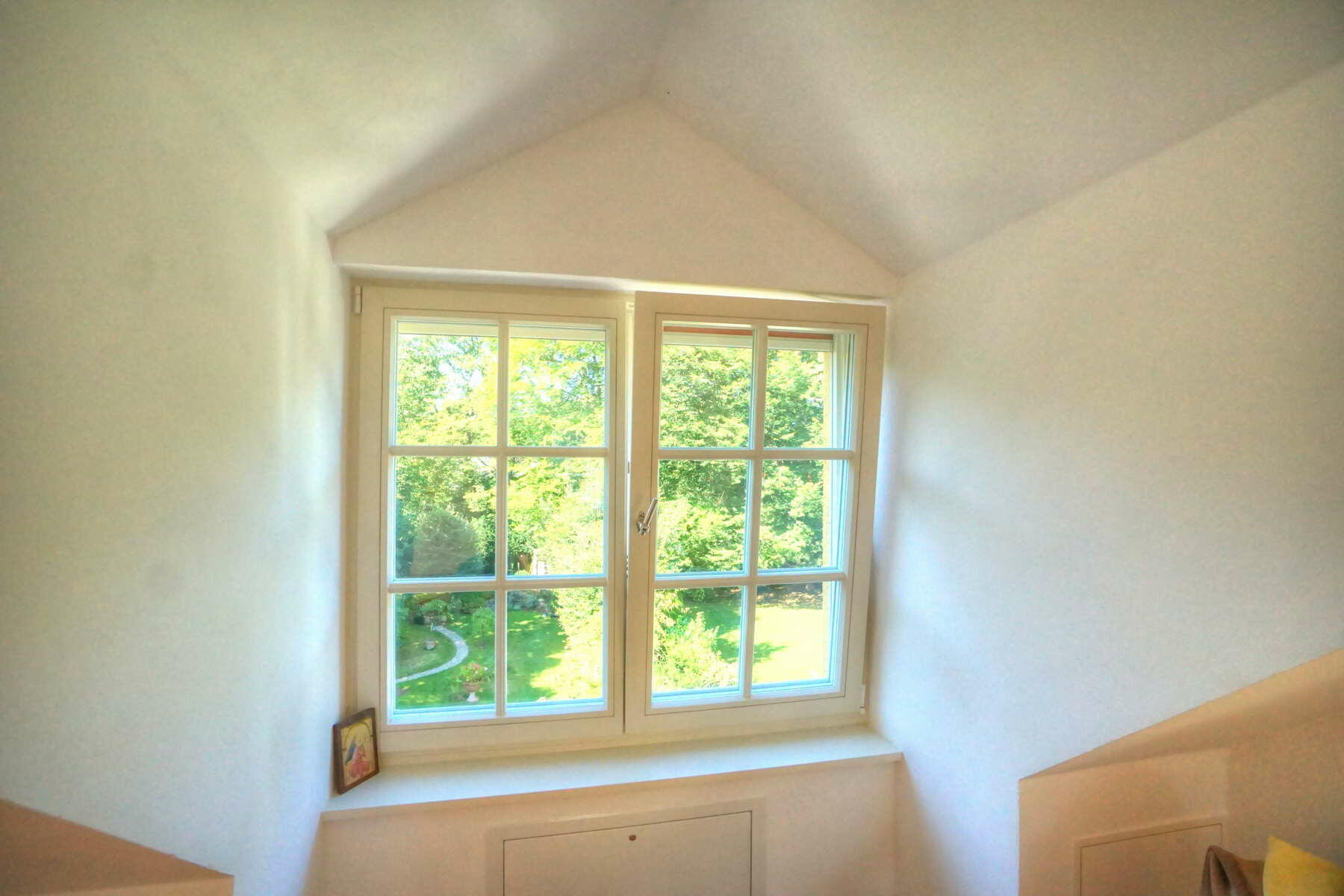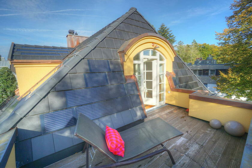 Im neu ausgebauten Dachgeschoss befinden sich ein großes Atelier mit einem weiteren Bad und einer nach Süden orientierten kleinen Dachterrasse. Die Böden sind hier mit massiven Eschedielen ausgeführt, die Wände mit weiß gestrichenem Lehm verputzt.