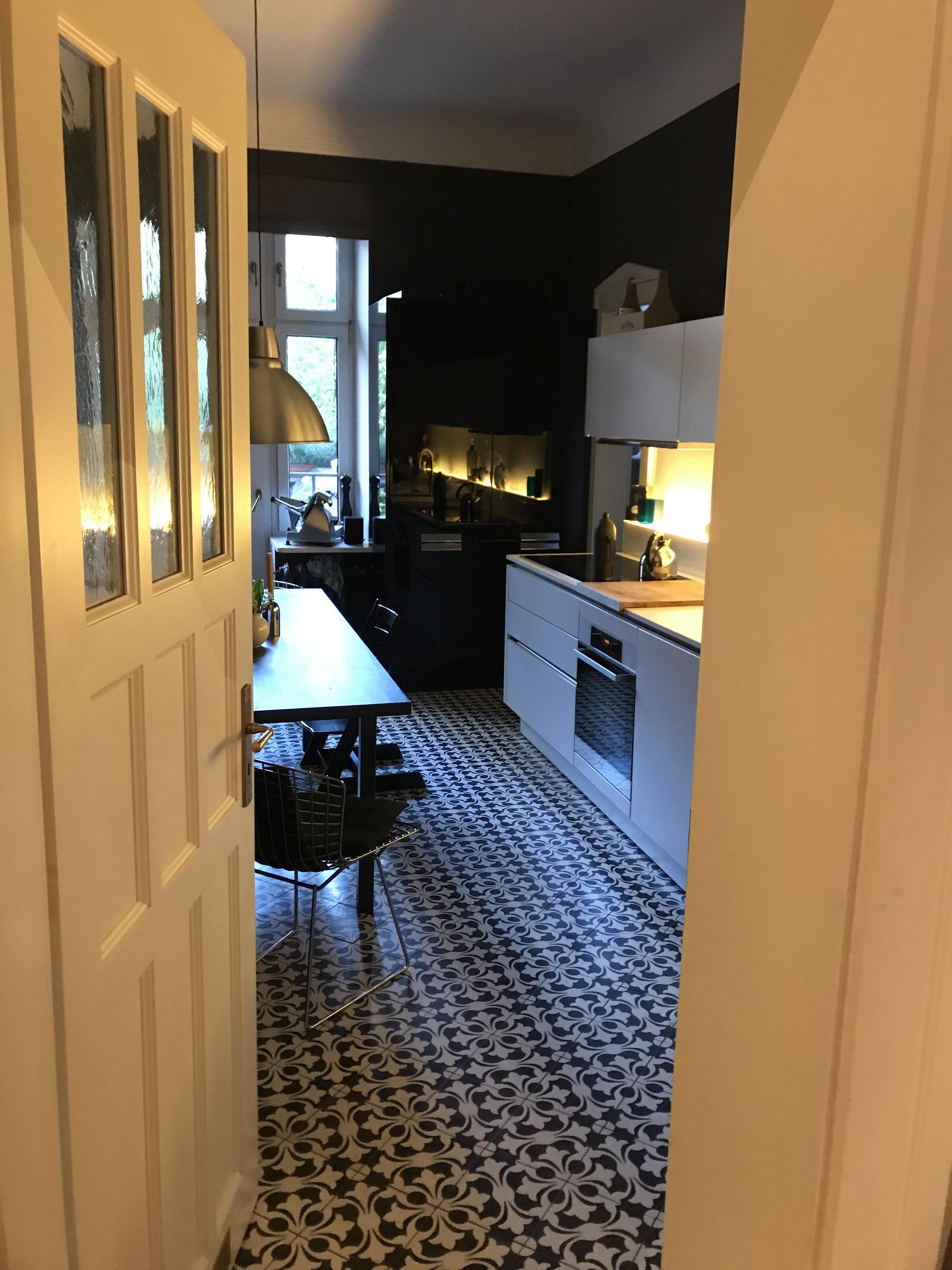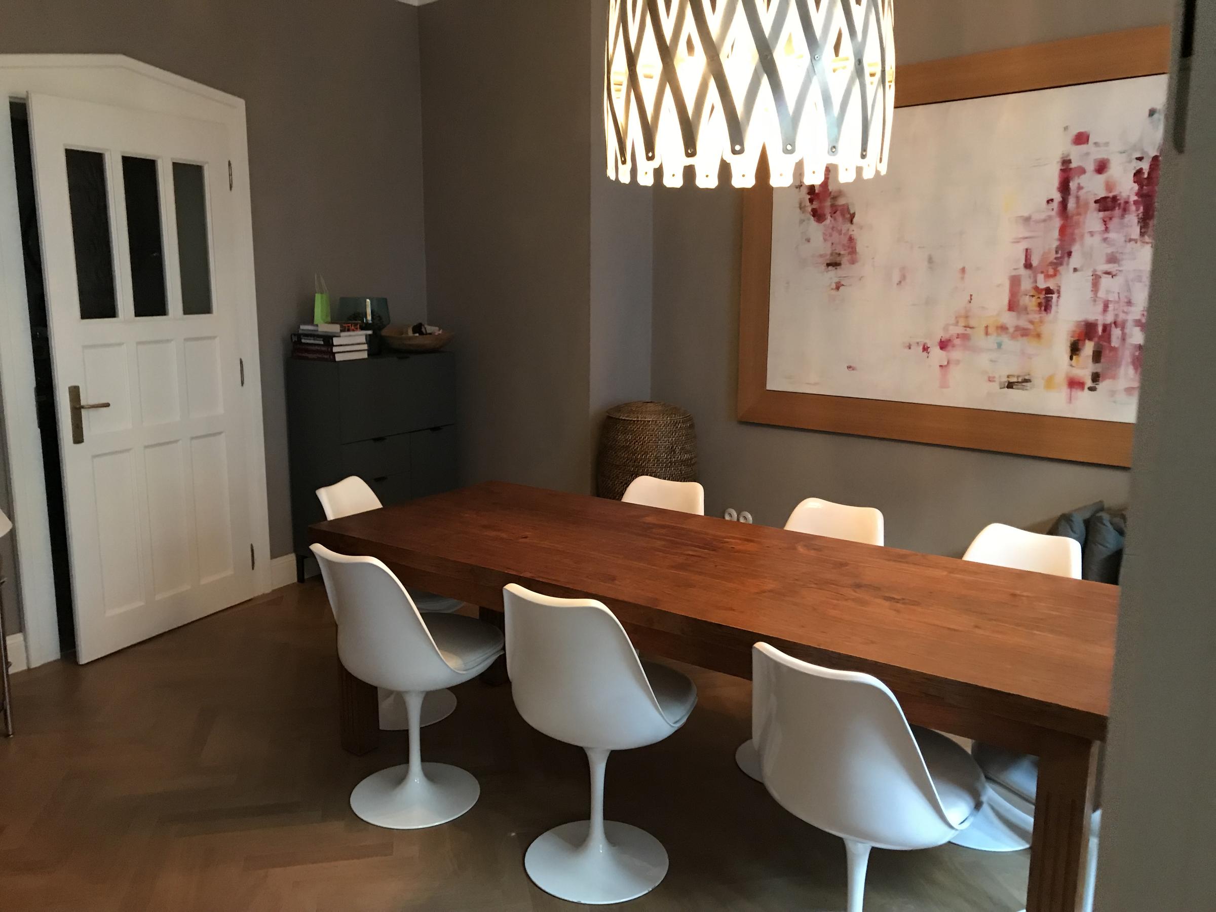 Die Einrichtung besteht aus einem hochwertigen Mix aus modernen Möbeln und dekorativen Einzelstücken, die zusammen einen eleganten Wohnraum schaffen. Hohe Zimmerdecken mit Stuck und schöne Parkett- oder Fliesenböden bilden die Ausstattung. Die für Altbauten typische Sichtachse entsteht durch einen großzügigen Durchgang der zwei Zimmer miteinander verbindet. Kassettentüren und Fenster sind sehr gut erhalten.
