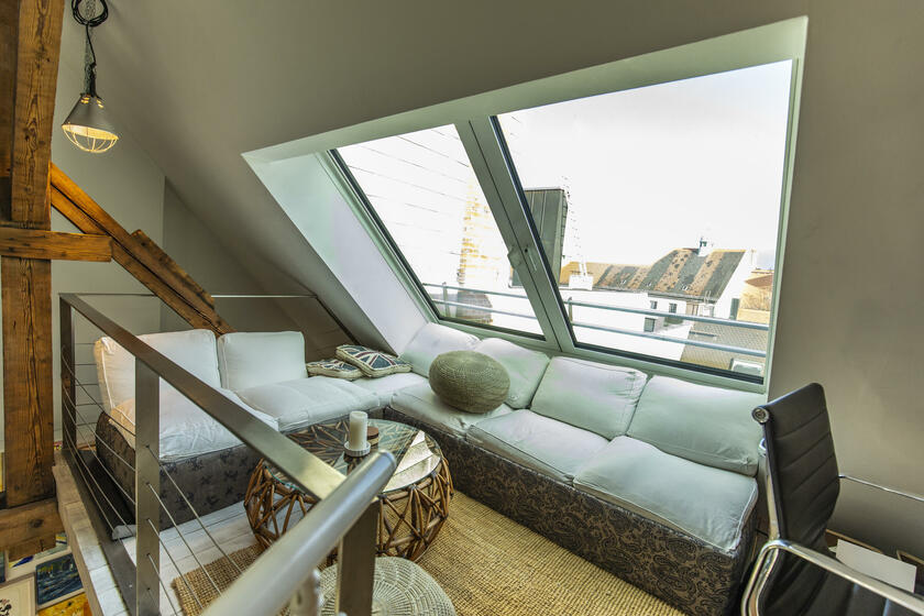 Stylische Wohnung im 4./5. OG zentral im Glockenbachviertel. Die gesamte Raumhöhe beträgt ca. 8 m. Der Raum ist von beiden Seiten und oben hell. Offener Küchen-, Wohn- und Essbereich mit cooler Küchenzeile, Siebträgermaschine, langem Esstisch, Industrieleuchten, modernen Möbeln und zahlreichen Fotos und Gemälden, die je nach Anforderung mit aufgenommen oder abgehängt werden können. Die Galerie ist über eine Wendeltreppe zugänglich. Diese ermöglich den Blick nach unten und hat ein großes Dachflächenfenster, das komplett geöffnet werden kann. Dunkler Eingangsbereich, Schlafzimmer zum Umziehen, Schminken, Stauraum, etc. und ein schönes Bad stehen ebenfalls zur Verfügung.