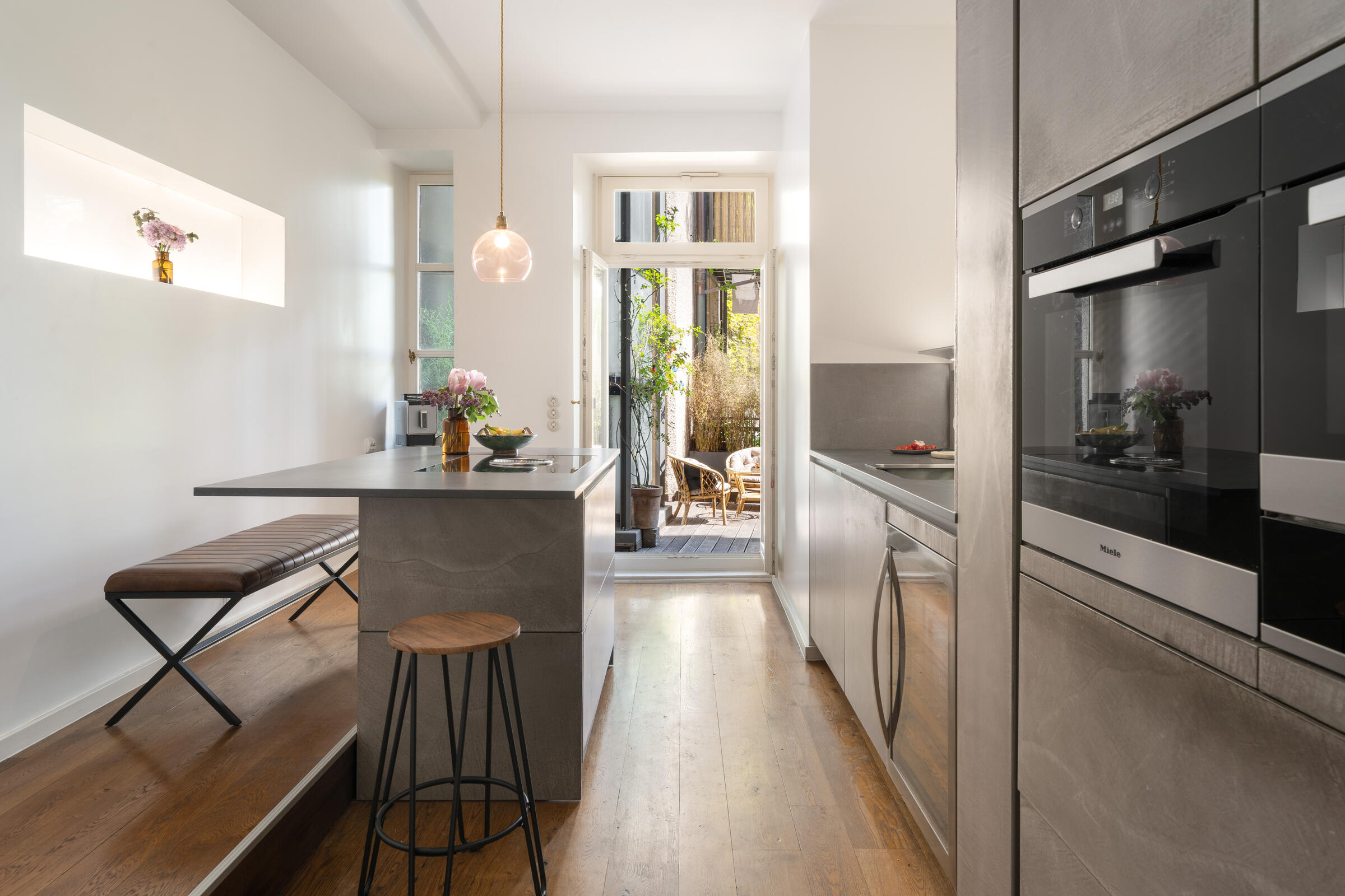 Die unbewohnte Altbauwohnung befindet sich im 1. Obergeschoss eines Wohnhauses in der Maxvorstadt. Der Personenaufzug ist jedoch ausschließlich von den Halbgeschossen des Hauses aus zugänglich. Während der Sanierung der Wohnung im Jahr 2015 wurden die originalen historischen Details wie das Eichenparkett und der Stuck sind in allen Räumen erhalten. Das Wohnzimmer mit Erker und Schwedenofen ist nach Nord-West ausgerichtet und ist am Nachmittag viel Sonnenlicht. Die Möblierung darf nach Absprache entfernt oder ergänzt werden. Im Außenbereich steht eine große und von allen Seiten einsehbare Sonnenterrasse zur Verfügung. Die Wohnung liegt an einer mittelstark befahrenen Kreuzung (keine Tram, kein Bus). Der Straßenlärm ist bei offenen Fenstern zu hören. Die Fenster sind allerdings sehr gut isoliert. Vor dem Haus sind keine Parkplätze vorhanden.