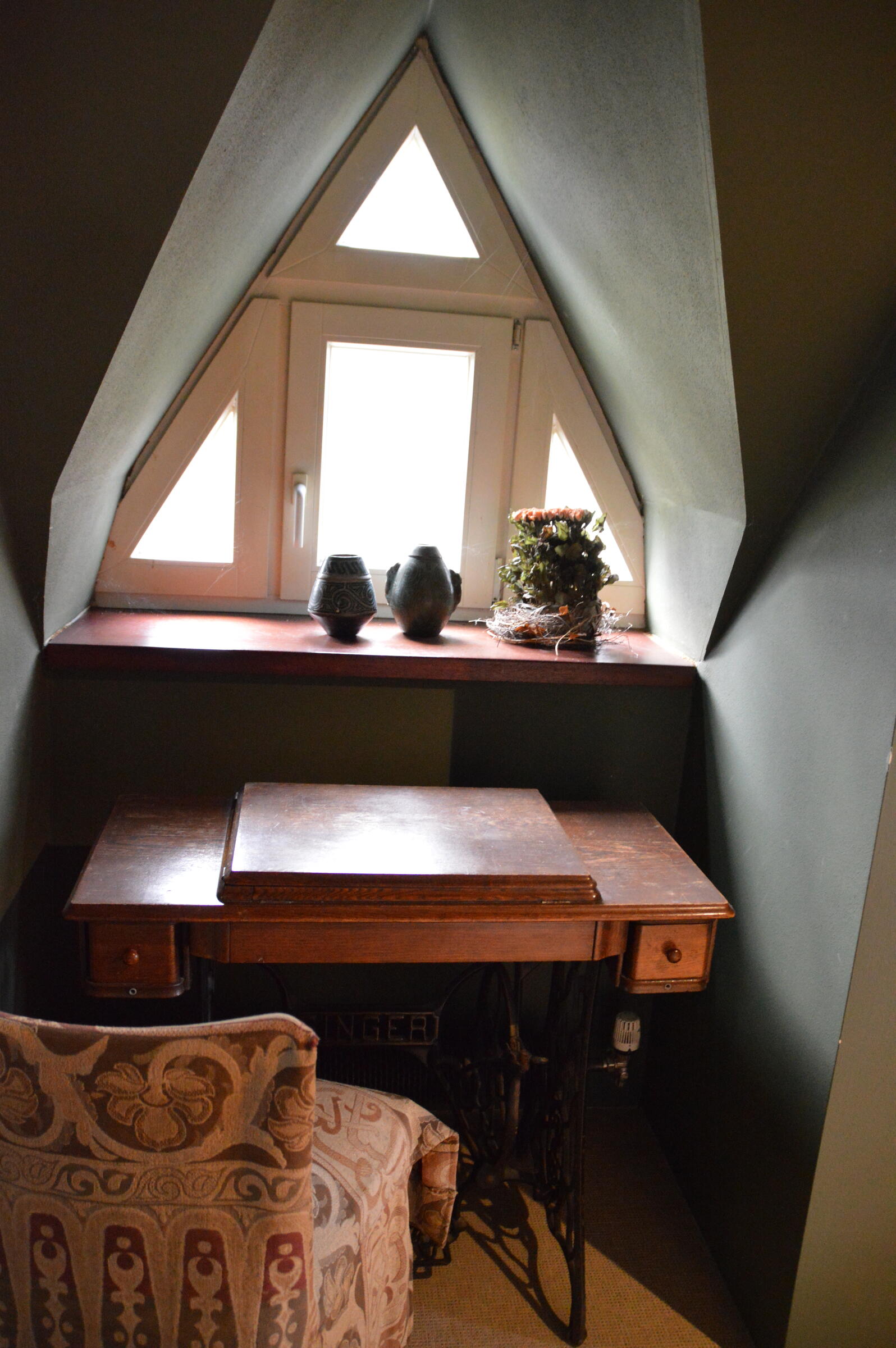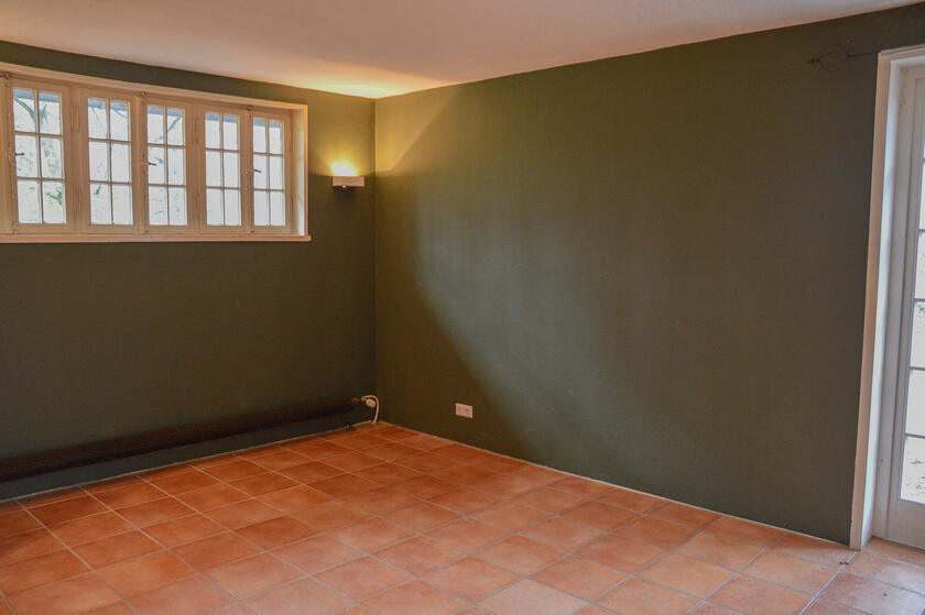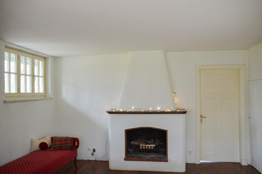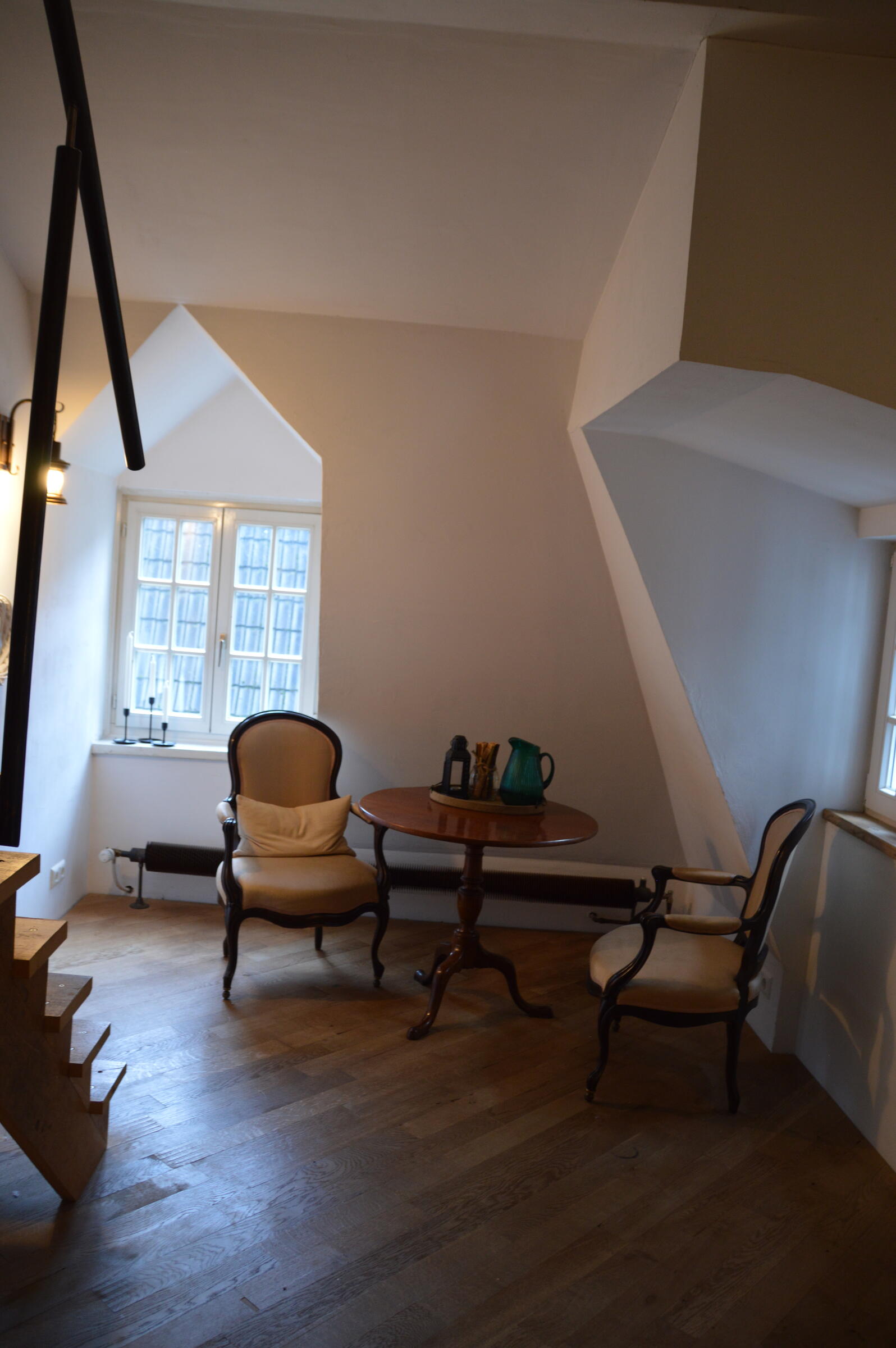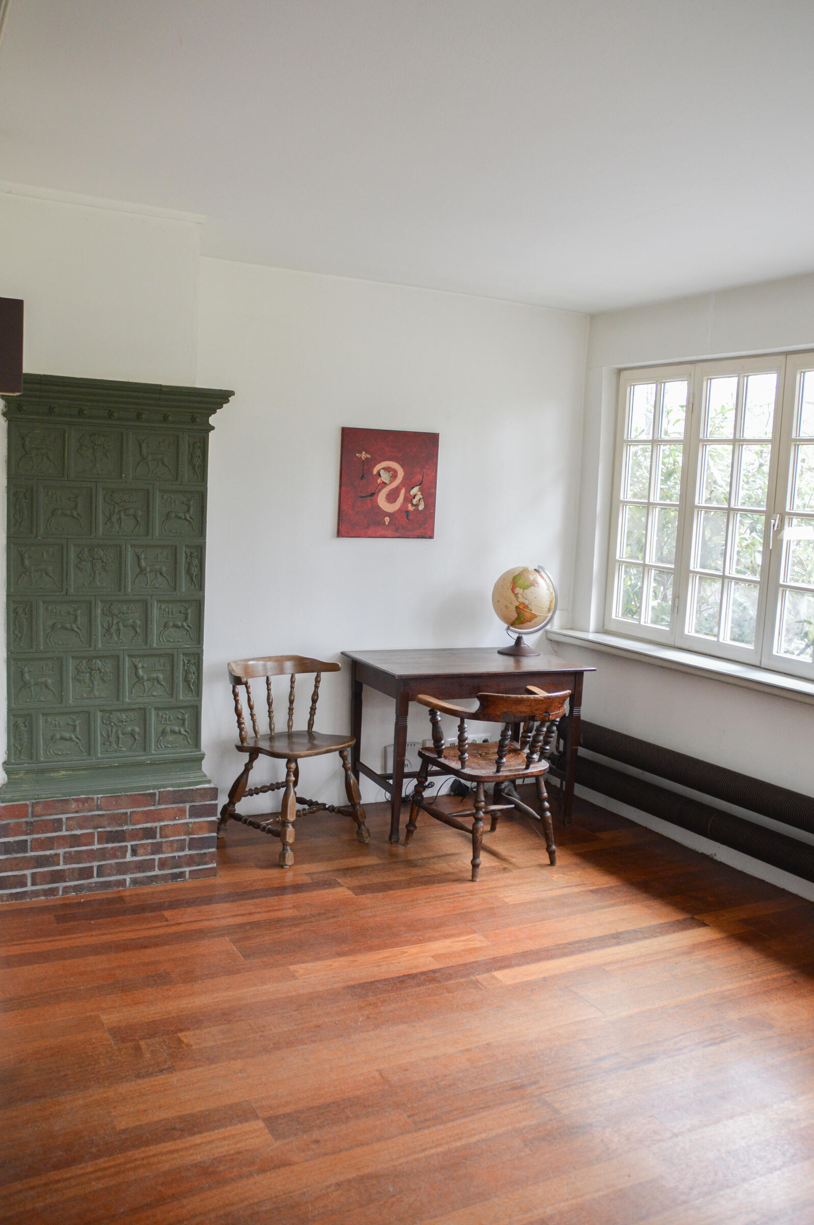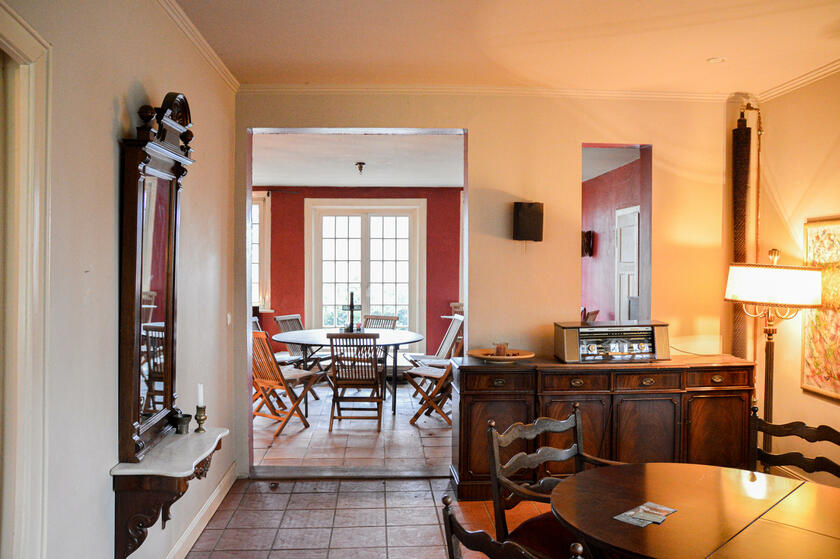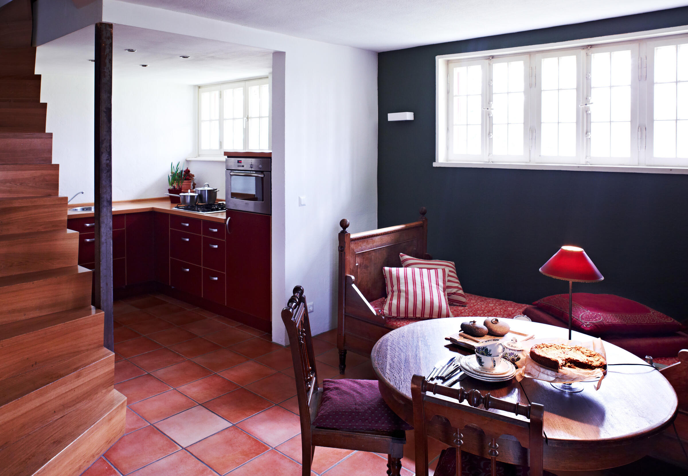 Links ab vom Flur, durch eine Tür gelangt man dann zur alten Holztreppe, die ins 2. OG und zu den beiden Appartements führt. Geradeaus geht es zunächst ins Kaminzimmer. Der echte Holzfußboden und die breite Fensterfront sowie ein alter Kachelofen und ein offener Kamin unterstreichen die Gemütlichkeit dieses Gemeinschaftsraumes. Vom Kaminzimmer ab gelangt man dann in die Suite des Hauses. Hier im EG befindet sich eine kleine, moderne, offene Küche mit allen Annehmlichkeiten einer Küche sowie ein Ess- und Wohnbereich. Die Suite ist in dunkelgrüner, roter und weißer Wandfarbe gestrichen. Der Boden ist gefliest.