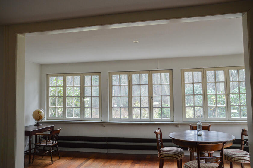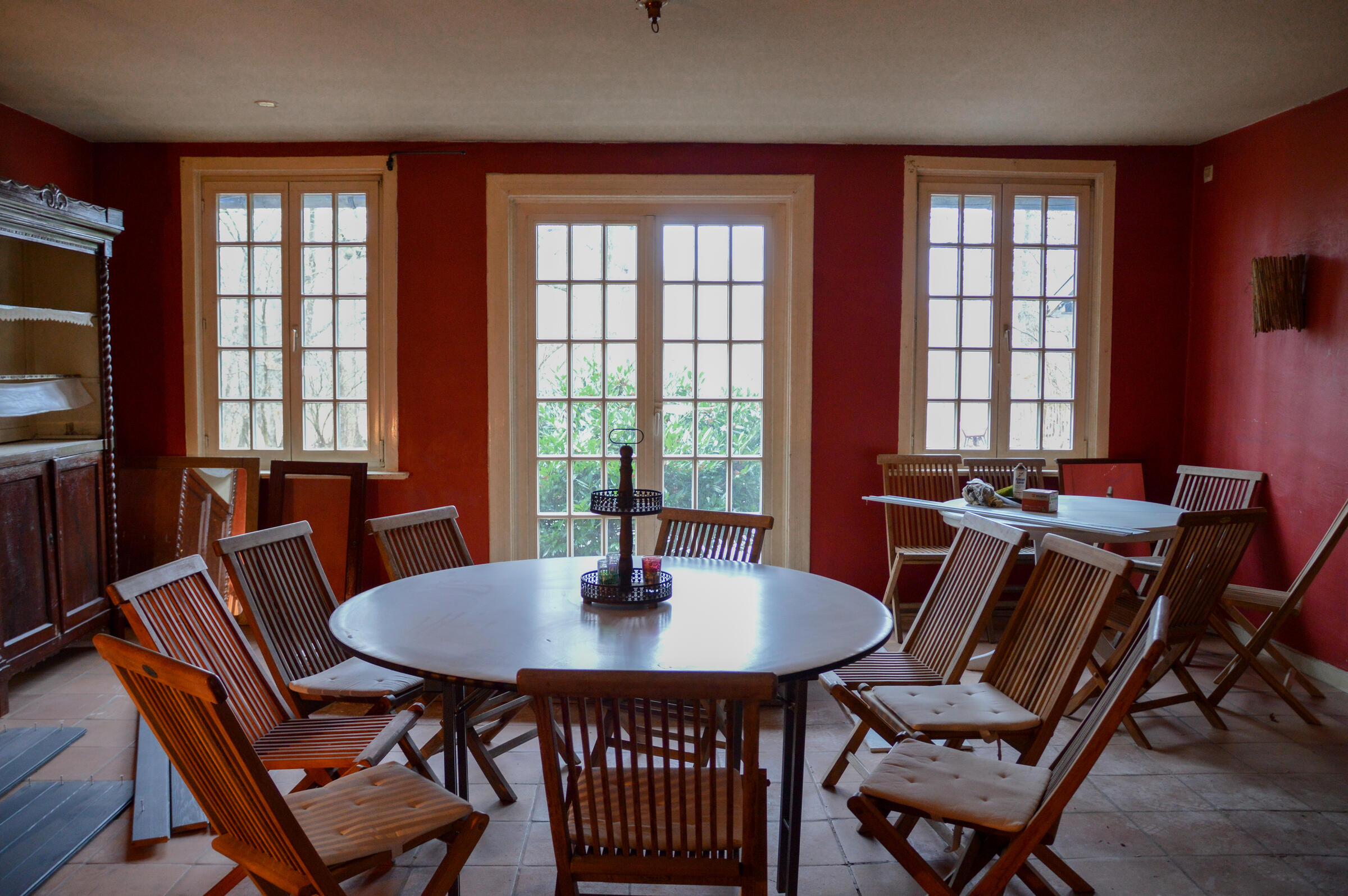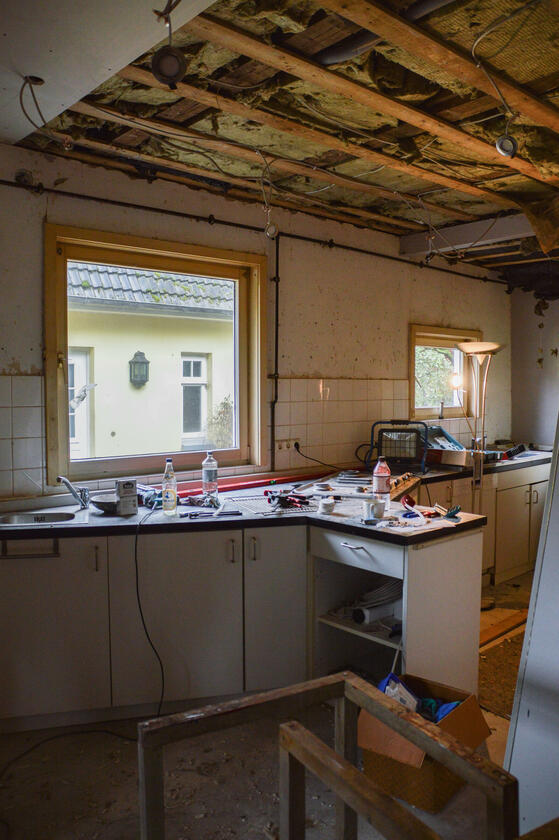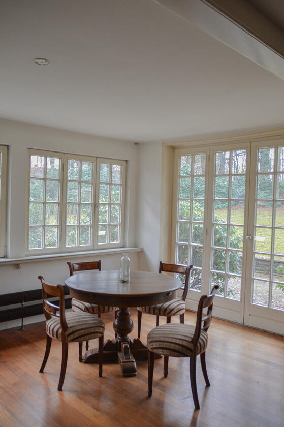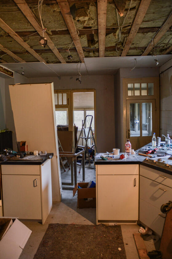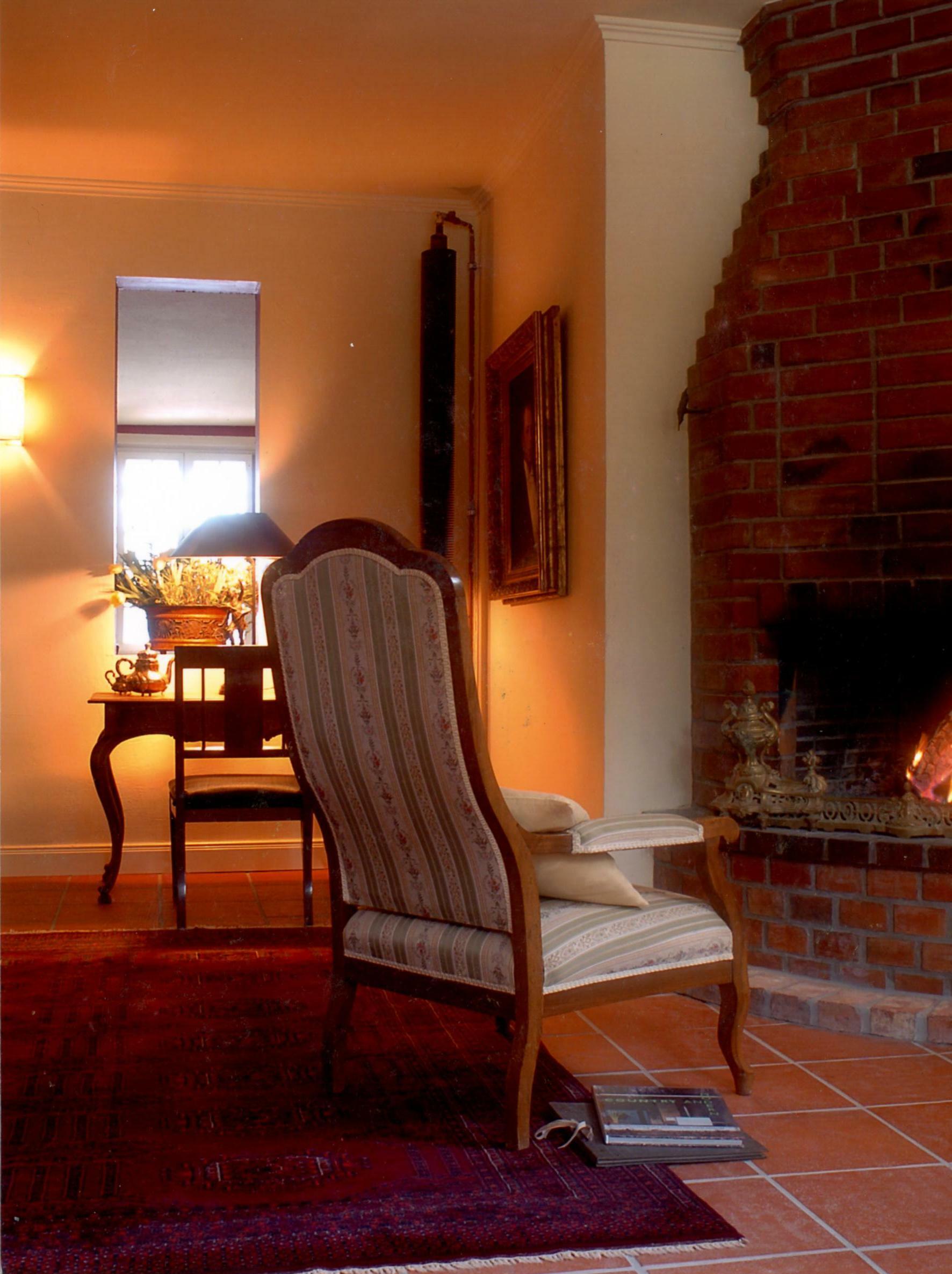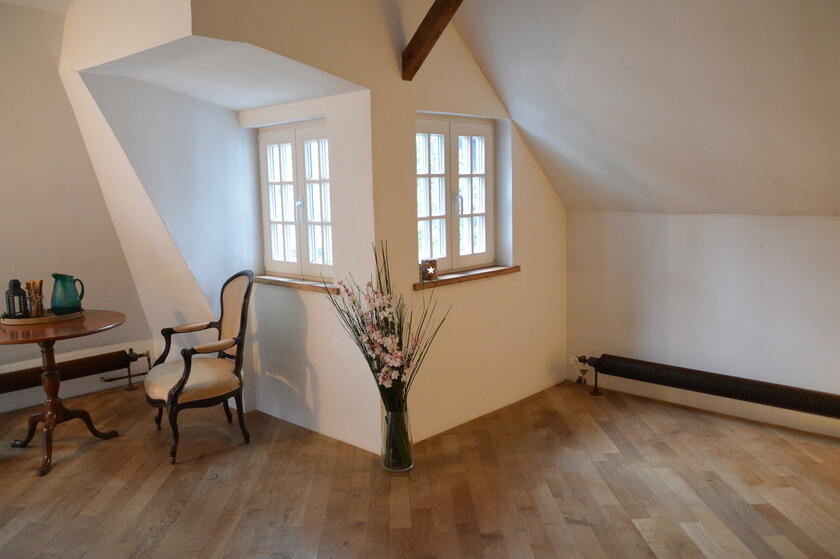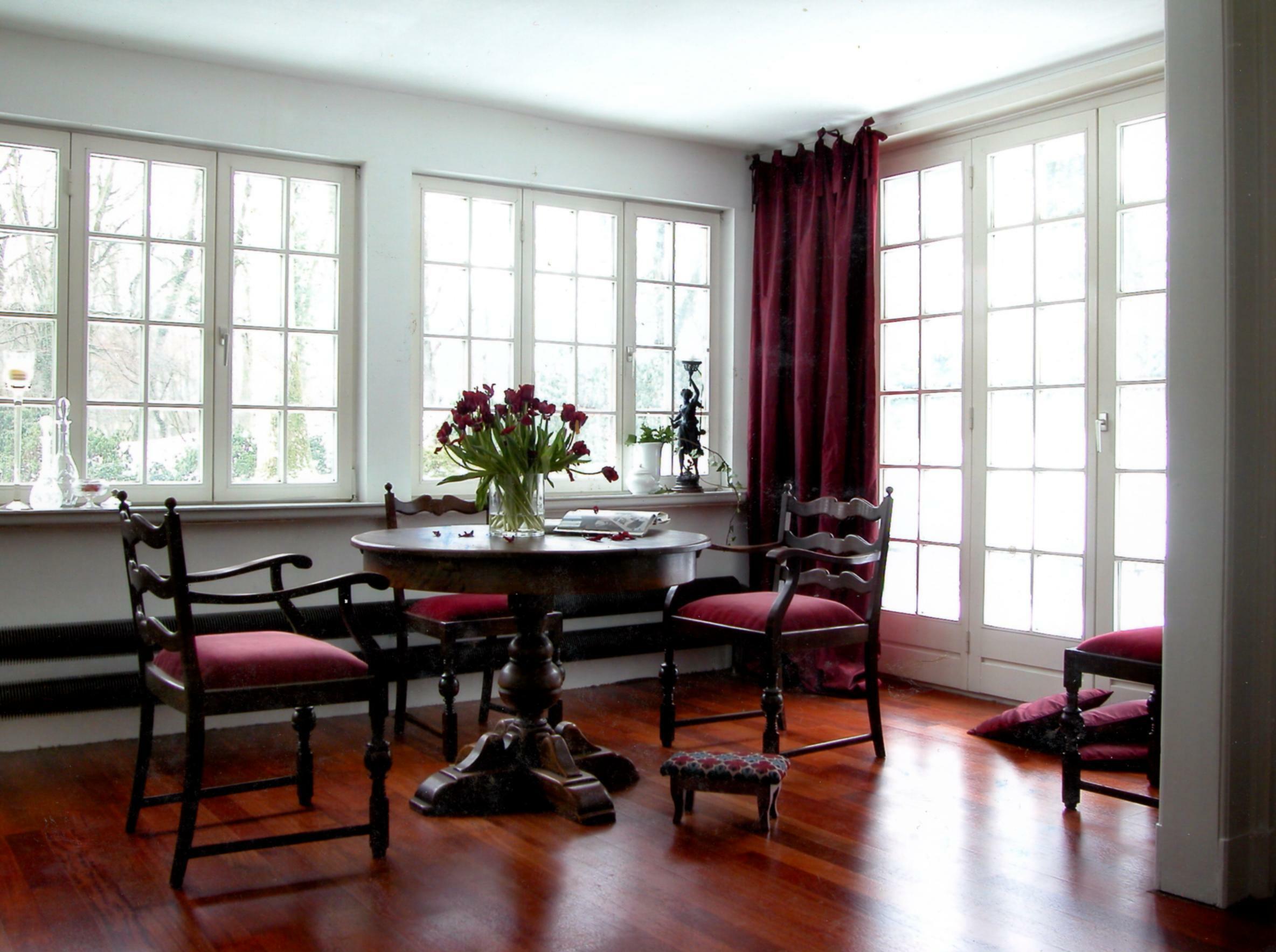 Links ab vom Flur, durch eine Tür gelangt man dann zur alten Holztreppe, die ins 2. OG und zu den beiden Appartements führt. Geradeaus geht es zunächst ins Kaminzimmer. Der echte Holzfußboden und die breite Fensterfront sowie ein alter Kachelofen und ein offener Kamin unterstreichen die Gemütlichkeit dieses Gemeinschaftsraumes. Vom Kaminzimmer ab gelangt man dann in die Suite des Hauses. Hier im EG befindet sich eine kleine, moderne, offene Küche mit allen Annehmlichkeiten einer Küche sowie ein Ess- und Wohnbereich. Die Suite ist in dunkelgrüner, roter und weißer Wandfarbe gestrichen. Der Boden ist gefliest.