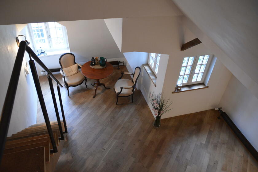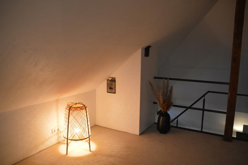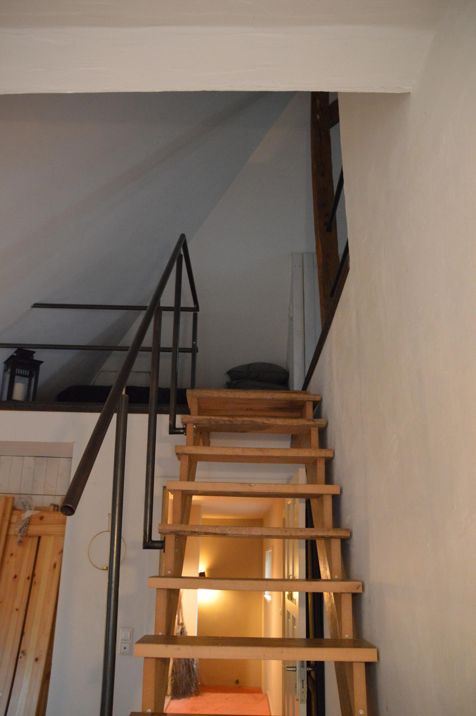 Das Maisonette-Appartement beherbergt im unteren Teil ein Doppelbett/Wahlweise auch ein nettes Sofa-Arrangement und von hier aus geht auch das Badezimmer ab, versteckt hinter einer hellen Holzwand. Die offene Treppe führt in den obigen Teil der Wohnung, der mit weißem Teppich belegt ist, die offenen Balken liegen frei und hier findet man das gemütliche Doppelbett.