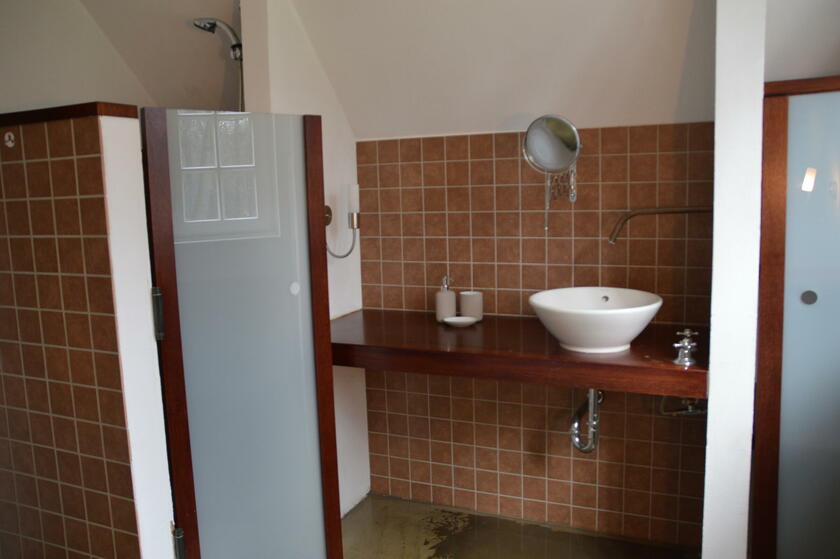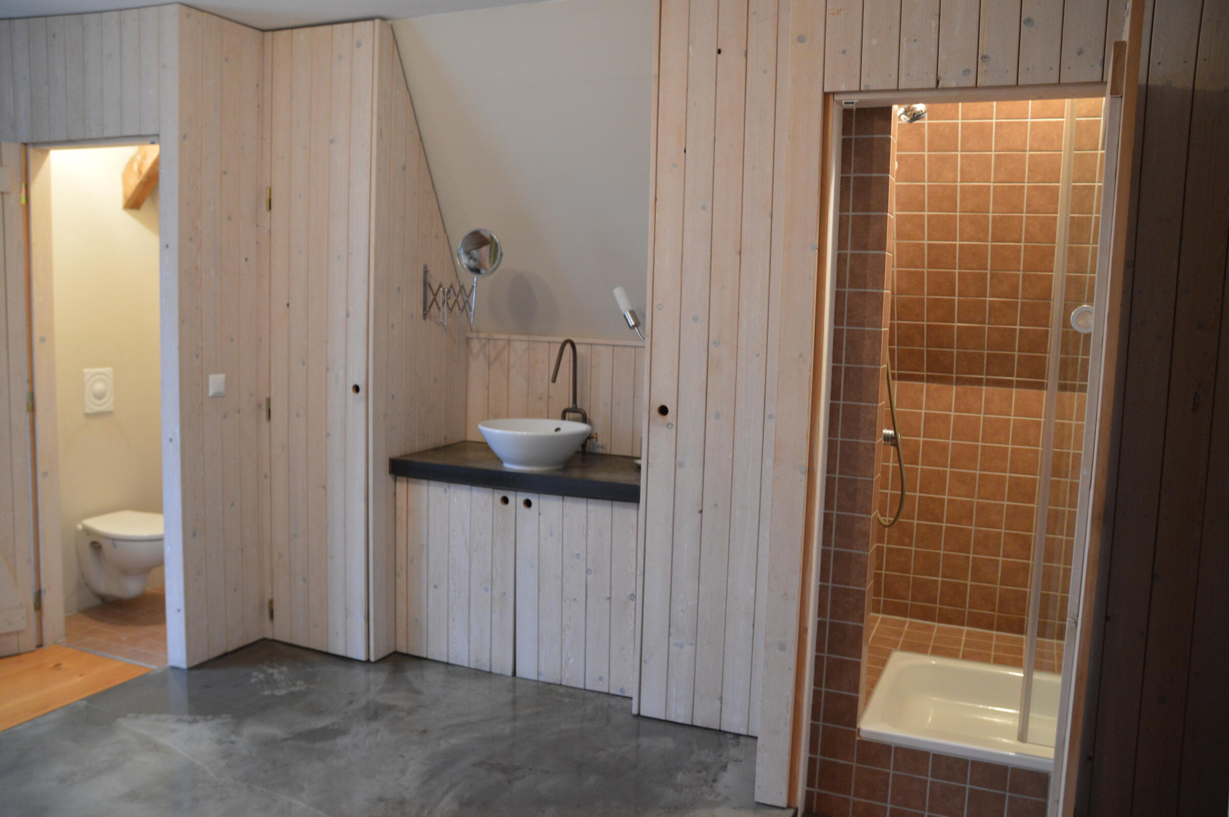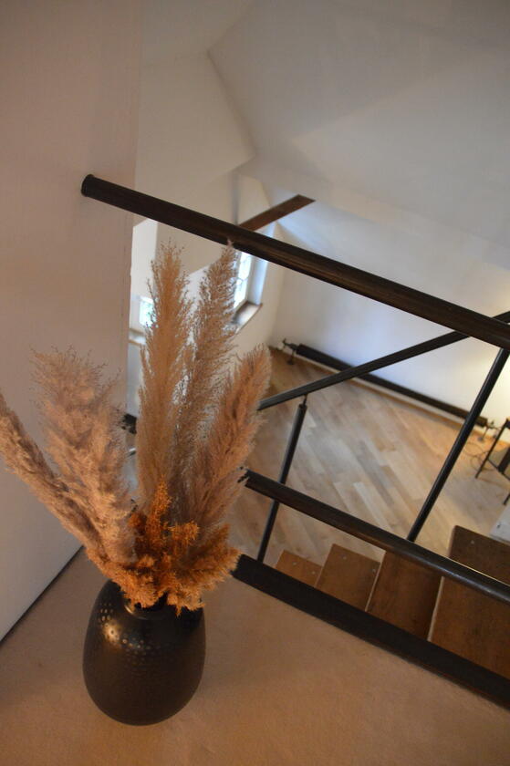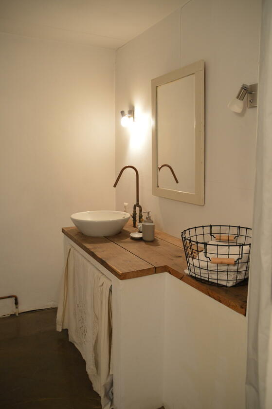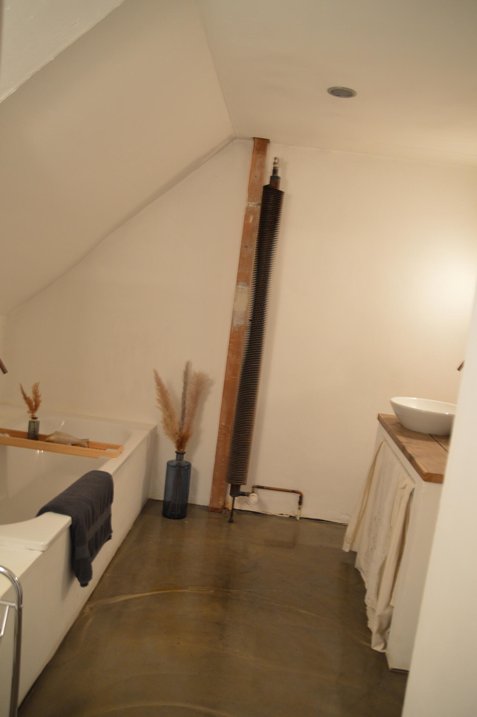 Die offene Treppe inmitten des Raumes führt in den obigen Schlafbereich sowie ins Badezimmer. Das Schlafzimmer ist eher dunkel gestrichen, aber sehr urig und gemütlich; teilweise sogar etwas verwunschen. Das Badezimmer hingegen ist hell und modern. Besonders ist in allen Badezimmern der Bodenbelag: Betonboden mit Epoxidharz aufgegossen. Dazu jeweils helle Holzelemente und schlichter Industrie-Style bei den verschiedenen Amaturen.