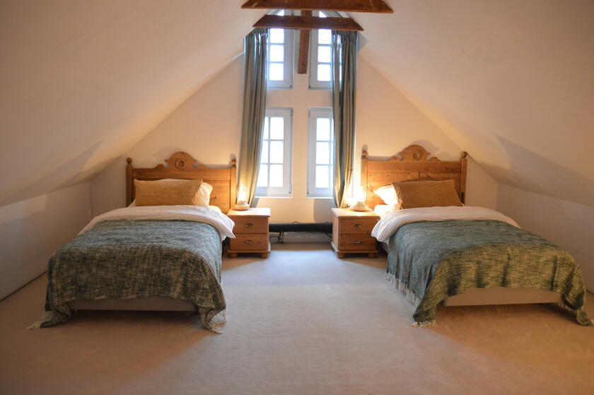 Die Holztreppe des EGs hinauf, einen mit rotem Teppichboden bestückten Flur entlang gelangt man dann zu den beiden Appartements des Cottages. Beide Räume sind mit echtem Holzfußboden ausgestattet und weiß gestrichen. Das kleinere Appartement ist mit einem großen Doppelbett ausgestattet, das Badezimmer ist en Suite und von zwei Seiten des Schlafzimmers aus rundläufig begehbar.