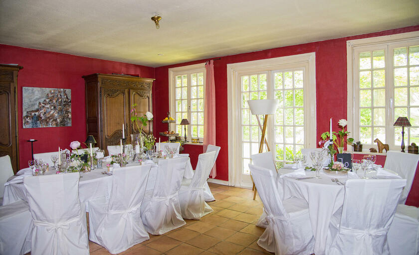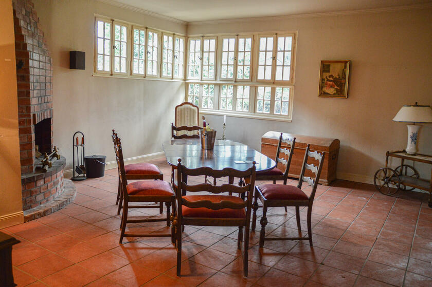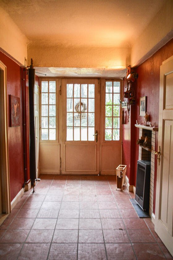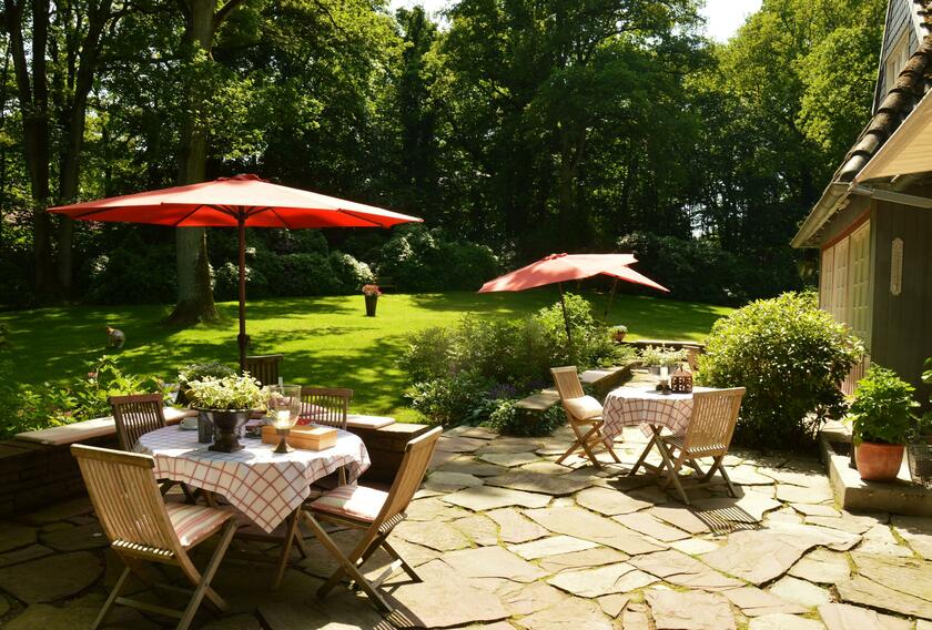 Das Cottage umgibt zwei große Terrassen einmal im vorderen und einmal in hinteren Bereich. Ein großer, parkähnlicher Garten grenzt an sowie eigenes Wald- und Koppelgebiet für unsere Pferde. Der Haupteingang ist von der Sonnenterrasse zu erreichen. Von hier aus gelangen Sie in den Flur. Rechts ab, durch einen Torbogen befindet sich dann der Saal mit angrenzender, großzügiger Event- bzw. Gemeinschaftsküche. Im hinteren Teil der Gemeinschaftsküche gibt es zwei kleinere Vorratsräume, die für Requisite o.ä. genutzt werden können. Vom Saal sowie von der Küche aus gelangen Sie auch jeweils nach draußen. Der Saal ist dunkelrot gestrichen, es ist ein Kamin vorhanden, die Lichtverhältnisse sind schummerig. Hier befindet sich ein altes Klavier sowie verschiedene, antike Möbelstücke. Der Saal ist nicht überladen und kann auch schnell geräumt werden.