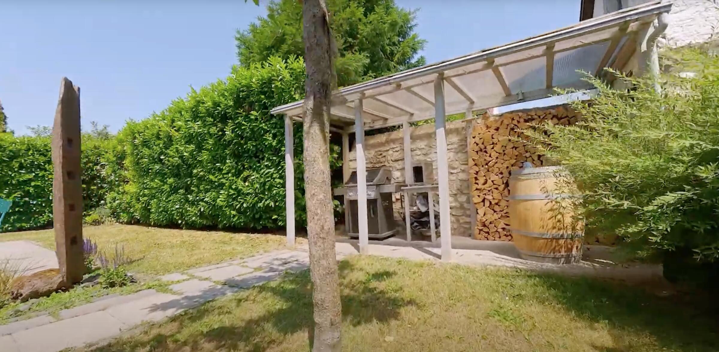 Zusätzlich ermöglichen die großzügigen Terrassen und der idyllische Garten mit alten Obstbäumen und Zypressen abwechslungsreiche Settings für verschiedene Filmstile. Die umliegende Natursteinmauer und der große Rasen verstärken das harmonische Gesamtbild der Außenbereiche.