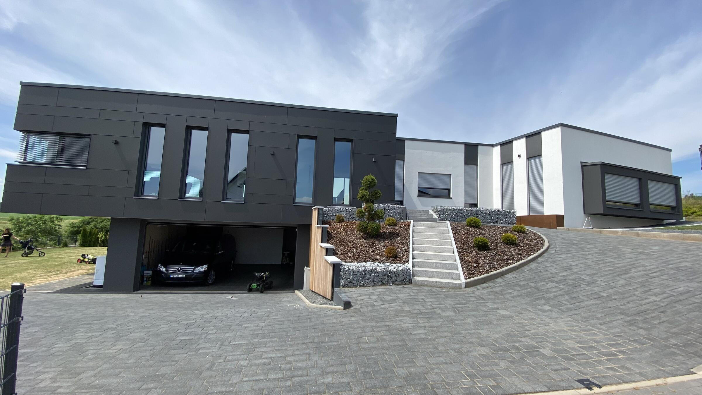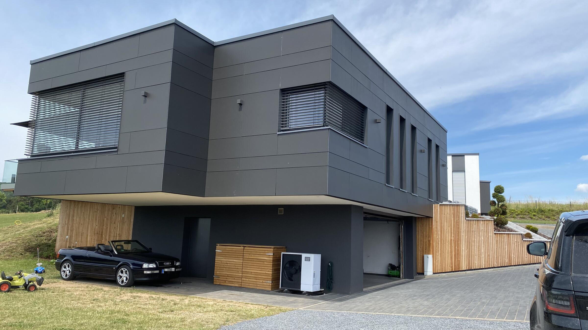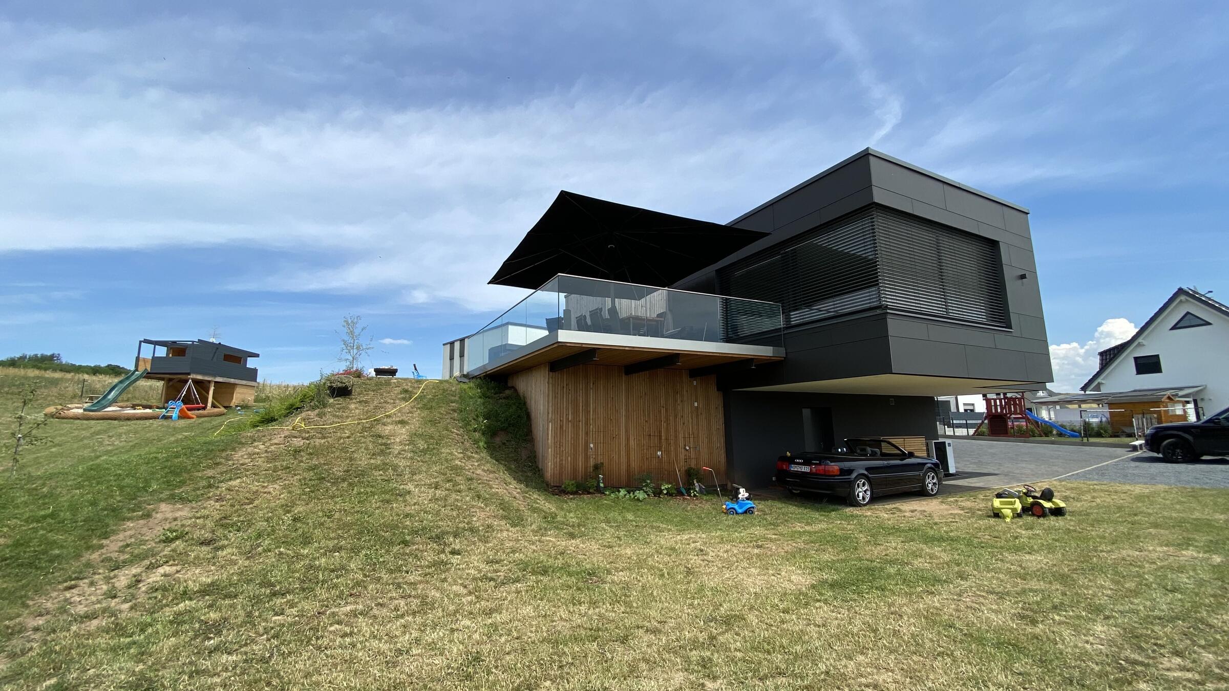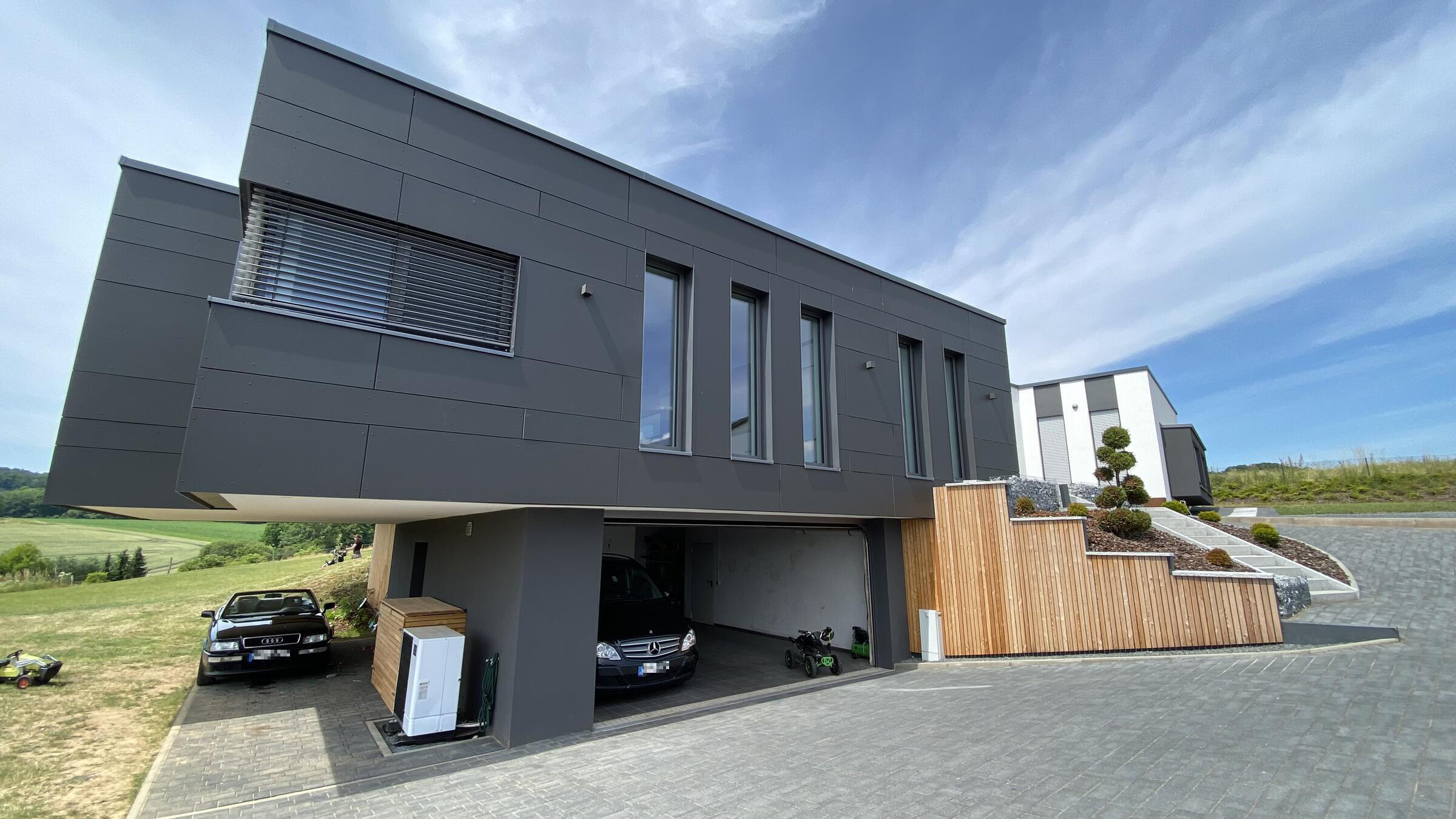 Unser Einfamilienhaus "Straight View" steht für moderne, gradlinige Architektur mit einem starken Bezug zum Außenraum. Ein konstruktives Highlight stellt der 4,5 m auskragende Wohnbereich dar. Eine Vorhangfassade aus anthrazitfarbenen Eternit®-Platten für den öffentlichen Wohnbereich, ein weißes Wärmedämmverbundsystem mit grauen Farbakzenten für den privaten Wohnbereich und eine senkrechte Holzverschalung aus Lärchenholz an der »Creativ Box« gliedern das Haus. Dank der modernen Haustechnik ist das Haus unabhängig von Strom und fossilen Brennstoffen. Eine tolle und moderne Kulisse.