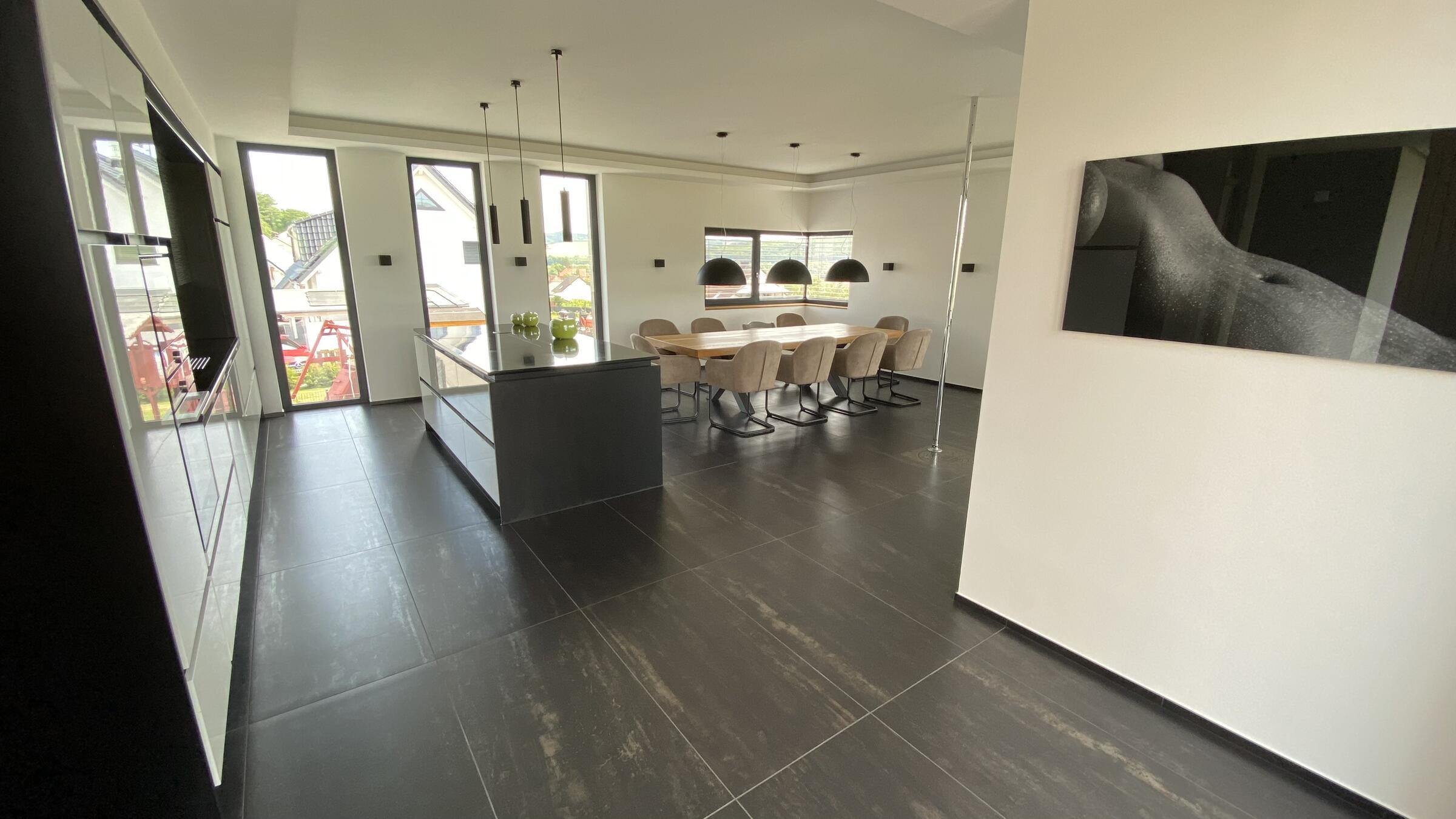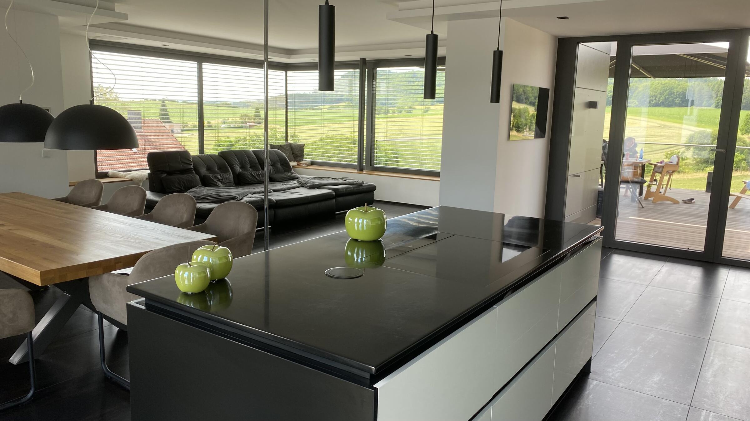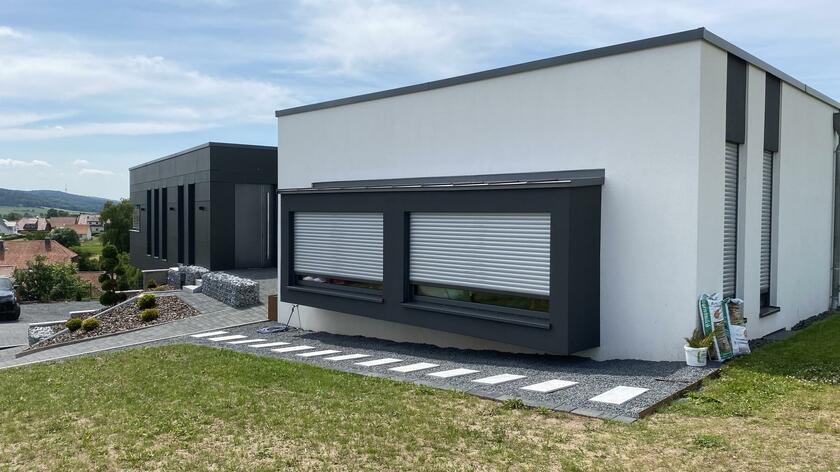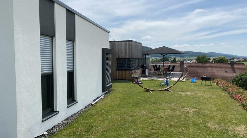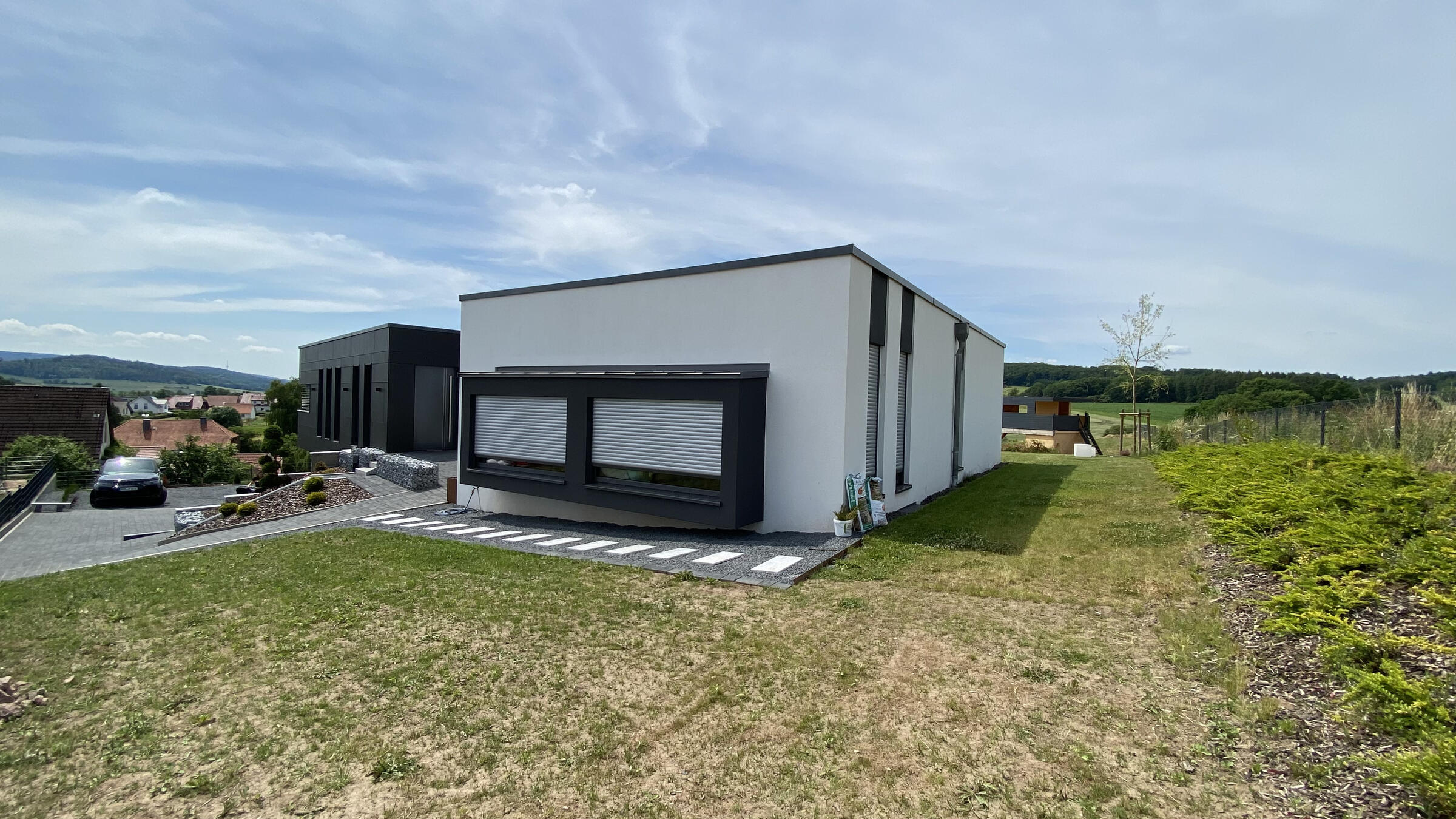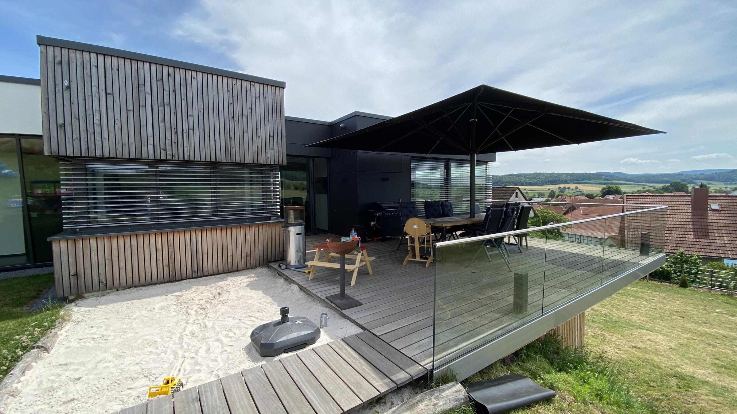 Unser Einfamilienhaus "Straight View" steht für moderne, gradlinige Architektur mit einem starken Bezug zum Außenraum. Ein konstruktives Highlight stellt der 4,5 m auskragende Wohnbereich dar. Eine Vorhangfassade aus anthrazitfarbenen Eternit®-Platten für den öffentlichen Wohnbereich, ein weißes Wärmedämmverbundsystem mit grauen Farbakzenten für den privaten Wohnbereich und eine senkrechte Holzverschalung aus Lärchenholz an der »Creativ Box« gliedern das Haus. Dank der modernen Haustechnik ist das Haus unabhängig von Strom und fossilen Brennstoffen. Eine tolle und moderne Kulisse.