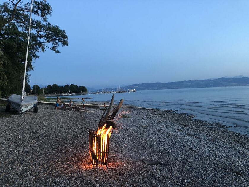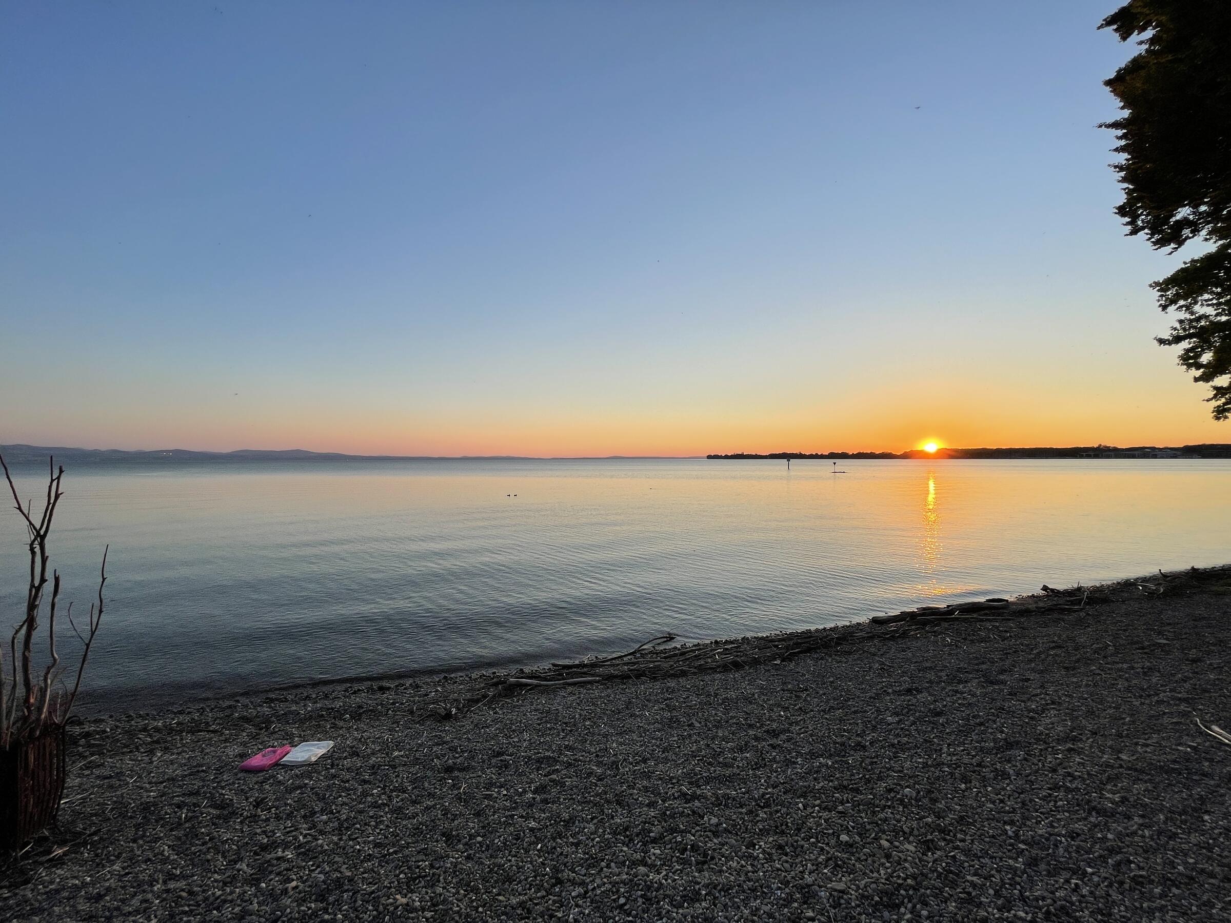 Also on the lawn one can play volleyball, beach tennis, or badminton if one likes, but this equipment can be easily dismantled if necessary. When I was young I used to play football with my friends there, although I often had to go to my neighbors to get the ball back. Two parallel bars have been mounted between the walnut tree and the century old beech tree. I have 4 daughters and everyone is a gymnast enthusiast! Further down the lawn is also a XXL trampoline with a pirate tower and a slide! On the lake are 2 terraces: a small one with a very old round table fixed in reinforced cement and a larger one which contains a table for at least 10 people. From here in the evening one can enjoy the sunset from May to October and one can build a bonfire if the wind comes from the land.