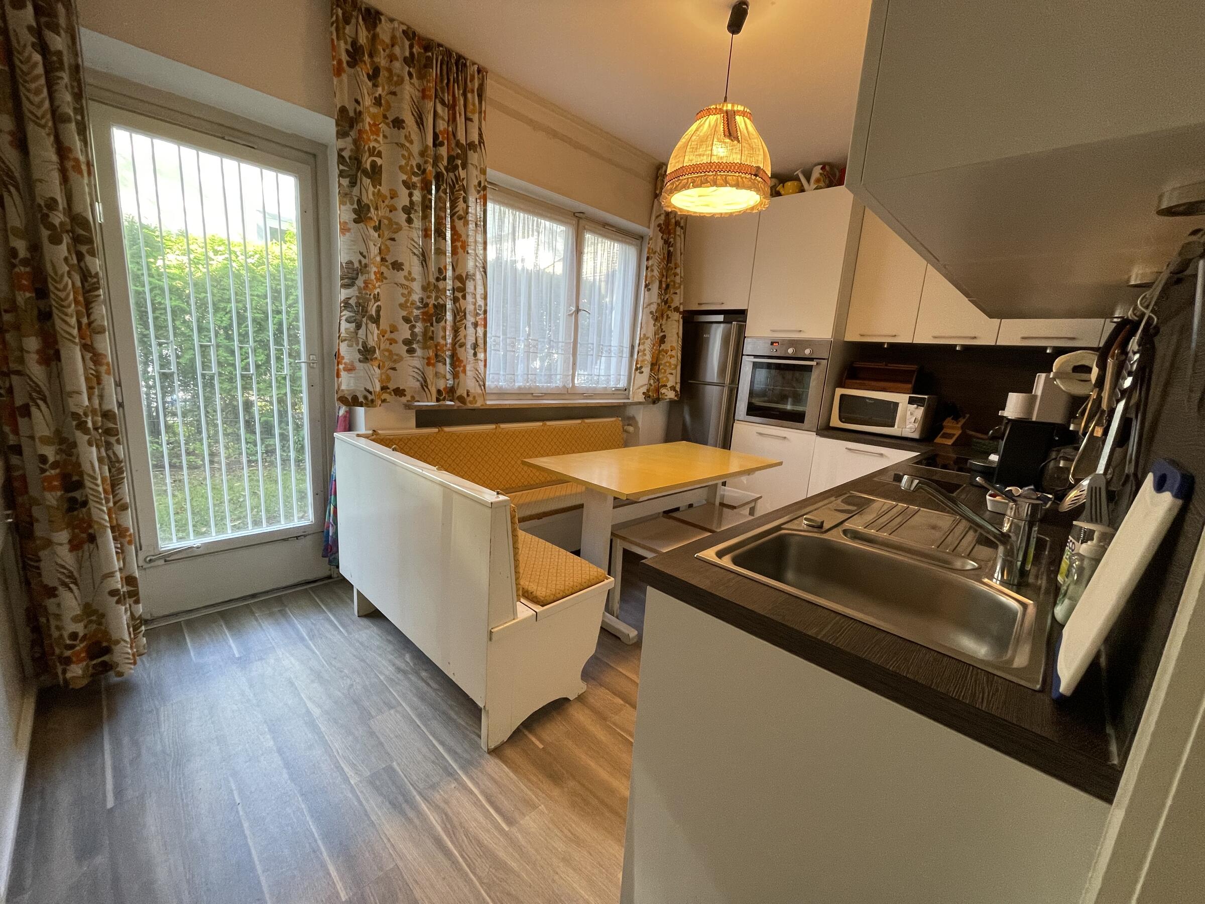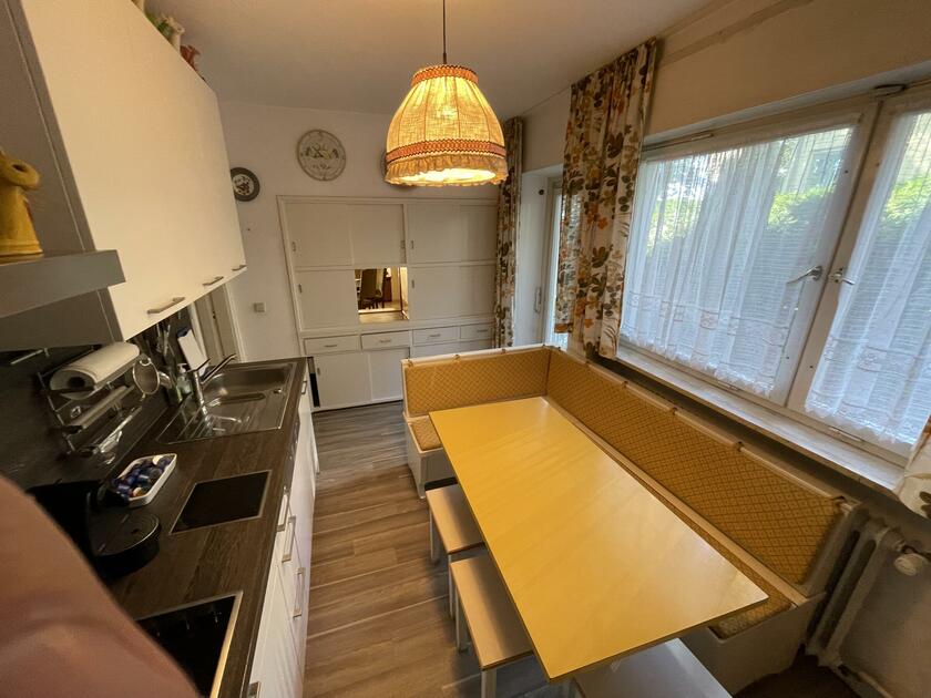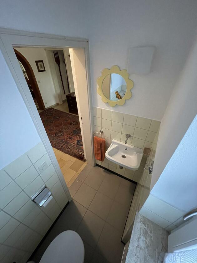 The ground floor apartment has a separate entrance which is accessible from the courtyard. Near the entrance is a small guest bathroom. On the left, at the end of the corridor, are 2 bedrooms and a renovated full bathroom with a bathtub. One bedroom contains a double bed and the larger room featuring a double bed and a pullout sofa. On the other side of the corridor is a renovated eat- in kitchen which leads to the manicured backyard. This is very convenient for parties or grill evenings outside.