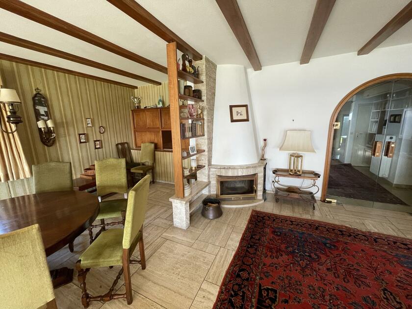 Through an arched glass door one reaches the first level of the living room from which a view of the complete magnificent backyard and the lake is visible. This room contains a bookcase, a fireplace, and a round wooden table for 8-10 people. Between the kitchen and the dining area is a wooden panel which can be opened from both sides to transfer dishes, glasses, bottles of water, wine etc. An additional 2 steps lead to the second level of the living room containing a large sofa, a piano, and a TV and bar corner. On this level is the master bedroom with its own bathroom and another bedroom used as a gym for my 2 sons.