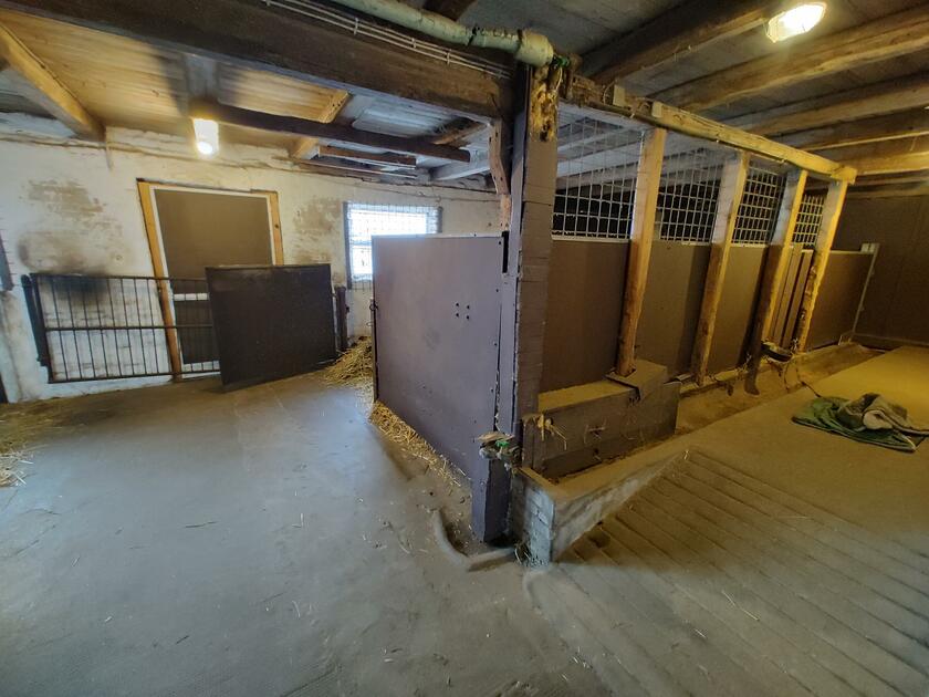 Das komplett neu renovierte Wohnhaus auf dem Bauernhof verfügt über ein großes Wohnzimmer, ein großes Esszimmer mit Küchendurchgang, moderne Holzmöbel, Sauna, Tiefgarage und eine große moderne Küche. Die Wände sind mit Pferdefotografien und Gemälden geschmückt. Das Haus ist von einem großen Garten umgeben, der von hohen Bäumen und Sträuchern gesäumt ist und einen atemberaubenden Blick auf die Landschaft bietet.