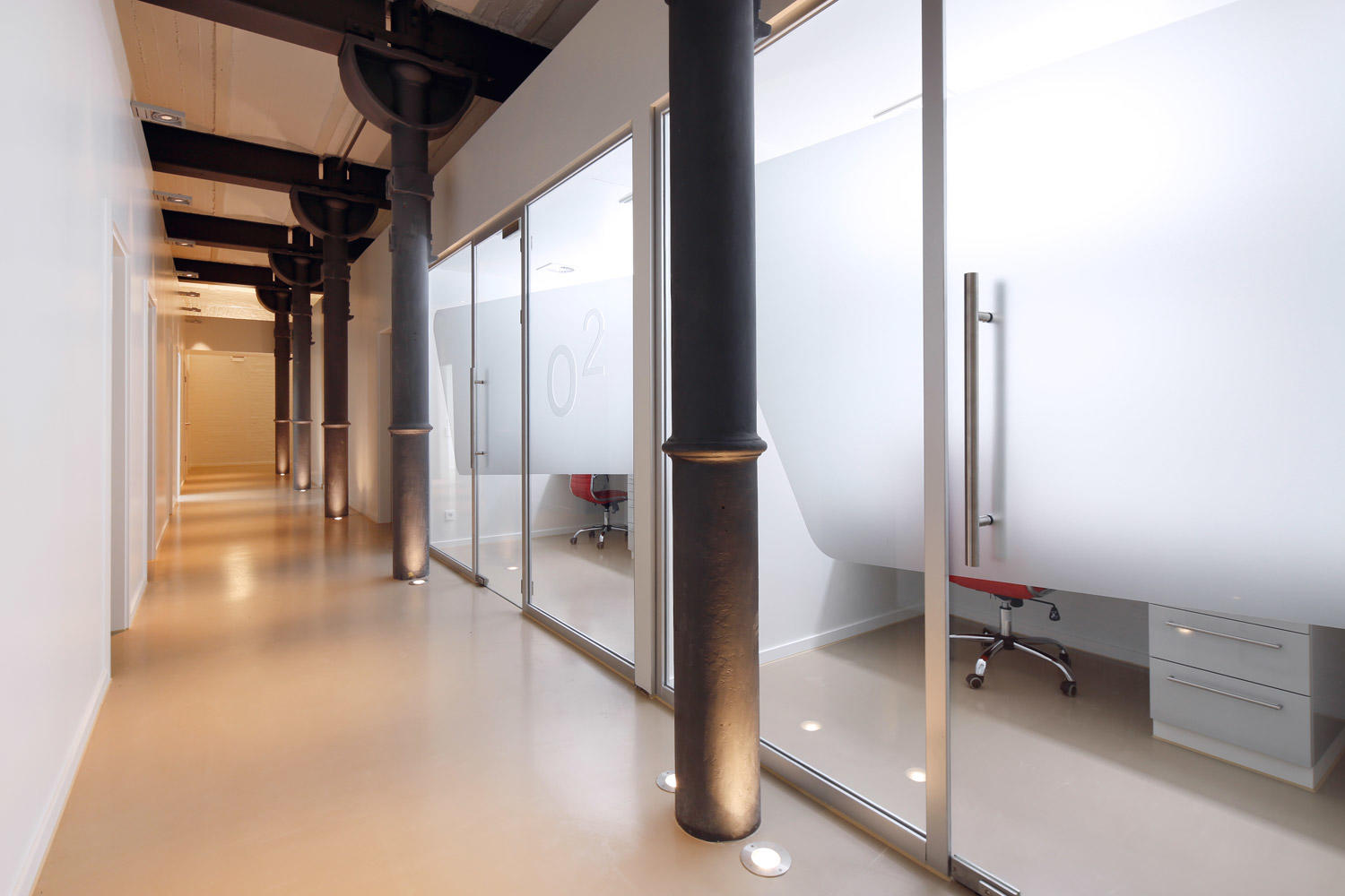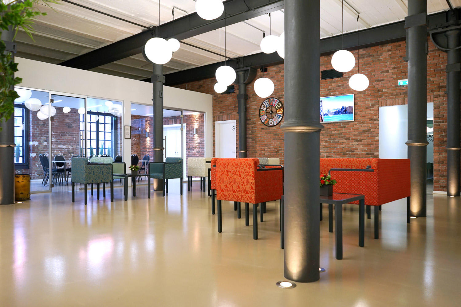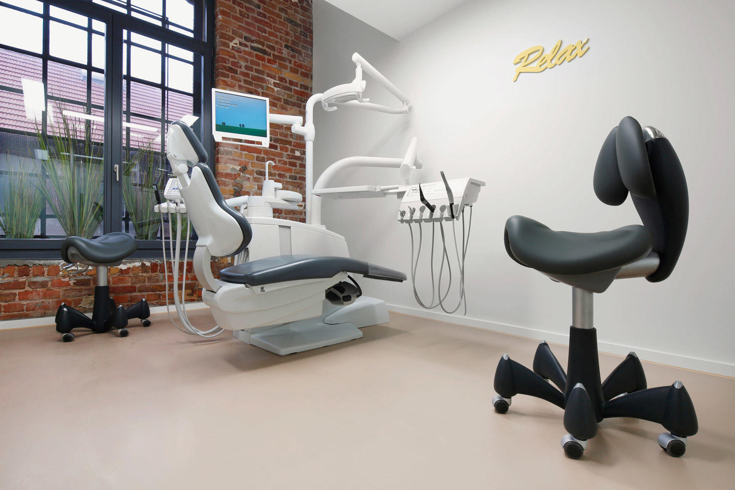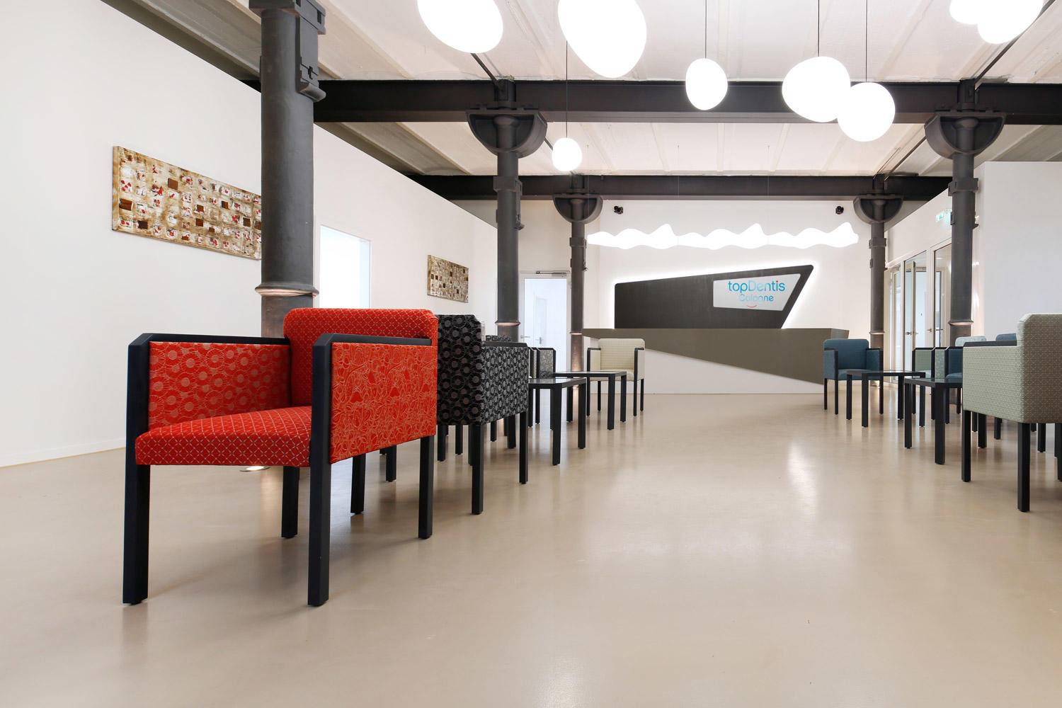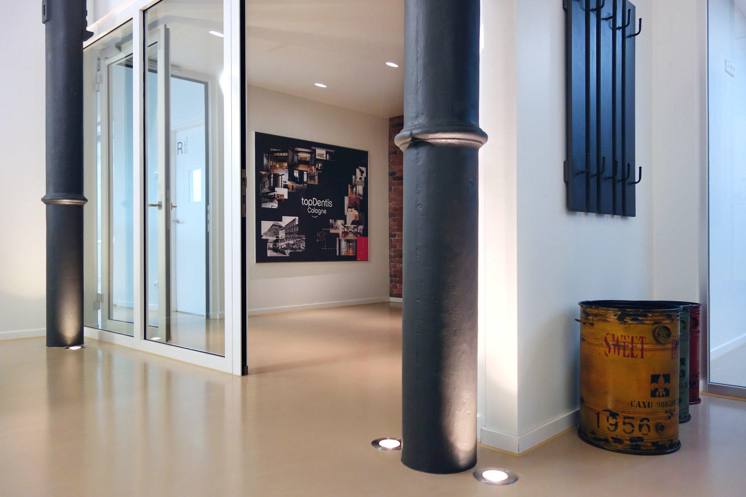 Topmoderne Zahnarztpraxis mit großem Empfangsbereich im Fabrikstil. Der loftartige Eindruck wird von den gusseisernen Trägerstützen bei einer Raumhöhe von 5 m komplettiert. Die 2 Gänge stechen architektonisch heraus, hier gehen fast alle Behandlungszimmer ab. Im vorderen Bereich sind diese lichtdurchflutet. Auf ca. 650 m² Gesamtfläche bieten sich viele unterschiedliche Motive, von stylisch loftartig bis modern kühl. Es sind ebenfalls Schulungsräume und Büroräume vorhanden. Der Außenbereich beschreibt ein altes Fabrikgelände, mit Parkplätzen und weiteren Backsteingebäuden.