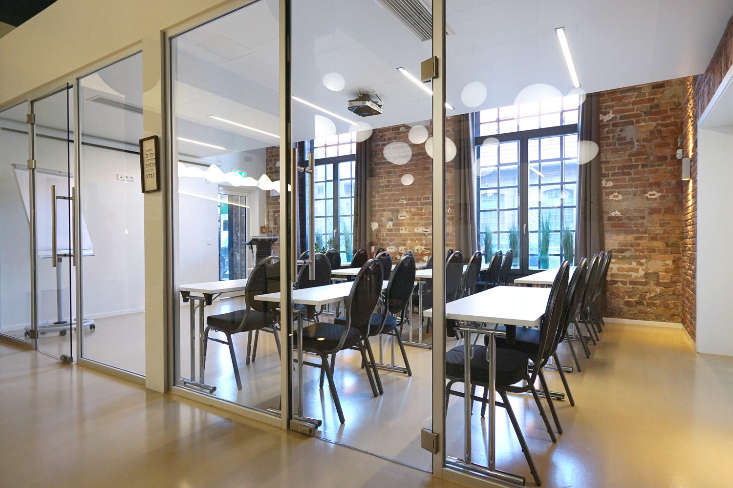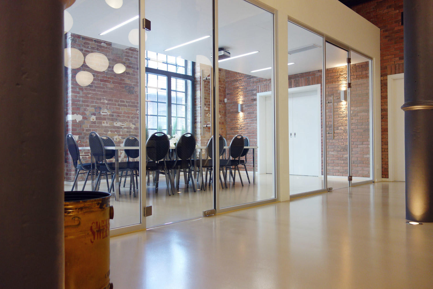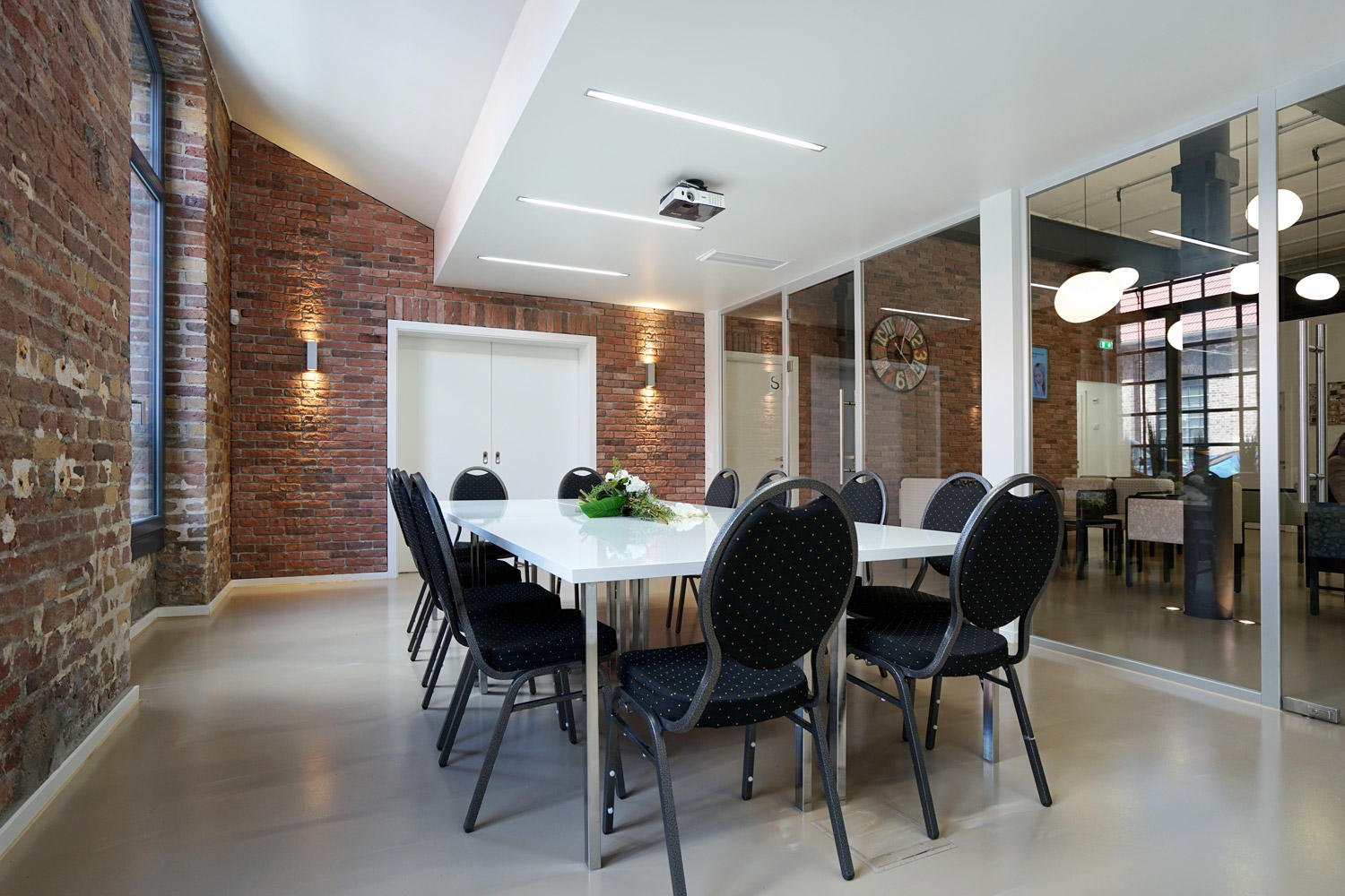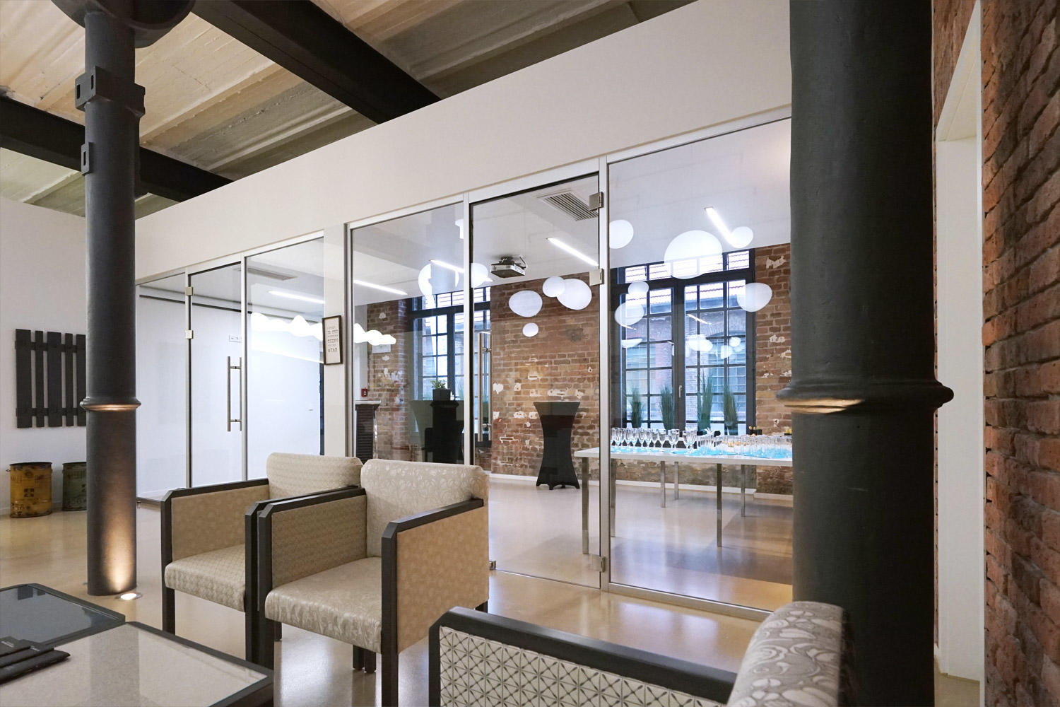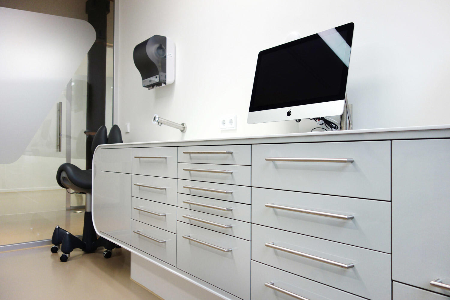Topmoderne Zahnarztpraxis mit großem Empfangsbereich im Fabrikstil. Der loftartige Eindruck wird von den gusseisernen Trägerstützen bei einer Raumhöhe von 5 m komplettiert. Die 2 Gänge stechen architektonisch heraus, hier gehen fast alle Behandlungszimmer ab. Im vorderen Bereich sind diese lichtdurchflutet. Auf ca. 650 m² Gesamtfläche bieten sich viele unterschiedliche Motive, von stylisch loftartig bis modern kühl. Es sind ebenfalls Schulungsräume und Büroräume vorhanden. Der Außenbereich beschreibt ein altes Fabrikgelände, mit Parkplätzen und weiteren Backsteingebäuden.