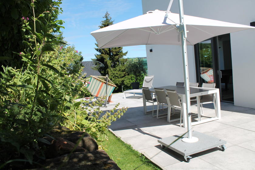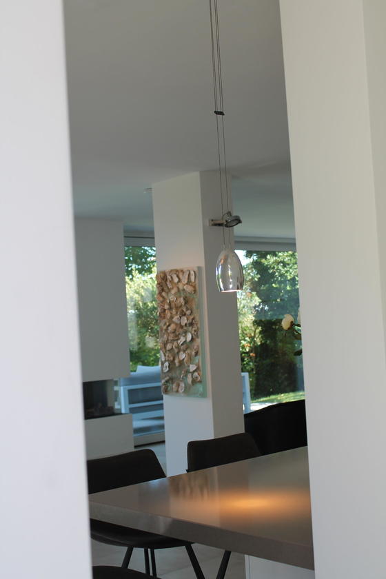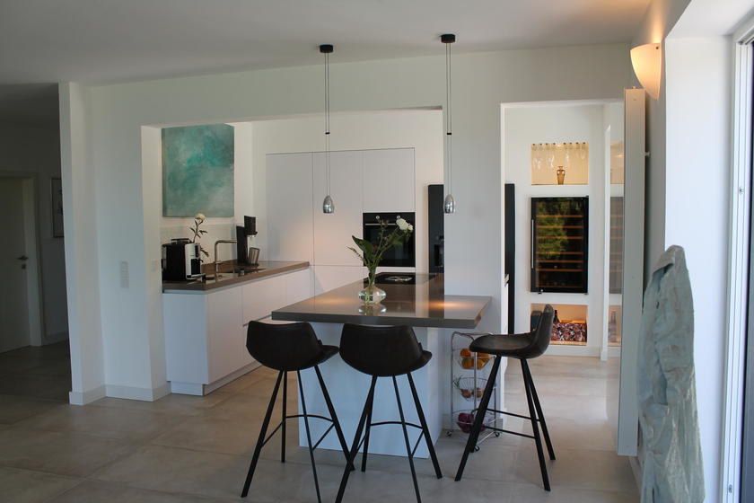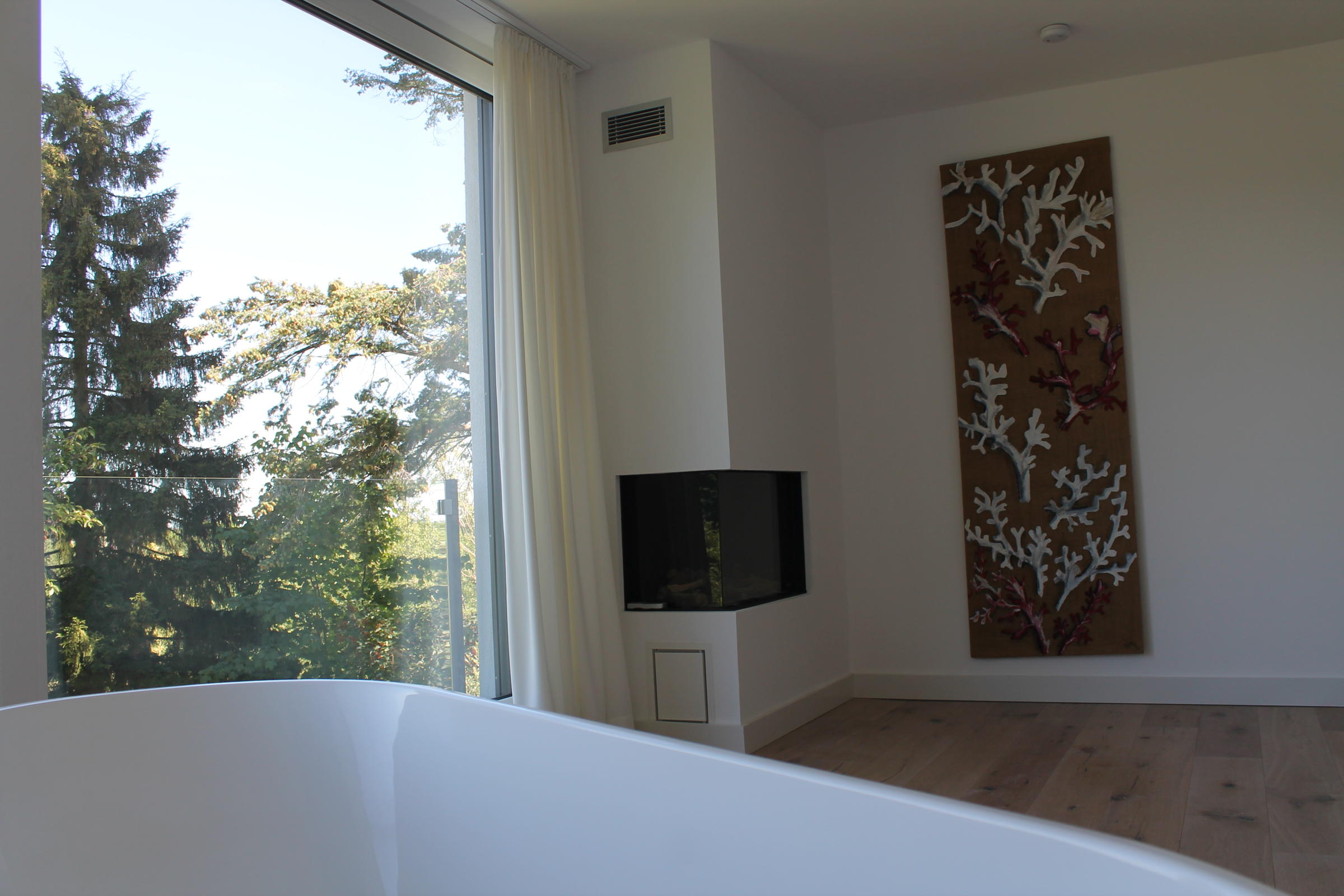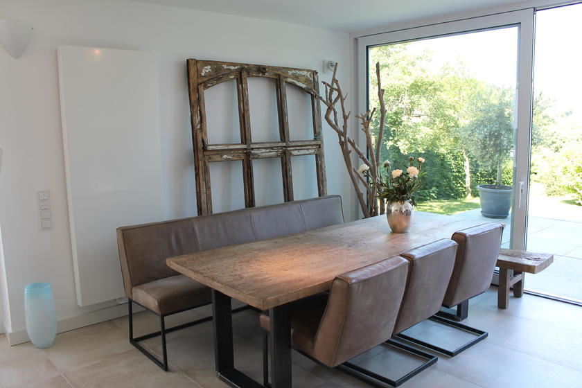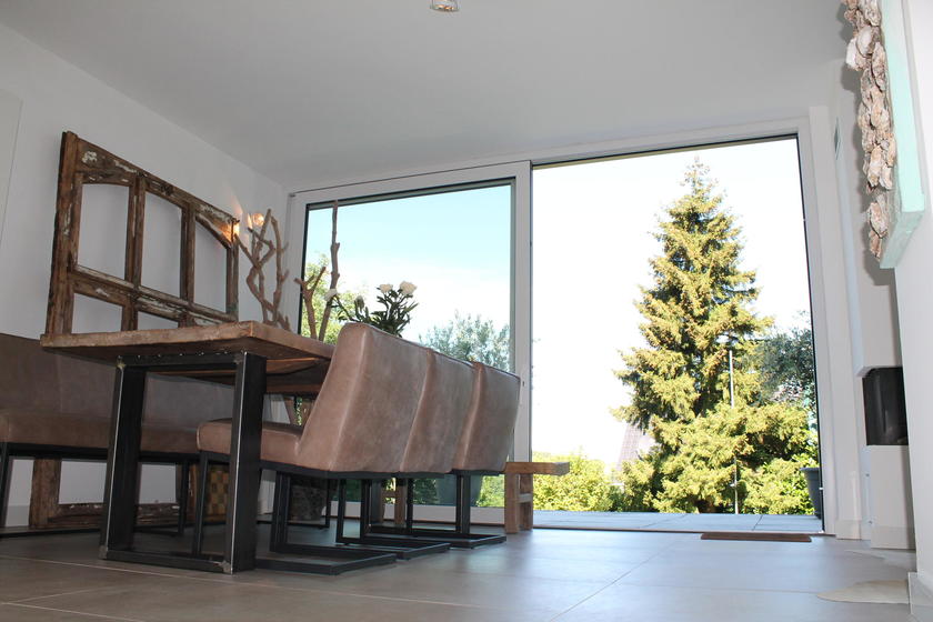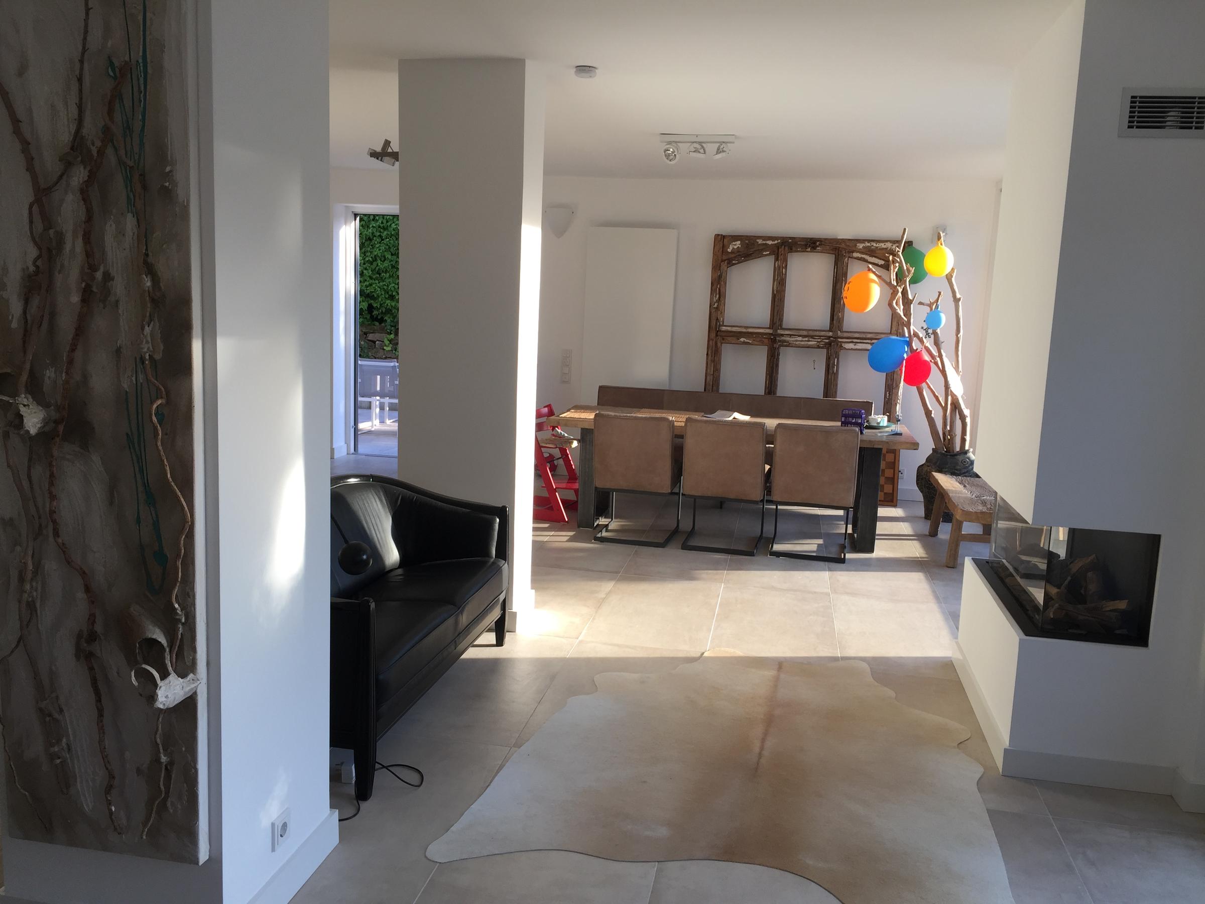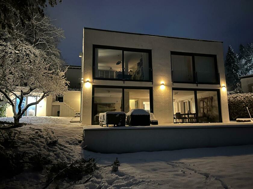 Das edel gestaltete Haus hat einen offenen Wohn-, Küchen- und Essbereich von 90 m² Größe mit Gaskamin. Durch bodentiefe Fenster (Hebe-Schiebeanlagen) kommt man von dort aus auf alle Terrassen und in den Garten. Das freistehende, nach Süden und Westen ausgerichtete Haus ist rundum von Terrassen und Garten umgeben. Das Grundstück liegt in direkter Nähe zu Wald, Pferden, Hochlandrindern und Schafen. Es ist nicht einsehbar und bietet weiten Fernblick.