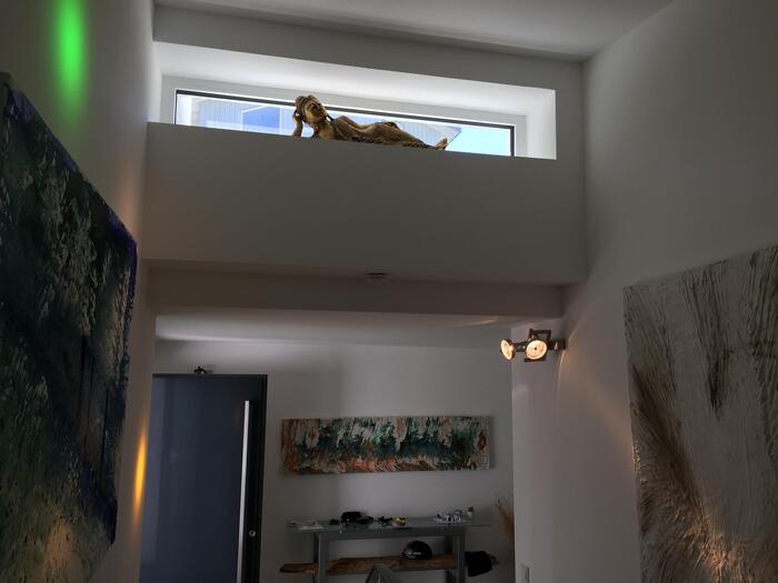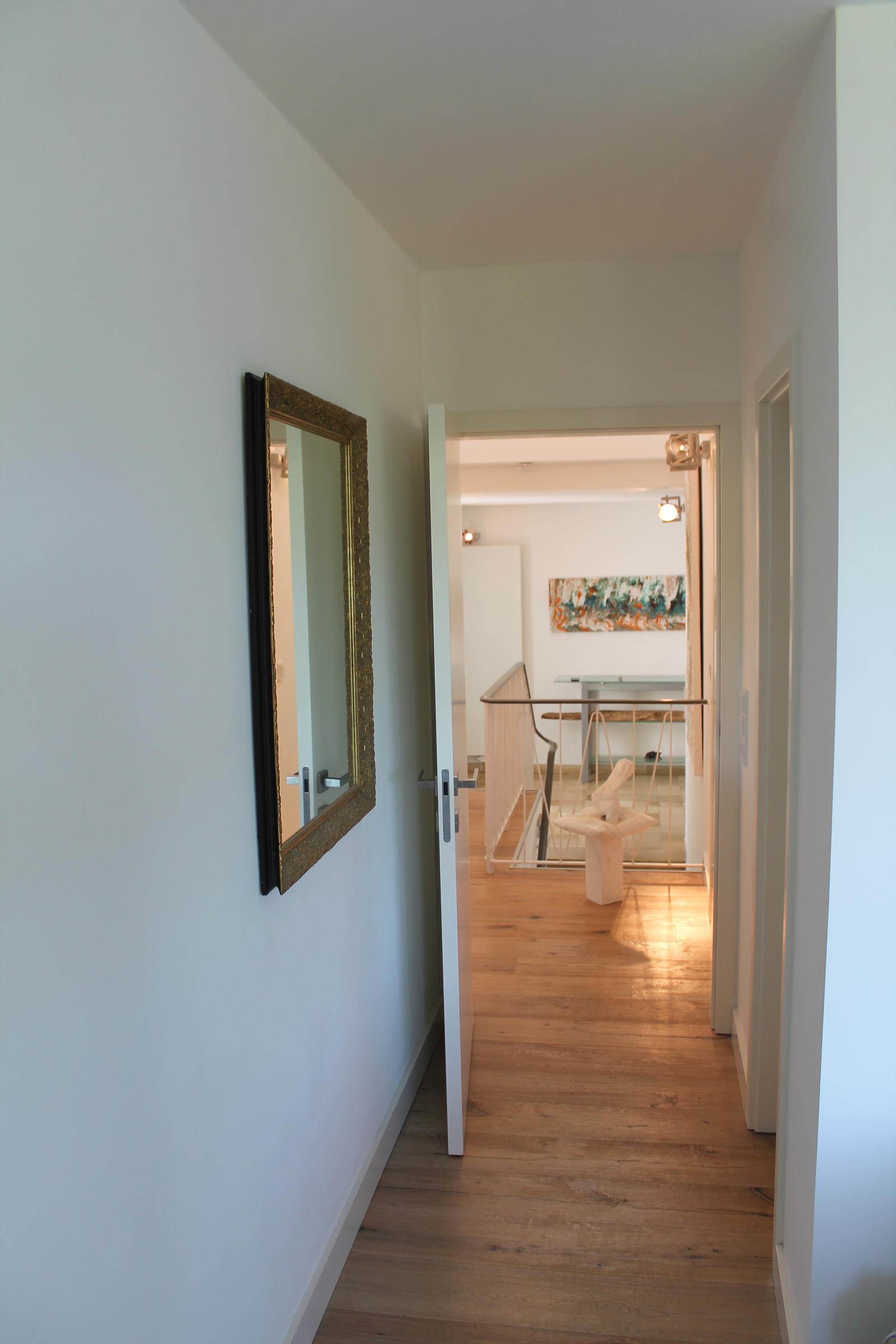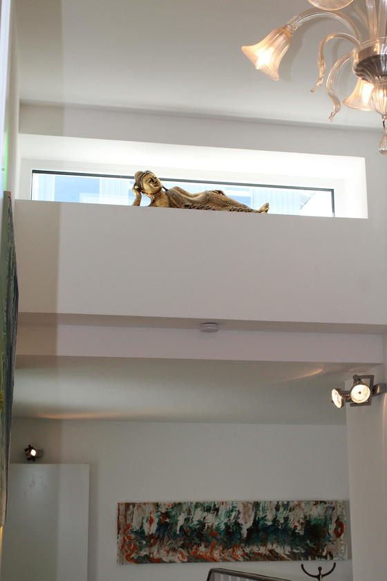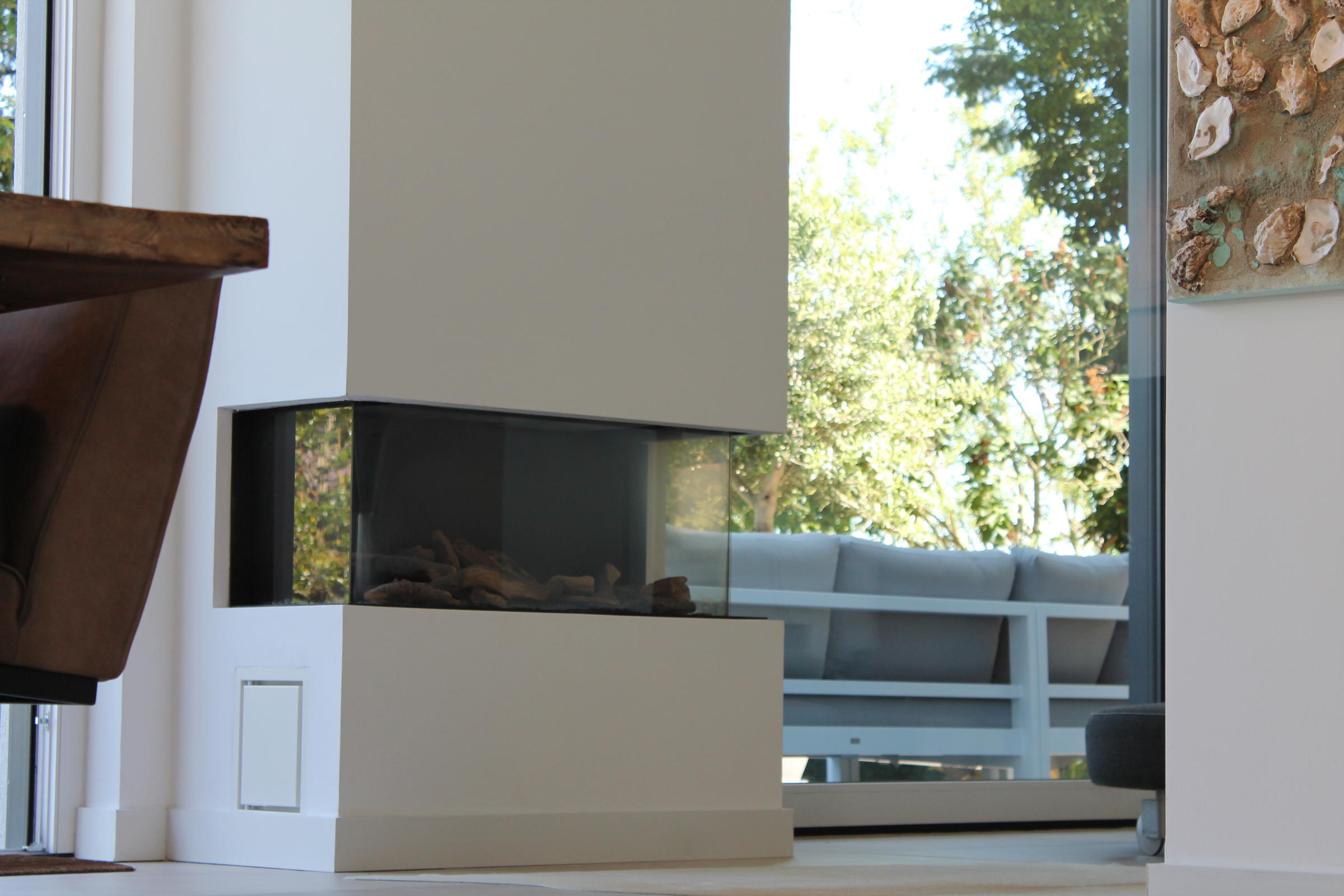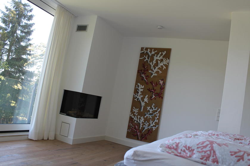 Zur besonderen Ausstattung des Schlafzimmers gehören Badewanne, Gaskamin und bodentiefe Fenster (auch Hebe-Schiebeanlagen) mit atemberaubender Aussicht auf den Sonnenuntergang. Außerdem hat das architektonisch reizvolle Haus eine zweite Küche, drei Badezimmer, zwei Arbeitszimmer, ein Kinderzimmer, ein Gästezimmer und einen Waschraum. Natur-, Weißtöne und robustes Ulmenholz sind Ausstattungsmerkmale im Innenbereich. Die Besitzerin ist Künstlerin. Ihre Kunstwerke hängen im ganzen Haus.