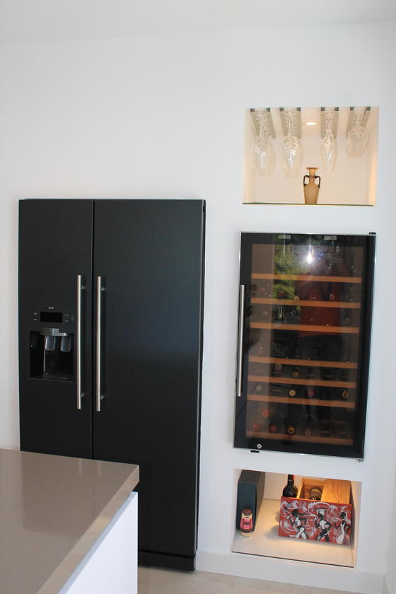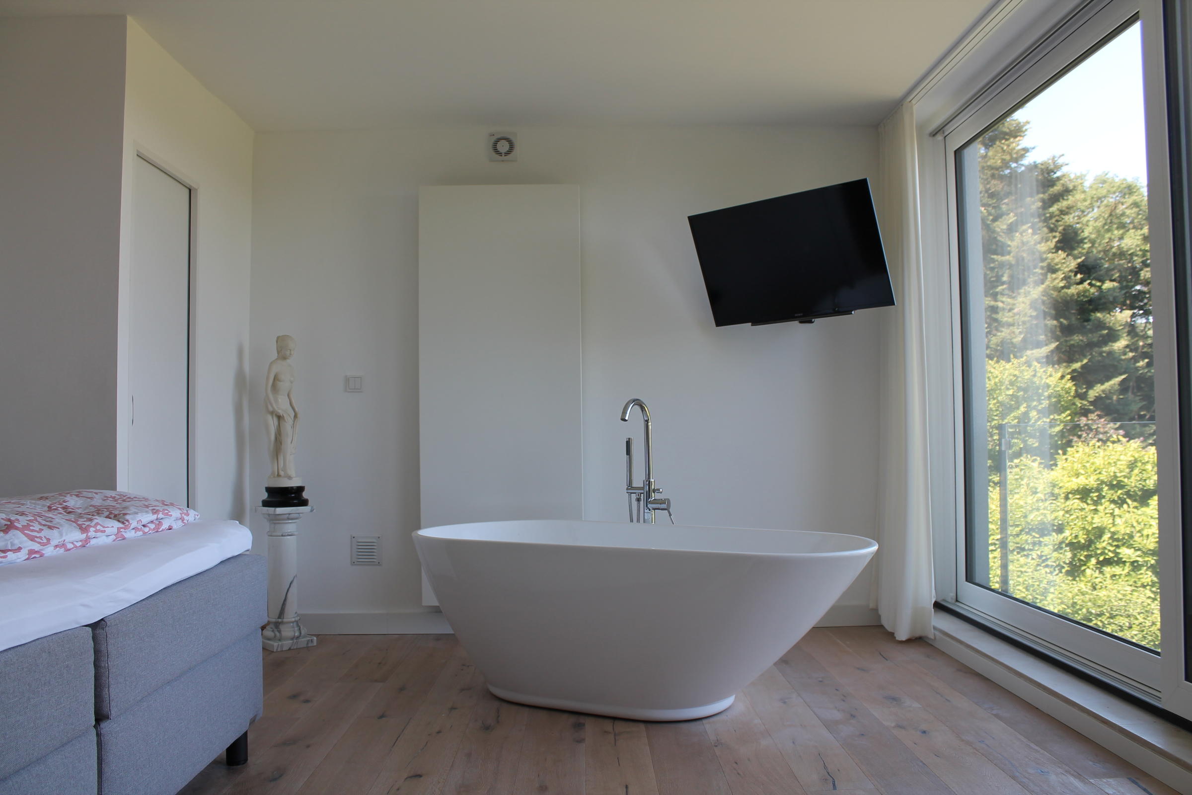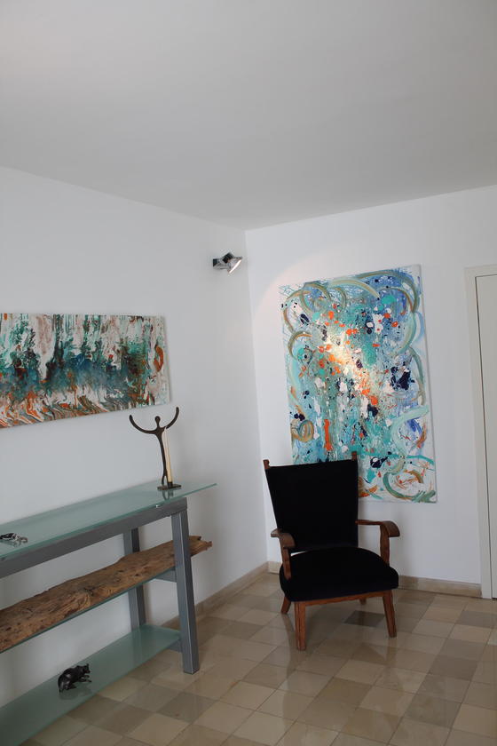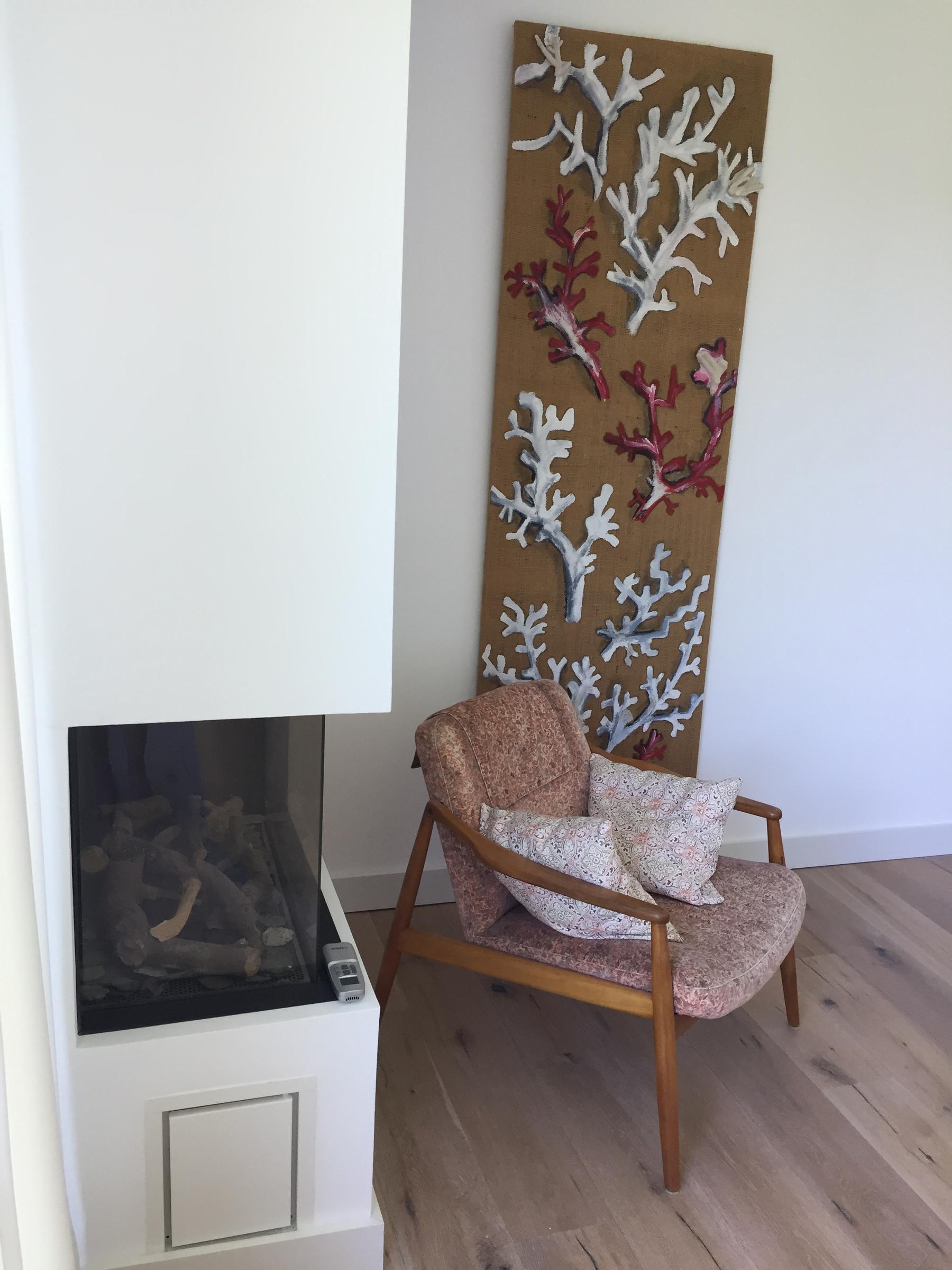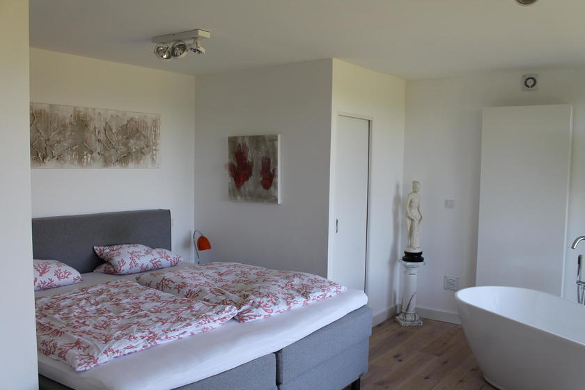 Zur besonderen Ausstattung des Schlafzimmers gehören Badewanne, Gaskamin und bodentiefe Fenster (auch Hebe-Schiebeanlagen) mit atemberaubender Aussicht auf den Sonnenuntergang. Außerdem hat das architektonisch reizvolle Haus eine zweite Küche, drei Badezimmer, zwei Arbeitszimmer, ein Kinderzimmer, ein Gästezimmer und einen Waschraum. Natur-, Weißtöne und robustes Ulmenholz sind Ausstattungsmerkmale im Innenbereich. Die Besitzerin ist Künstlerin. Ihre Kunstwerke hängen im ganzen Haus.