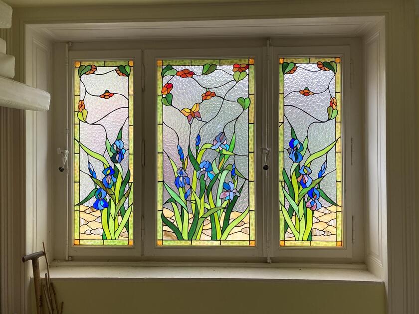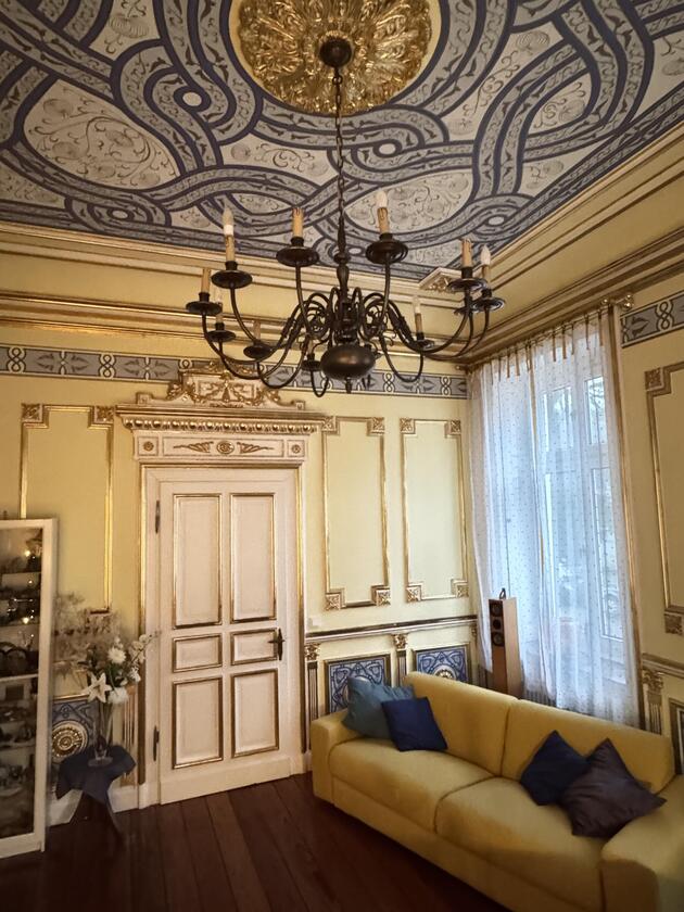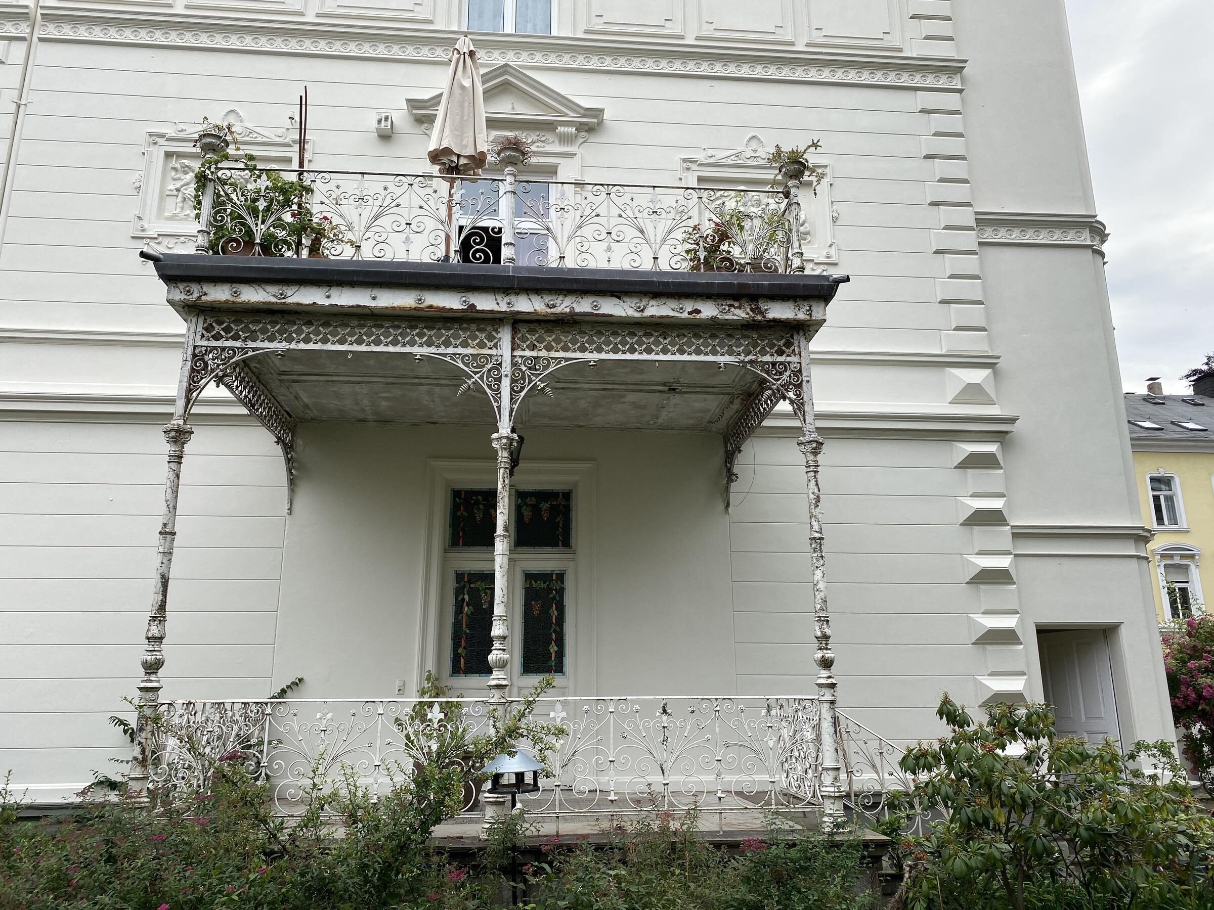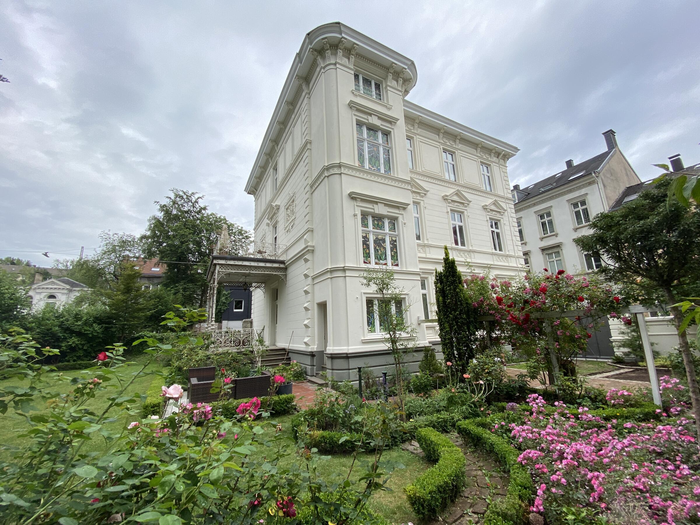 Bei dieser Wohnung in Nordrhein-Westfalen handelt es sich um das gesamte Parterre sowie die überdachte Veranda einer Fabrikantenvilla aus der Gründerzeit. Die Villa umgibt ein großzügiger straßenabgewandter Garten, in dem ein hölzernes originales Kutschenhaus aus der Zeit 1878 steht. Das Haupthaus steht unter Denkmalschutz, seine Fassade ist 2021 komplett saniert worden. Betritt man durch den üppig verzierten Hauseingang die Wohnung, so tritt man in einen langen Flur mit für die Zeit typischen Musterkacheln am Boden, von dem aus linker Hand Gäste-, Ess- und Wohnzimmertür abgehen. Diese drei Räume sind ausserdem jeweils miteinander verbunden, was durch alle Räume interessante Durchblicke ermöglicht. Küche, Schlafzimmer und Bad liegen gegenüber und haben jeweils ihren Fensterblick in den Garten. Die gesamten Wände der Wohnung sind reichhaltig mit Blattgold, Stuckelementen und Wandmalereien verziert. Jeden Raum schmückt dabei eine andere, individuelle und sehr detailreiche Wandbemalung und Deckenornamentik. Lassen die Motive im Schlafzimmer und Bad die Malerei der Wiener Sezession um die Jahrhundertwende anklingen, so zitieren andere Räume teils Motive des Pariser Impressionismus, Klassizismus oder des Orients. Die Einrichtung der Wohnung mischt antike mit modernen Möbeln, teils Designerstücken, die Deckenlampen sind dem jeweiligen Charakter des Raumes individuell angepasst. Zu der Wohnung gehört ein abschließbarer Kellerraum von ca. 25 m² der gegebenenfalls auch als Zwischenlager für Equipment zu nutzen wäre.