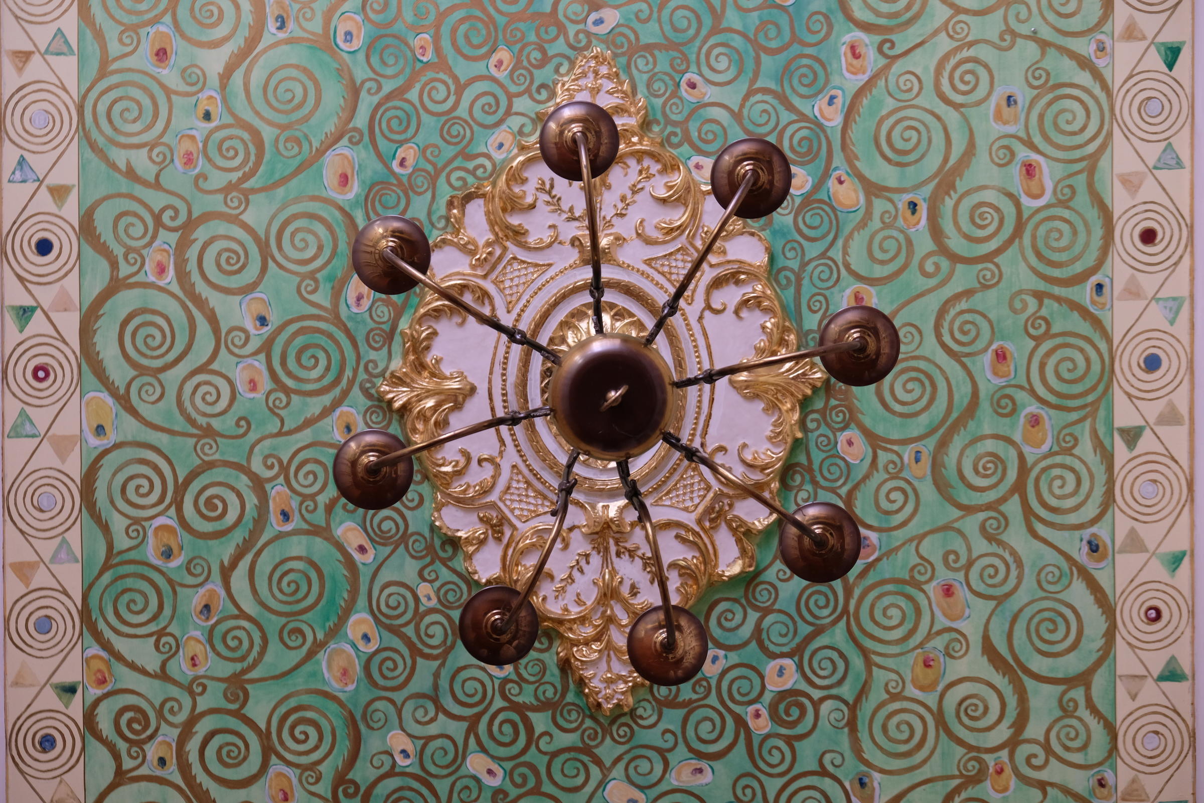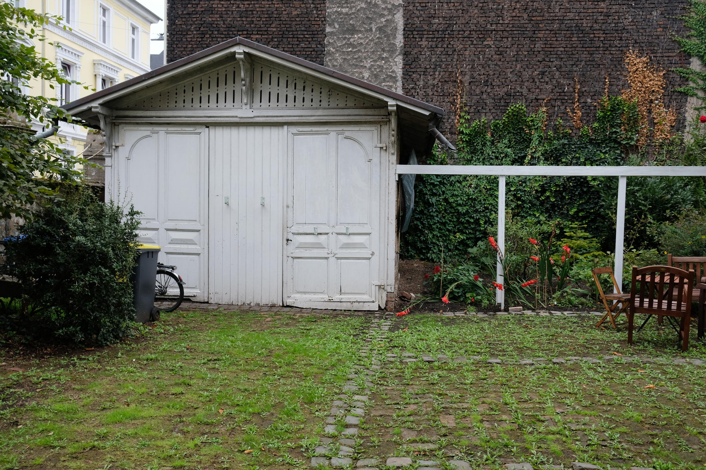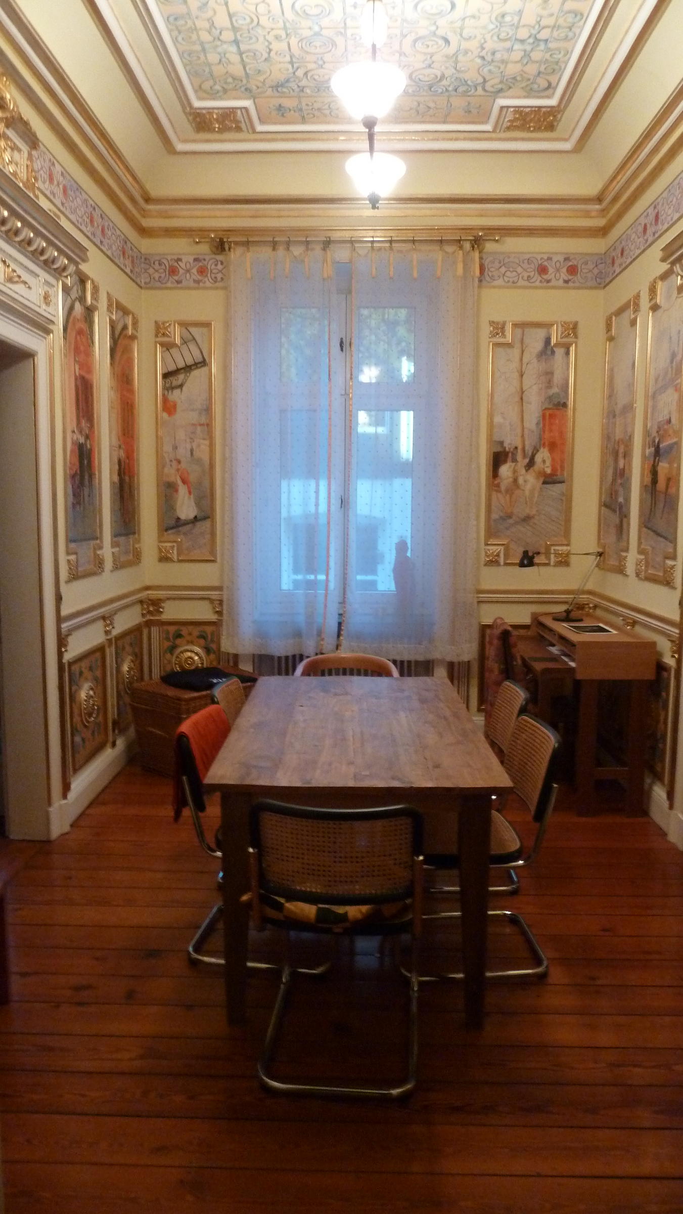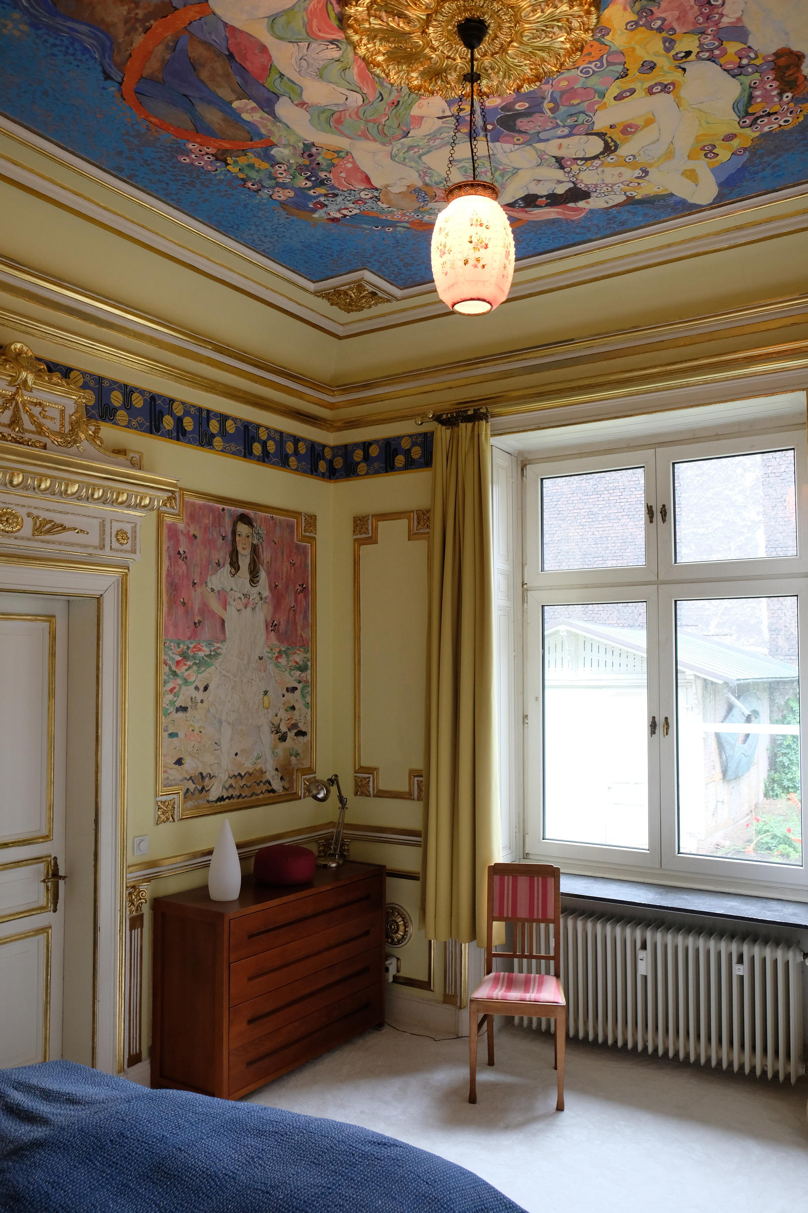 Bei dieser Wohnung in Nordrhein-Westfalen handelt es sich um das gesamte Parterre sowie die überdachte Veranda einer Fabrikantenvilla aus der Gründerzeit. Die Villa umgibt ein großzügiger straßenabgewandter Garten, in dem ein hölzernes originales Kutschenhaus aus der Zeit 1878 steht. Das Haupthaus steht unter Denkmalschutz, seine Fassade sieht aber durch einen ehemaligen flächendeckenden Efeubewuchs heute verwunschen aus. Betritt man durch den üppig verzierten Hauseingang die Wohnung, so tritt man in einen langen Flur mit für die Zeit typischen Musterkacheln am Boden, von dem aus linker Hand Gäste-, Ess- und Wohnzimmertür abgehen. Diese drei Räume sind ausserdem jeweils miteinander verbunden, was durch alle Räume interessante Durchblicke ermöglicht. Küche, Schlafzimmer und Bad liegen gegenüber und haben jeweils ihren Fensterblick in den Garten. Die gesamten Wände der Wohnung sind reichhaltig mit Blattgold, Stuckelementen und Wandmalereien verziert. Jeden Raum schmückt dabei eine andere, individuelle und sehr detailreiche Wandbemalung und Deckenornamentik. Lassen die Motive im Schlafzimmer und Bad die Malerei der Wiener Sezession um die Jahrhundertwende anklingen, so zitieren andere Räume teils Motive des Pariser Impressionismus, Klassizismus oder des Orients. Die Einrichtung der Wohnung mischt antike mit modernen Möbeln, teils Designerstücken, die Deckenlampen sind dem jeweiligen Charakter des Raumes individuell angepasst. Im Wohnzimmer befindet sich ein Flügel der Marke Steinway im viktorianischen Stil , Baujahr 1876. Zu der Wohnung gehört ein abschließbarer Kellerraum von ca. 25 m² der gegebenenfalls auch als Zwischenlager für Equipment zu nutzen wäre.
