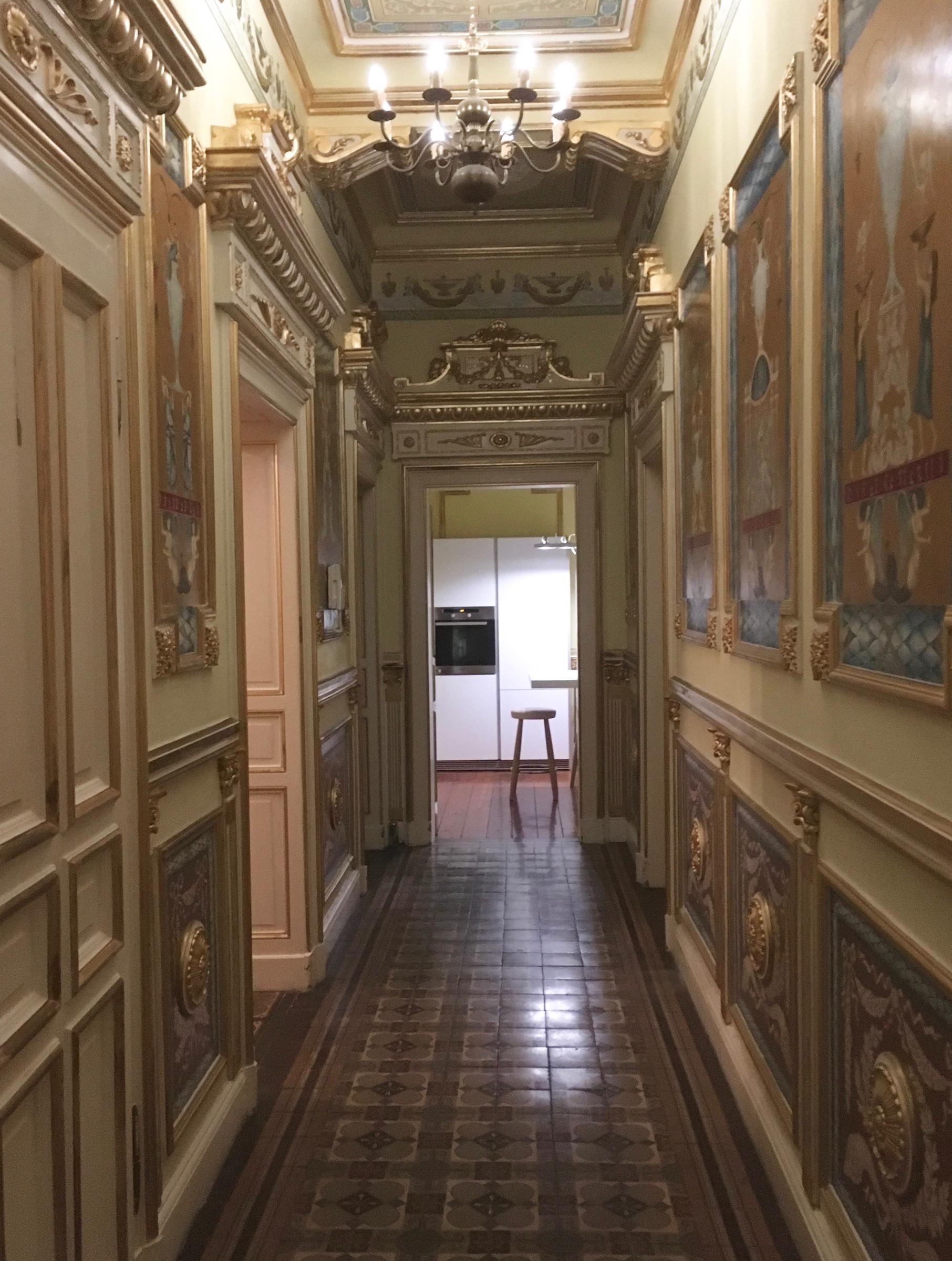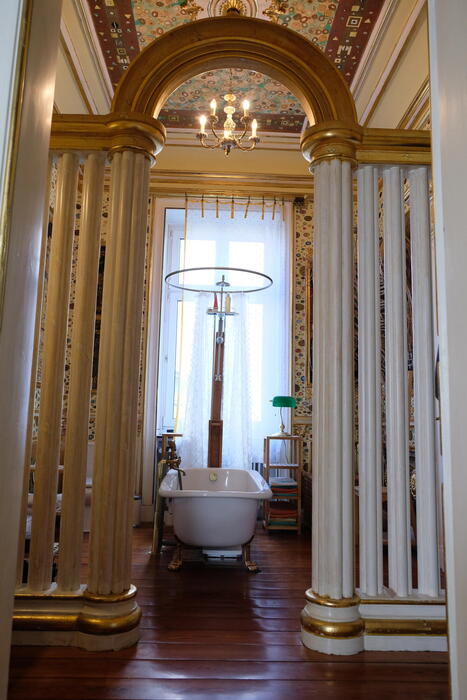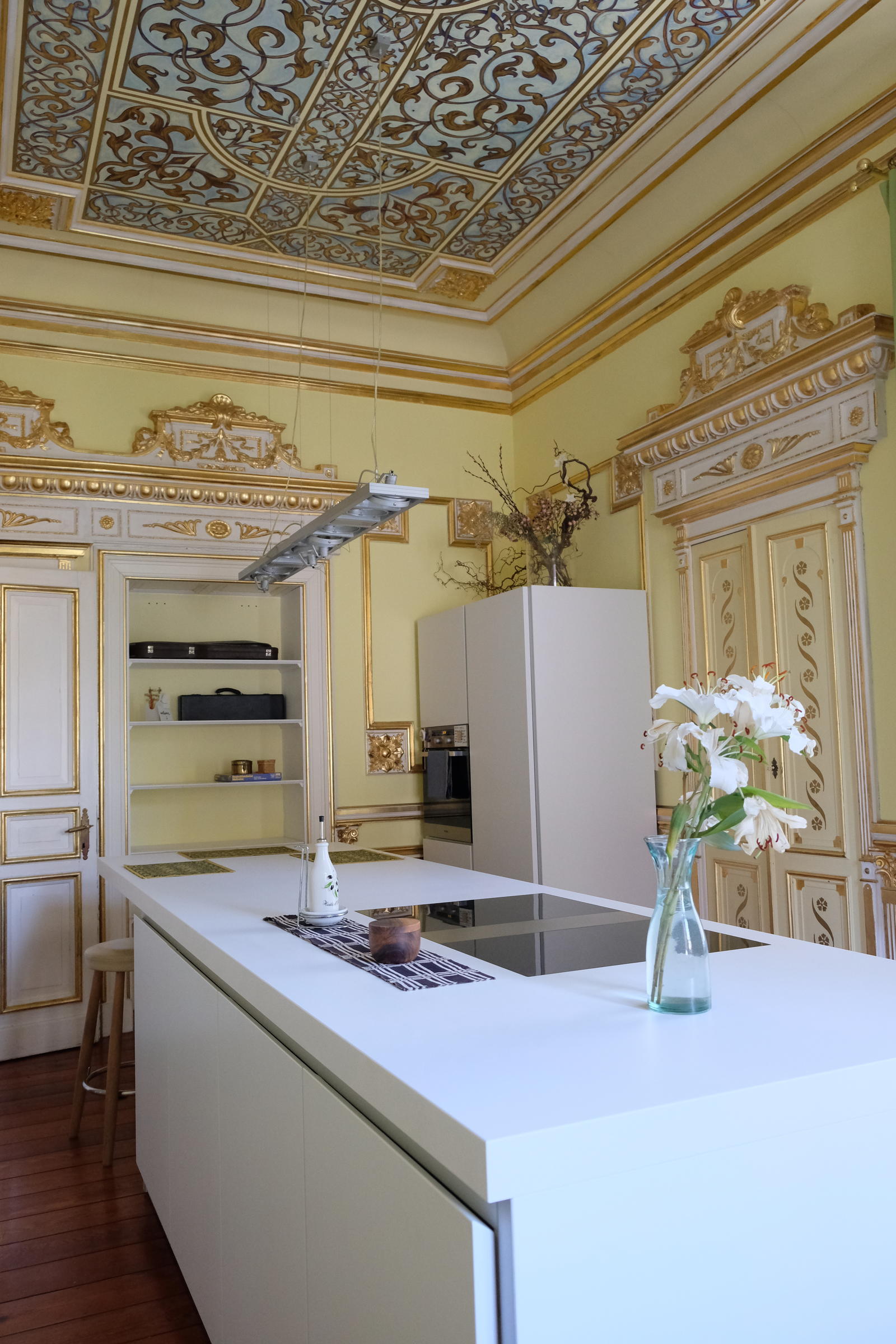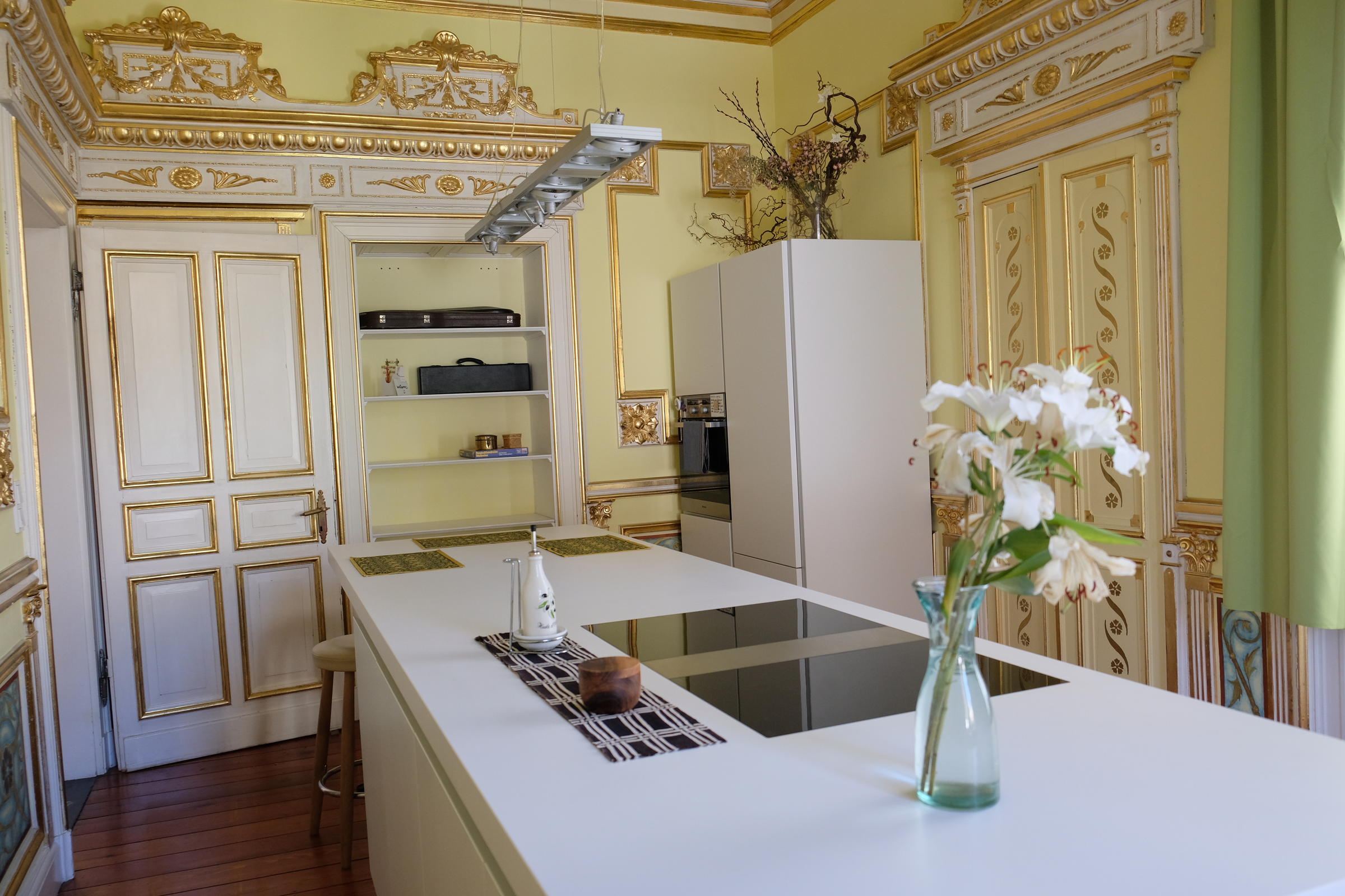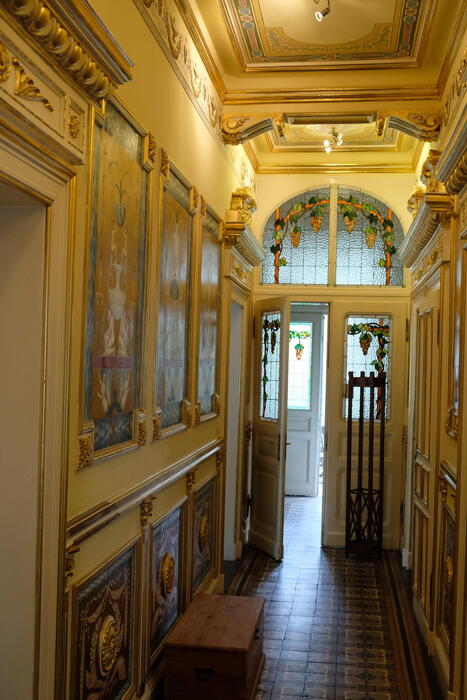 Bei dieser Wohnung in Nordrhein-Westfalen handelt es sich um das gesamte Parterre sowie die überdachte Veranda einer Fabrikantenvilla aus der Gründerzeit. Die Villa umgibt ein großzügiger straßenabgewandter Garten, in dem ein hölzernes originales Kutschenhaus aus der Zeit 1878 steht. Das Haupthaus steht unter Denkmalschutz, seine Fassade sieht aber durch einen ehemaligen flächendeckenden Efeubewuchs heute verwunschen aus. Betritt man durch den üppig verzierten Hauseingang die Wohnung, so tritt man in einen langen Flur mit für die Zeit typischen Musterkacheln am Boden, von dem aus linker Hand Gäste-, Ess- und Wohnzimmertür abgehen. Diese drei Räume sind ausserdem jeweils miteinander verbunden, was durch alle Räume interessante Durchblicke ermöglicht. Küche, Schlafzimmer und Bad liegen gegenüber und haben jeweils ihren Fensterblick in den Garten. Die gesamten Wände der Wohnung sind reichhaltig mit Blattgold, Stuckelementen und Wandmalereien verziert. Jeden Raum schmückt dabei eine andere, individuelle und sehr detailreiche Wandbemalung und Deckenornamentik. Lassen die Motive im Schlafzimmer und Bad die Malerei der Wiener Sezession um die Jahrhundertwende anklingen, so zitieren andere Räume teils Motive des Pariser Impressionismus, Klassizismus oder des Orients. Die Einrichtung der Wohnung mischt antike mit modernen Möbeln, teils Designerstücken, die Deckenlampen sind dem jeweiligen Charakter des Raumes individuell angepasst. Im Wohnzimmer befindet sich ein Flügel der Marke Steinway im viktorianischen Stil , Baujahr 1876. Zu der Wohnung gehört ein abschließbarer Kellerraum von ca. 25 m² der gegebenenfalls auch als Zwischenlager für Equipment zu nutzen wäre.