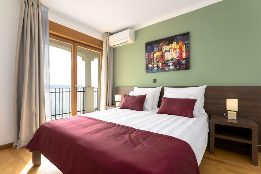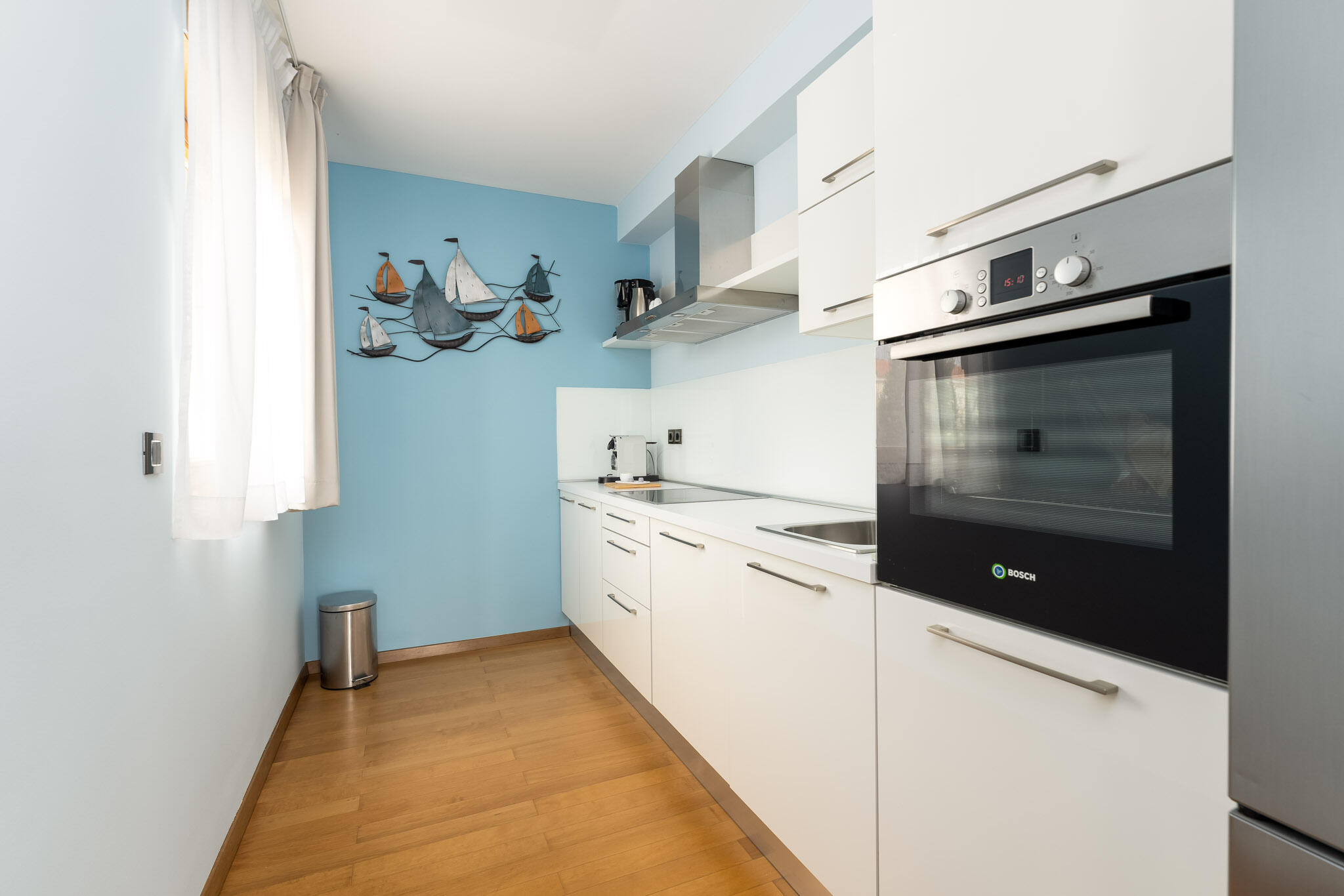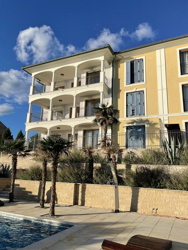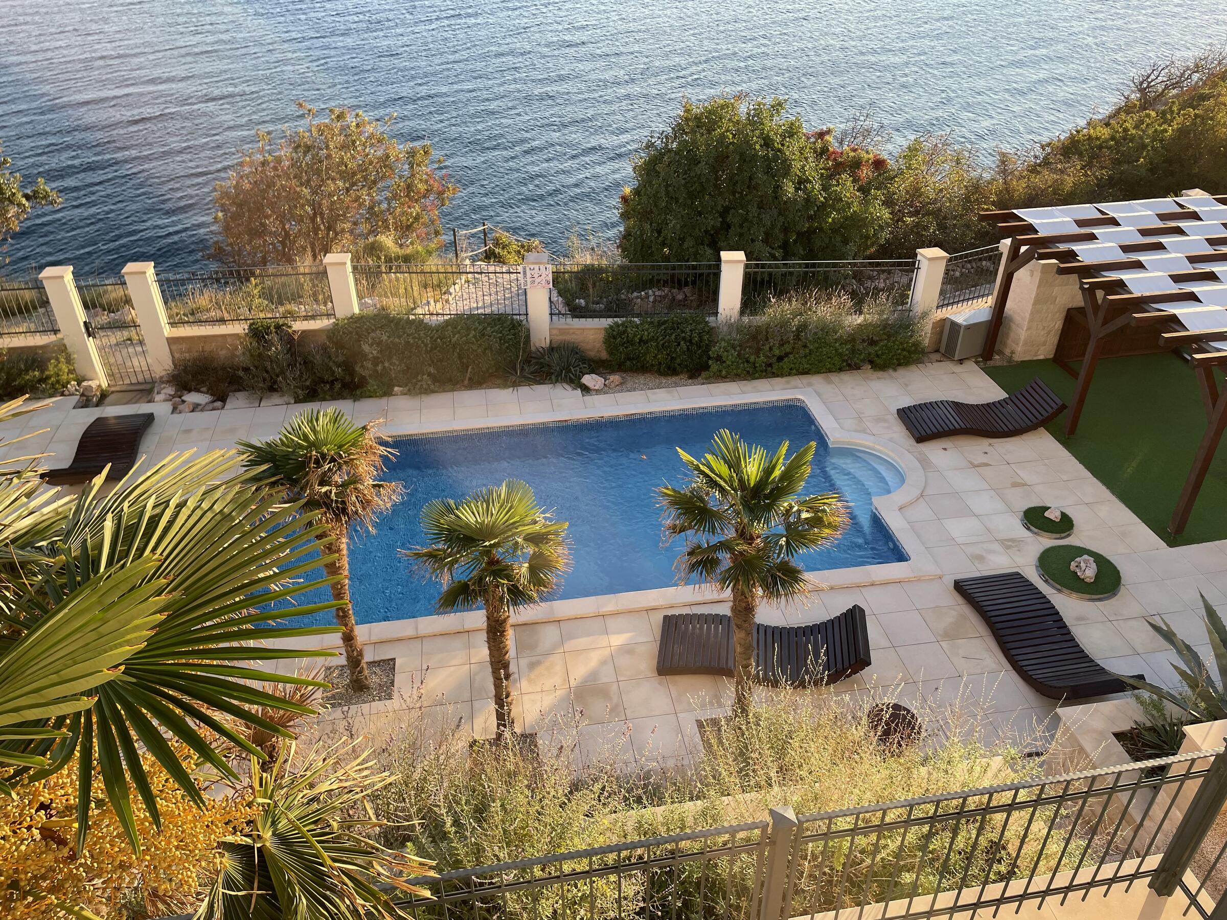 Die helle Ferienwohnung befindet sich im 1. Obergeschoss eines zweistöckigen Hauses. Alle Räume sind vollständig möbliert. Neben einem großen Wohn- und Esszimmer und einer Küche stehen 2 separate Schlafzimmer, 2 Bäder en Suite, ein Gäste-WC und ein großzügiger Eingangsbereich zur Verfügung. Die bodentiefen Fenster im lichtdurchfluteten Wohnzimmer und den Schlafzimmern können mit Vorhängen oder elektronischen Rollläden abgedunkelt werden. Vom großzügigen Balkon hat man einen unverbauten Blick auf das Meer. Dazwischen befindet sich ein Swimmingpool in einer gepflegten Gartenanlage. Zum Lagern von Equipment kann ein ca. 50 m² großer Kellerraum genutzt werden. Vor dem Wohnhaus stehen 5 Pkw-Stellplätze zur Verfügung. Auf Wunsch können auch die Wohnungen im Erdgeschoss und 2. OG angemietet werden.
