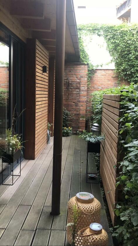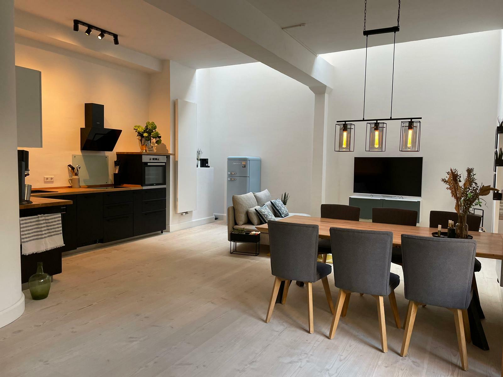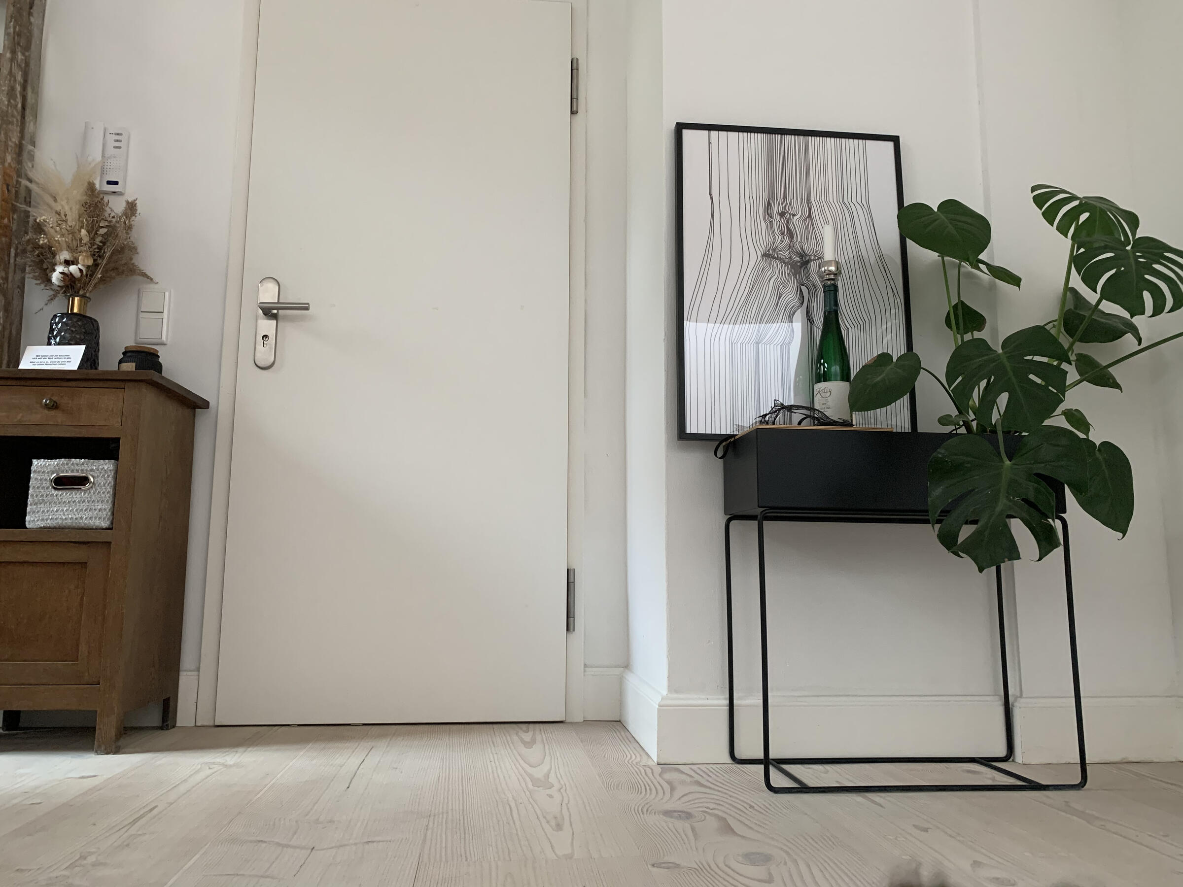Meine lichtdurchflutete Architektenwohnung mit minimalistischer Einrichtung und besonderer Aufteilung hat eine Fläche von ca. 80 m². Im Schlafzimmer ist eine freistehende Badewanne vor einer großen Glasfront platziert. Auch die Regendusche ist in das Schlafzimmer integriert. Die Wohnung hat, außer zum WC, keine Türen. Mit bis zu 5 m hohen Decken und einem Holzanbau mit wunderschönen Balken wirkt alles offen und leicht. In der gesamten Wohnung ist ein Echtholzparkett (Norwegische Eiche, geweißt) verlegt. Zur Wohnung gehört ebenfalls eine Terrasse mit verschiedenen Pflanzen und einer Lounge.