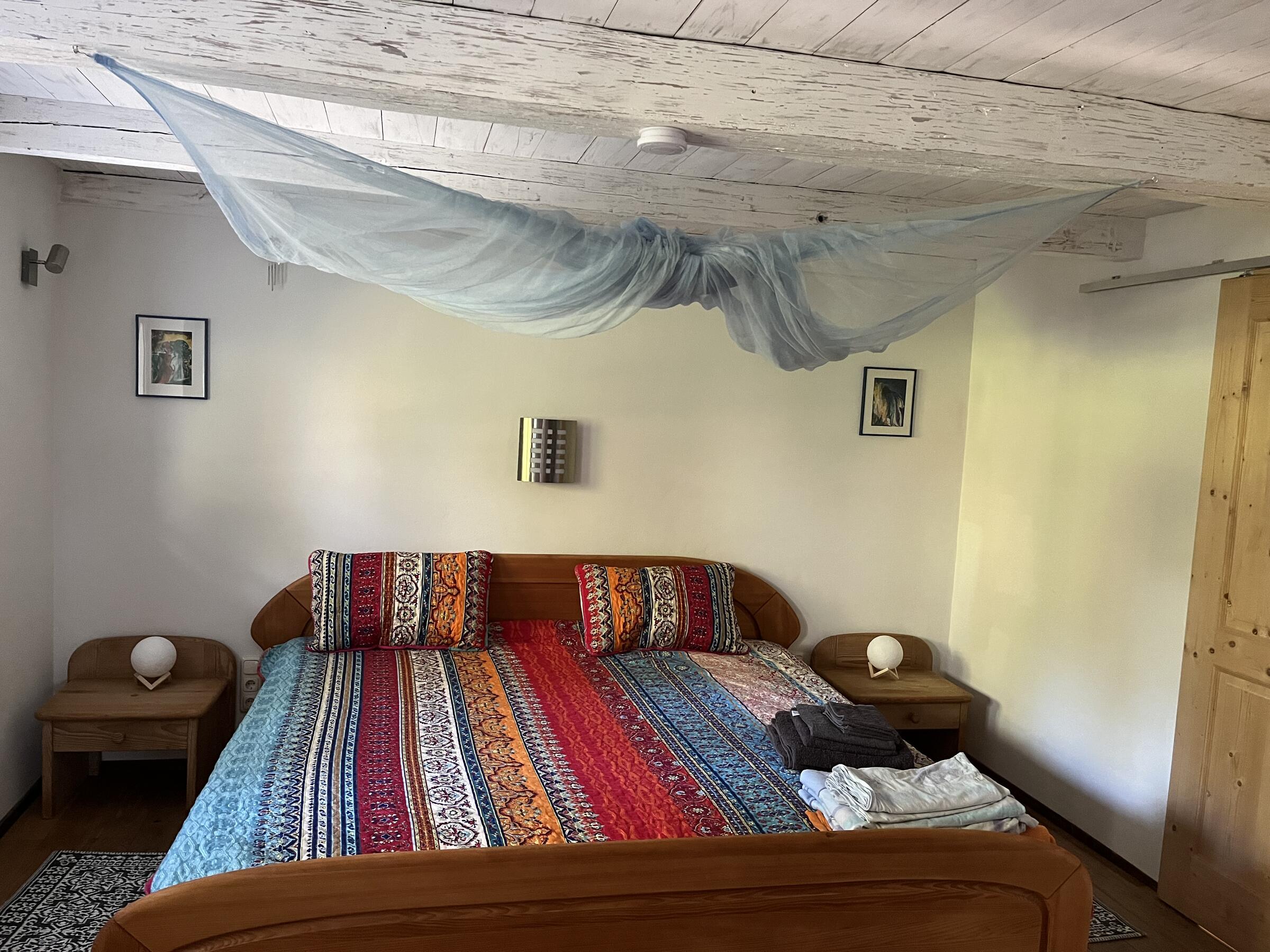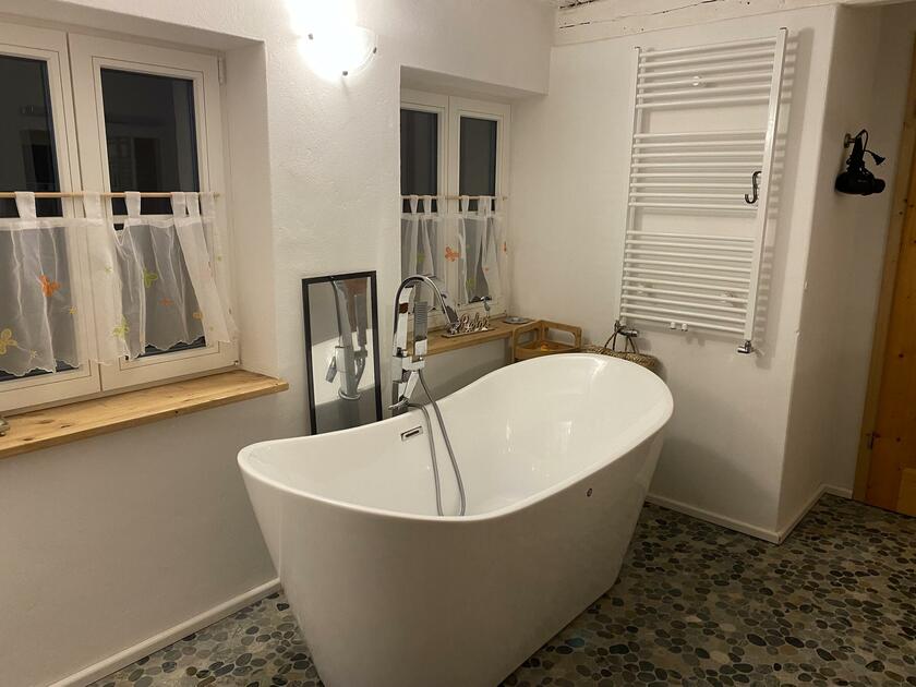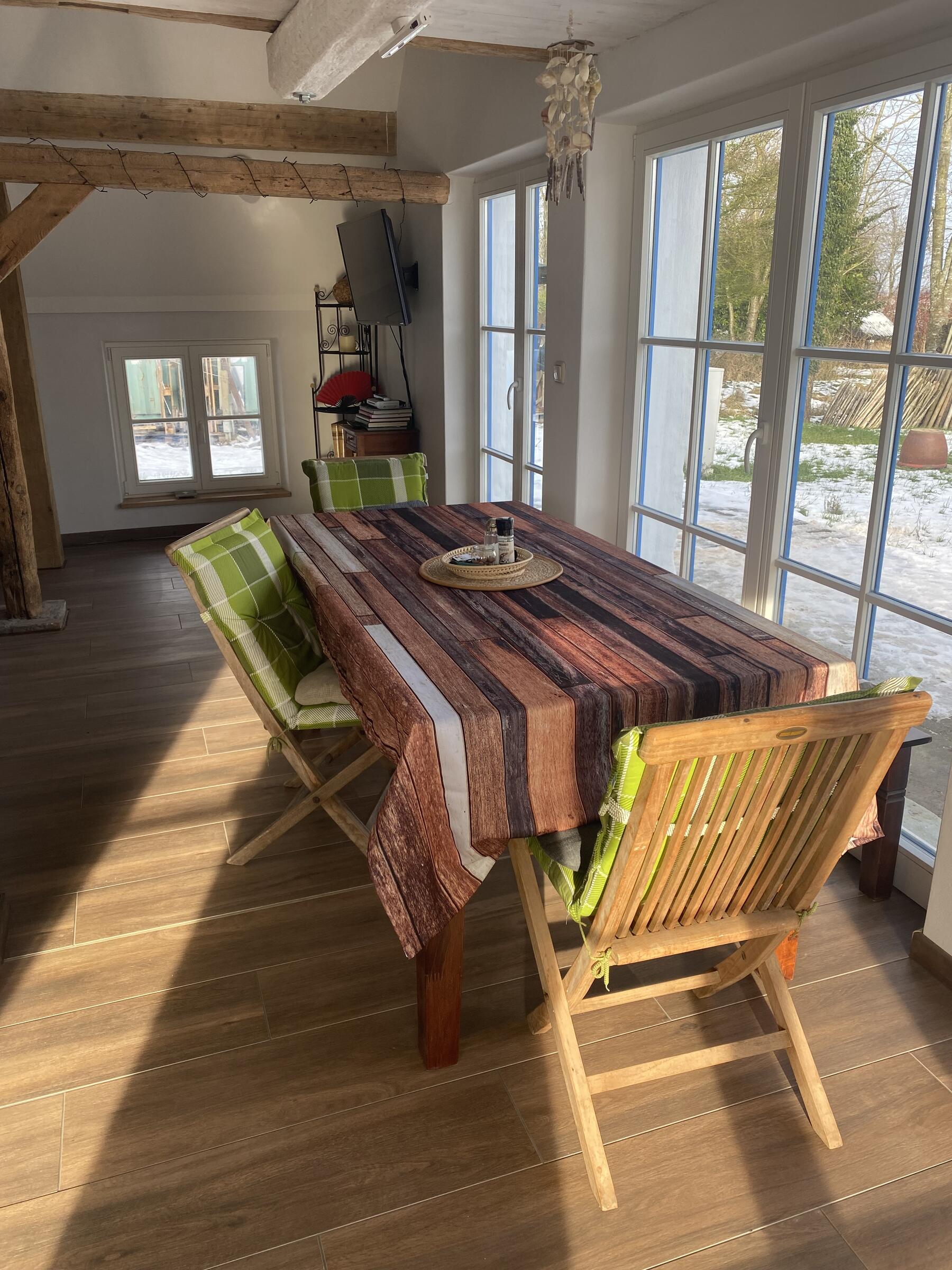 Wir haben das im Jahr 1888 erbaute Bauernhaus kernsaniert und zu einem Ferienhaus umgewandelt. Die Räume sind vollständig möbliert. Der lichtdurchflutete Wohn- und Essbereich ist offen gestaltet und bietet direkten Zugang zur Wohnküche. Im Wohnbereich befindet sich auch ein Kamin. Das Badezimmer im Erdgeschoss ist mit einer Whirlpool-Badewanne und Dusche ausgestattet. Das Obergeschoss bietet eine offene Empore und ein Dachstudio. Die Fenster sind teilweise mit Plissees ausgestattet. Im Außenbereich steht ebenfalls ein großes und eingezäuntes Wiesengrundstück zur Verfügung.