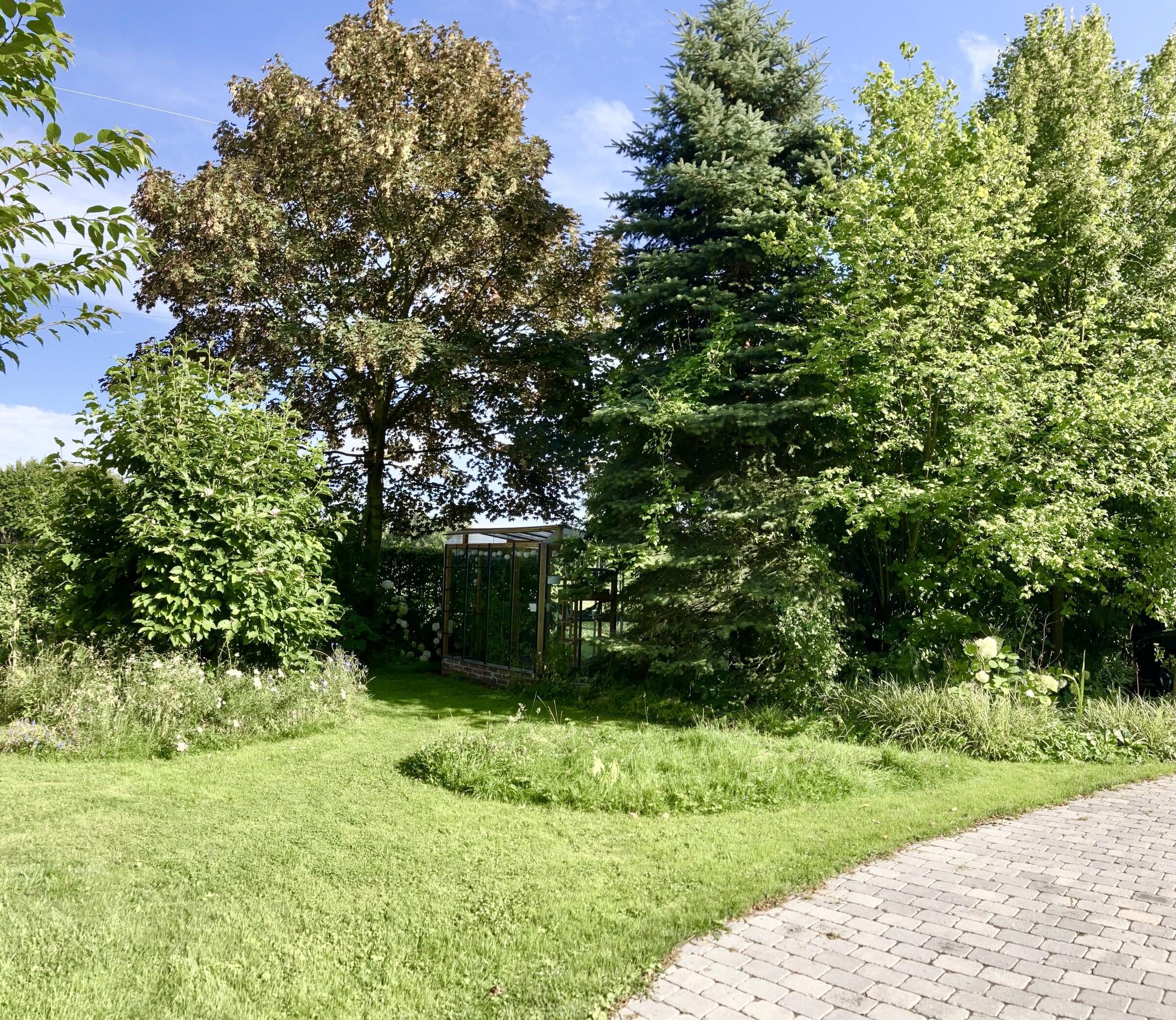 Im Außenbereich stehen die (Kies-)Auffahrt, der gepflasterte Hof und der Garten (optional mit Kinder-Spielbereich, in Abhängigkeit von der Jahreszeit auch mit aktivem Nutzgarten/Gemüseanbau) für Aufnahmen zur Verfügung. Gepflasterte Wege im vorderen Bereich und Kieswege seitlich neben und hinter dem Haus, durch die der im Sommer herrlich blühende Garten in Teilbereiche untergliedert wird, verleihen ihm seinen parkähnlichen Charakter. Das Grundstück wird seitlich durch dichten Baumbestand und einen kleinen, eingewachsenen Bachlauf begrenzt, hinter dem Haus erstreckt sich die Weide des benachbarten Landwirts. Die Gartengestaltung ist gepflegt mit ursprünglichem Charakter; im Sommer verbleiben Teile der Rasenfläche als Blühwiesen ungemäht.