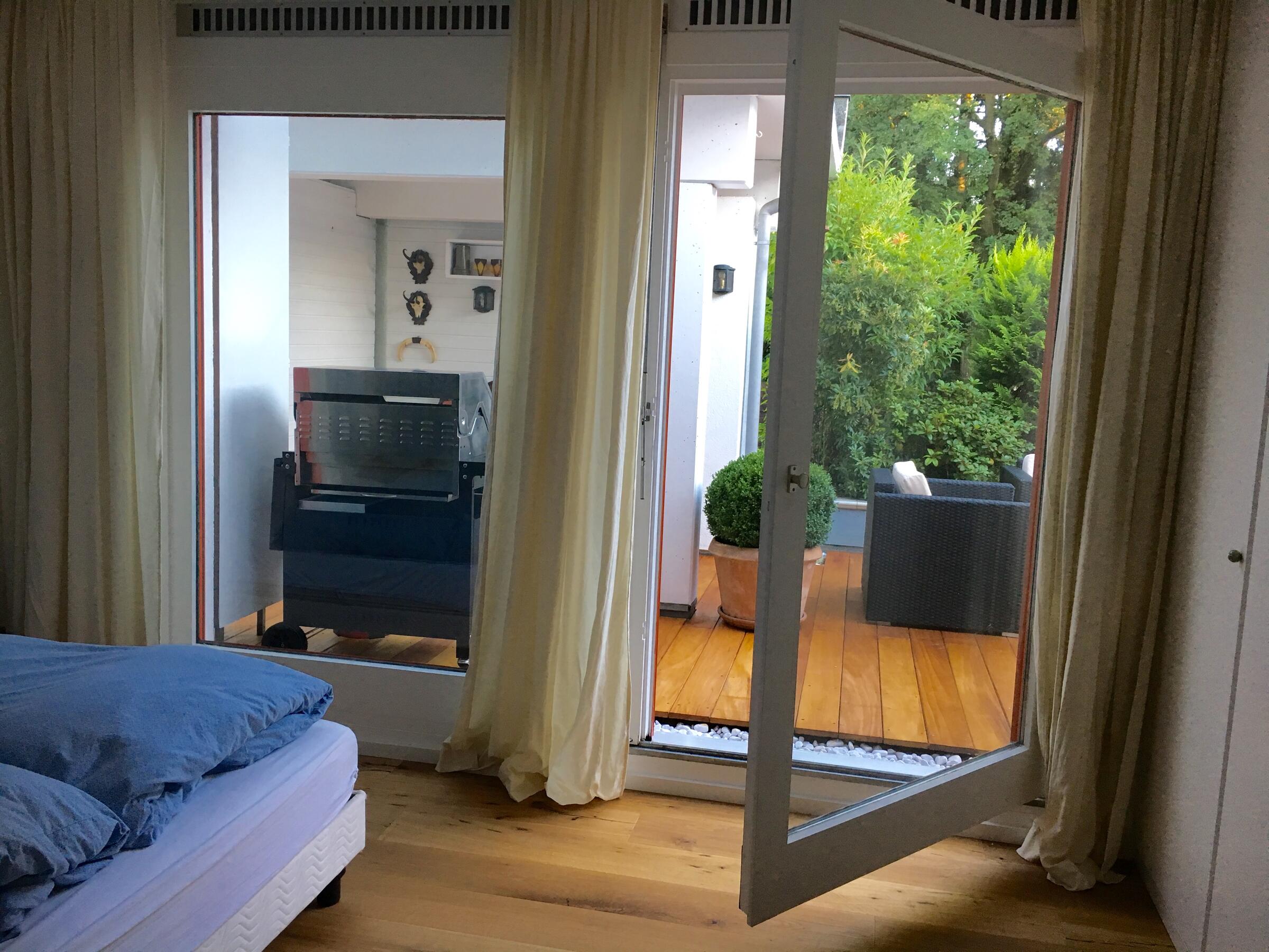 Unsere Wohnung ist im Jahr 1969 erbaut worden und mittlerweile dank ihrem raffinierten Baustil sogar denkmalgeschützt. Die Wohnung ist voll eingerichtet und die Möbel lassen sich bei Bedarf auch gut verschieben. Die Besonderheit an der Wohnung ist ganz bestimmt das großzügige, helle Wohnzimmer mit sowie die große und nicht einsehbare bepflanzte Terrasse, die teilweise sogar überdacht ist. Einzigartig ist auch, dass man auf einer Ebene von drei Zimmern Zugang zur Terrasse hat. Durch die Lage und den Sonnenverlauf ist die Wohnung sehr hell und lichtdurchflutet. Die Anlage selbst ist in ein parkähnliches Umfeld eingebettet, mit zahlreichen Grünflächen und altem Baumbestand. Parkplätze findet man immer direkt vor der Haustüre.