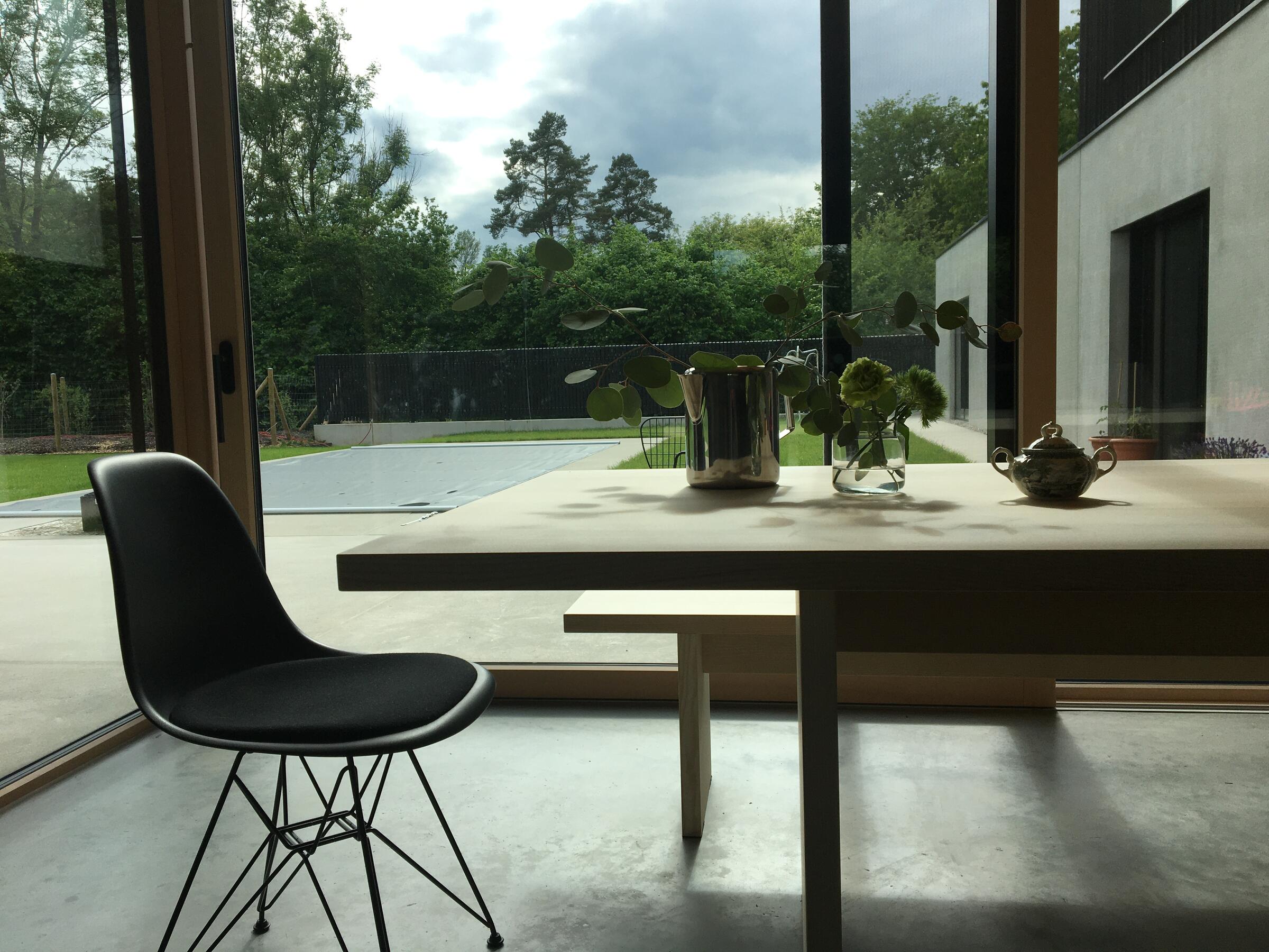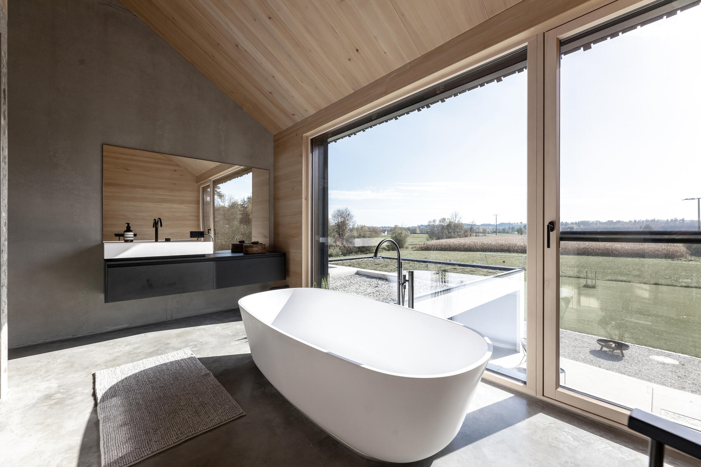 Unser formal bestechendes Anwesen liegt 45 min östlich von München zwischen Wiese, Feld, Wald und Fluß. Es ist eine moderne Interpretation eines traditionellen Hofes verbunden mit der reduzierten Ästhetik und klaren Formensprache des Bauhauses – klar, einheitlich ind hochwertig bis ins kleinste Detail. Ein schwarzer Holzaufbau im Obergeschoss verbindet sich in Form eines T mit 2 Kuben aus Sichtbeton im Erdgeschoss. Die Anordnung ergibt im Norden eine Hoffläche und im Süden eine sichtgeschützte, weitläufige Terrasse mit Außenpool und großzügiger Außenfläche mit ungestörtem Blick auf Wald und Wiese. Die Gartenfläche geht in eine Naturwiese über, die auch genutzt werden kann. Das Haus gibt sich zur Nordseite reserviert und gibt zur Süd-Westseite mit seinen raumtiefen Glasfächen großartige Ausblicke auf die umgebende Natur frei. Durch die großen Fensterfronten ist das ganze Haus sehr lichtdurchflutet und hell (durch Raffstoren kann man aber auch verdunkeln).