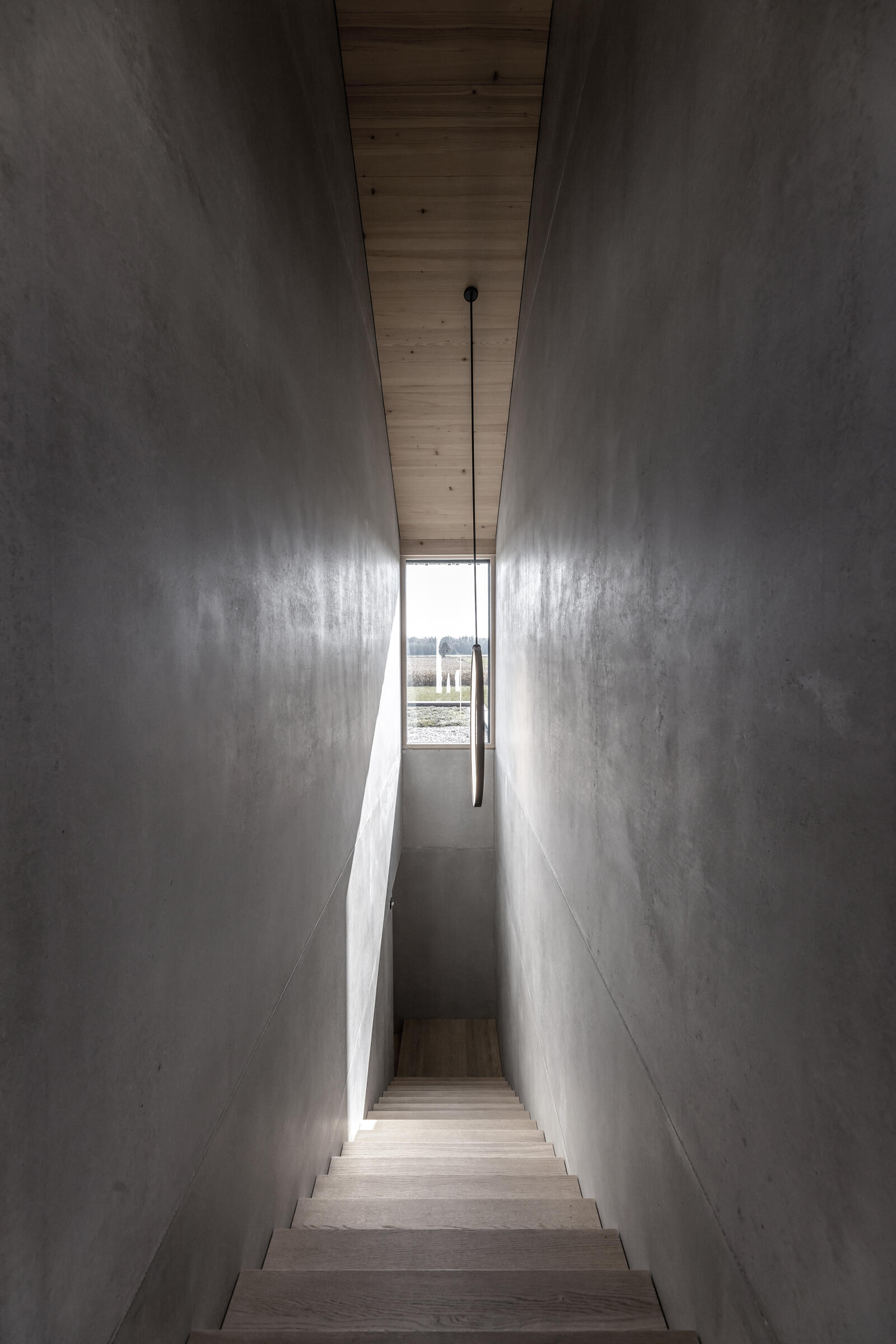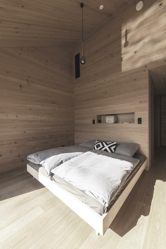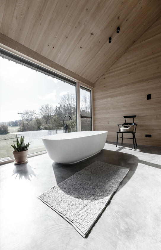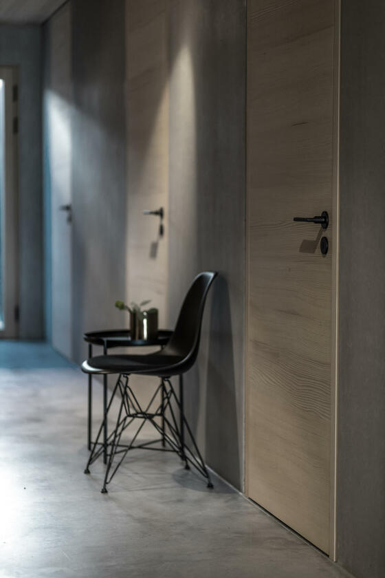 Innen zeichnet sich das Haus durch eine sehr schlichte, aber exquisite Materialauswahl aus: Weißtanne kombiniert mit Sichtbeton und Naturstein, Einbauten in Weißtanne und heller Eiche, schwarze Küche aus Eiche und Naturstein, Badeinbauten und Armaturen aus schwarzem Edelstahl, Mineralguss. Die Farbigkeit ist auf helle Holztöne, schwarz als Kontrast und grau reduziert. Das Beleuchtungskonzept setzt die ausgewählten Designmöbel gekonnt in Szene und ist ebenfalls von einem renommierten Designleuchtenhersteller. Durch die reduzierte Möblierung, die reduzierten Farben und den tollen Lichteinfall eignet sich das Anwesen perfekt für Shootings oder Drehs aller Art, da es die perfekte Bühne für vielfältige Szenen bietet.