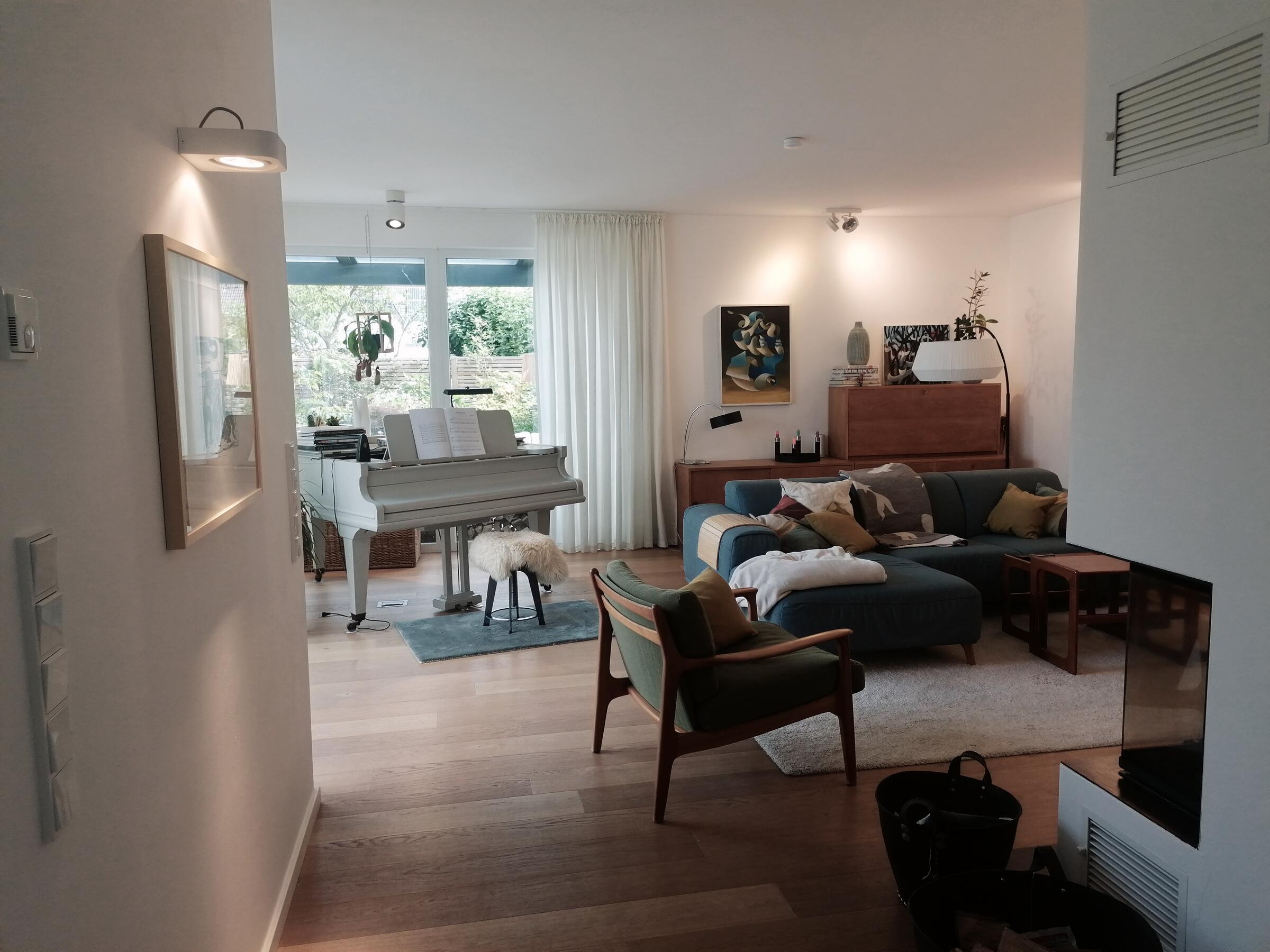 Unser schönes und im Bauhausstil errichtetes Einfamilienhaus verbindet auf 3 Etagen moderne Architektur mit punktuellem Retro-Design. Der offene Wohn- und Essbereich mit Kamin schließt an eine Galerie an, wodurch das gesamte Erdgeschoss hell und luftig ist und die Blicke auf sich zieht. Im Obergeschoss kann man eine charmante, möblierte Dachterrasse mit Bepflanzung begehen. Der gesamte Wohnbereich ist mit individuellen Werken einer Künstlerin aus der Familie gestaltet. Der Garten ist gepflegt und bietet mit 2 Terrassen, eine davon mit Glasdach, die andere mit 8 Meter Markise inklusive Beleuchtung, viele reizvolle Aussichten (Begrünung/Bepflanzung jahreszeitlich variieren). Im Keller gibt es einen Spielraum mit großer Kletterwand sowie einen kleinen Wellnessbereich mit Sauna. Unser Haus befindet sich in einer ruhigen Anliegerstraße mit Einfamilienhausbebauung. Vor dem Objekt finden sich eine Vielzahl von freien Parkplätzen sowie ein großer öffentlicher Parkplatz in unmittelbarer Nähe (ca. 30 m). Die Anbindung an die Autobahnen A1 und A57 sind in ca. 10 min Autofahrzeit zu erreichen.