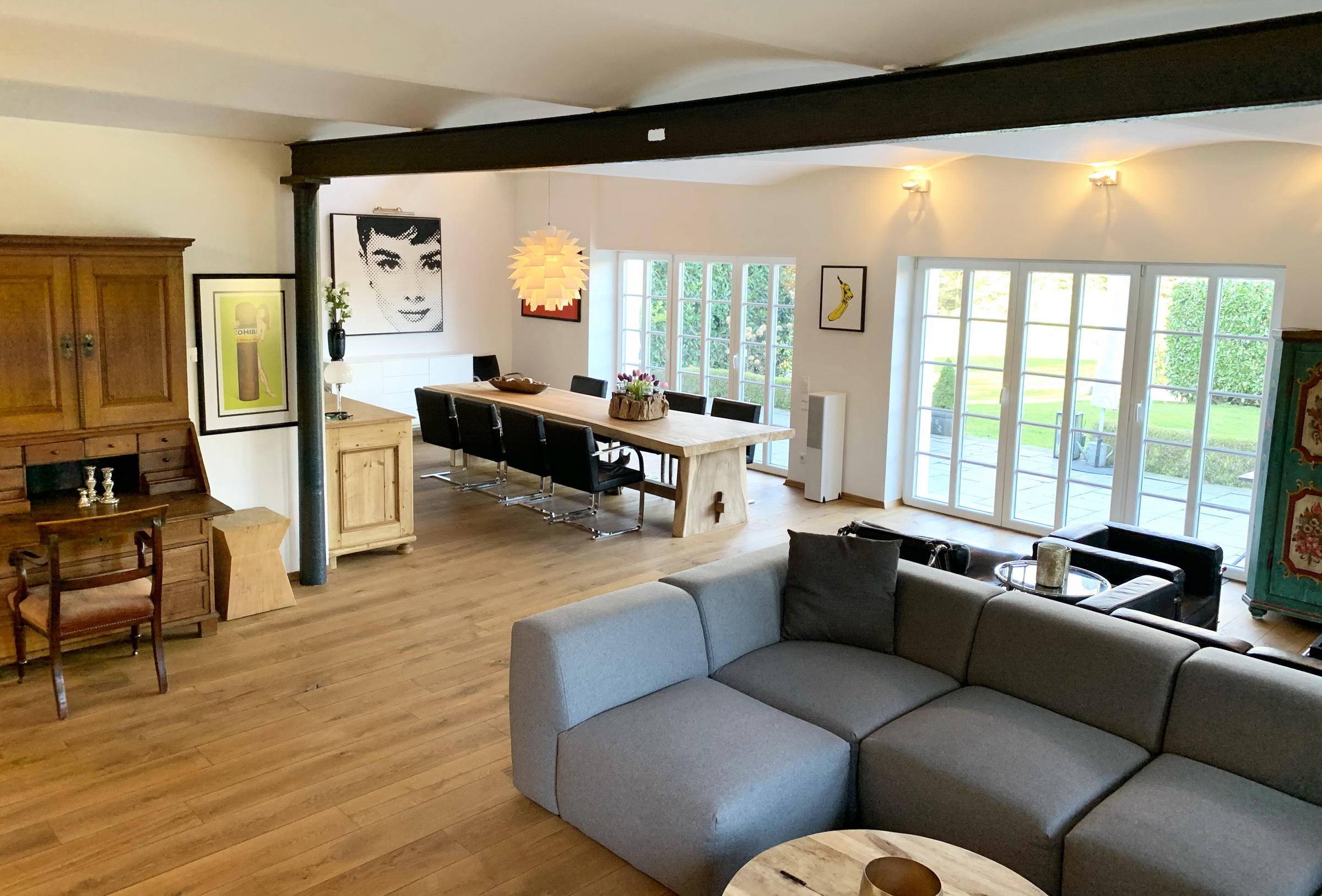 - Wohnzimmer (EG)Fläche: 80 m²Länge: 10 mBreite: 8 mHöhe: 3,5 mmöbliert: ja