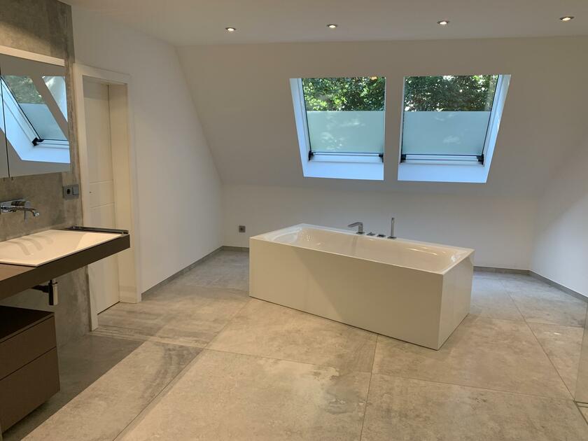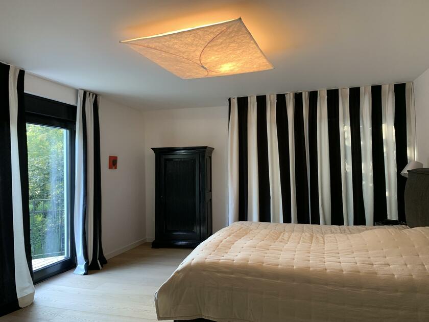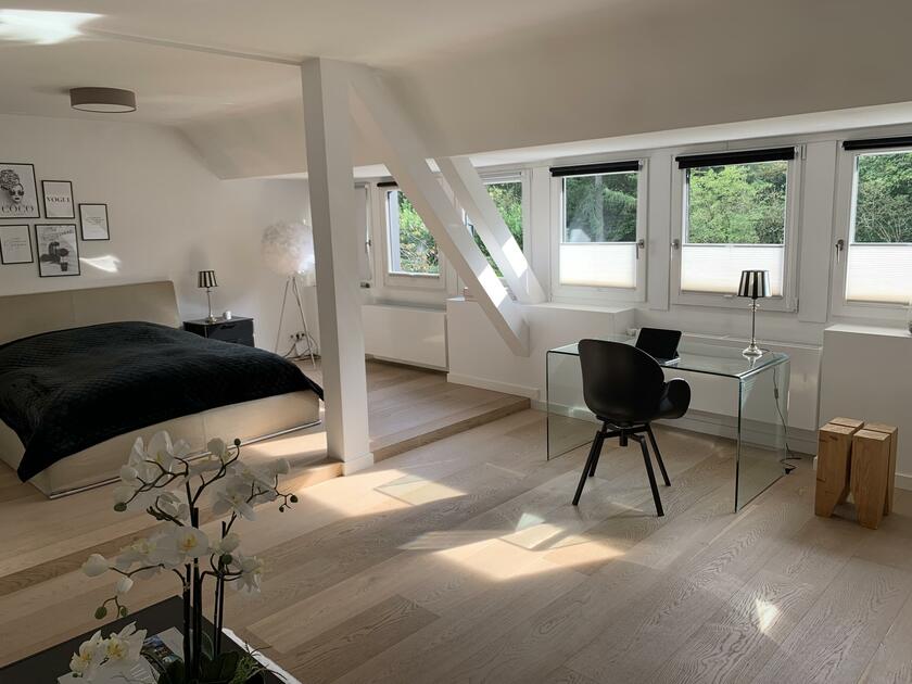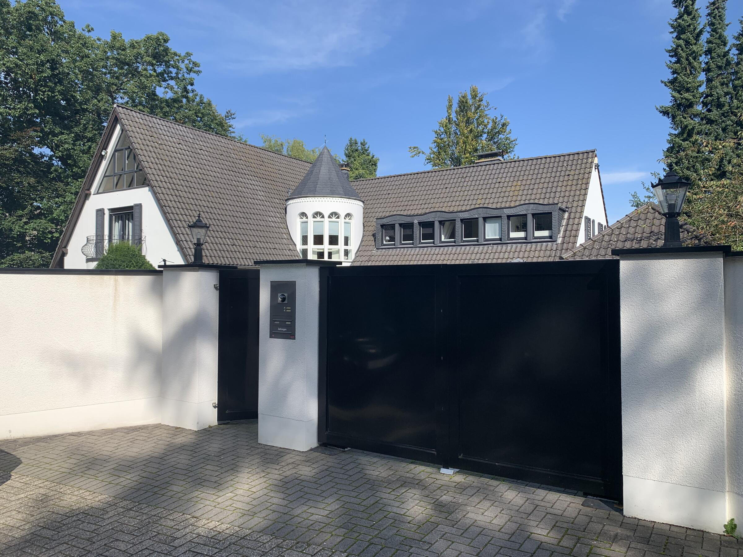 Die Villa befindet sich in Ratingen Hösel, in unmittelbarer Nähe zum Autobahnanschluss in Richtung Düsseldorf und Essen. 350 m² Wohnfläche erstrecken sich auf drei Ebenen, die durchgängig mit hellen Eichendielen verlegt sind. In den vier Bädern befinden sich raumhohe, großformatige Fliesen. Erdige Töne sowie eine klare schwarz- weiß Farbgebung in Kombination mit modernem Design bestimmen den Stil des Hauses und geben ihm Wohlfühlcharakter. Ein großer Fitnessbereich inklusive Sauna, Dusche und WC im Untergeschoss sind von außen zugängig und können neben zwei weiteren Räumen als Maske und Garderobe genutzt werden.